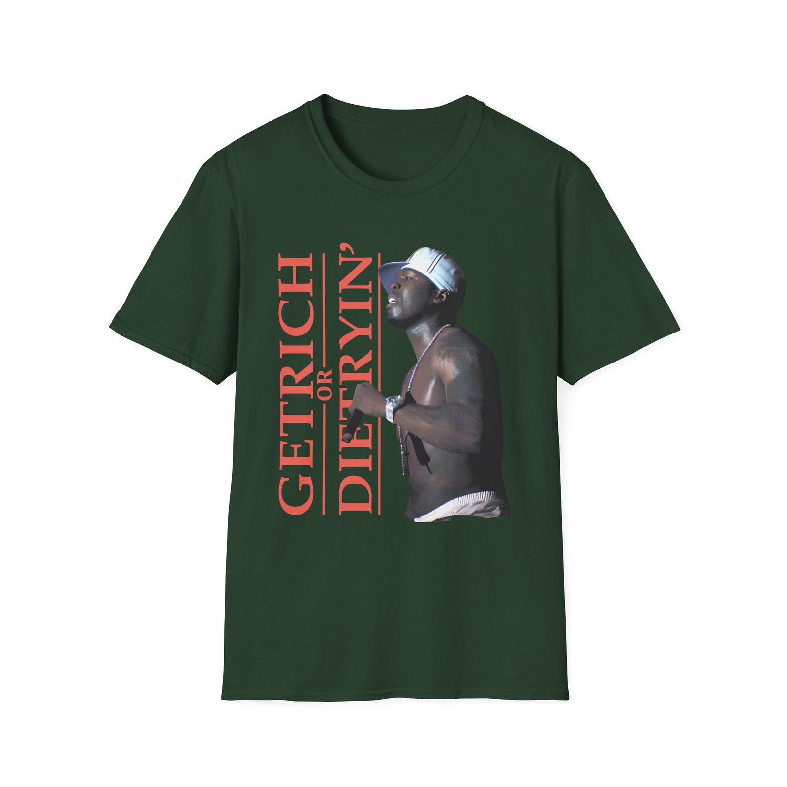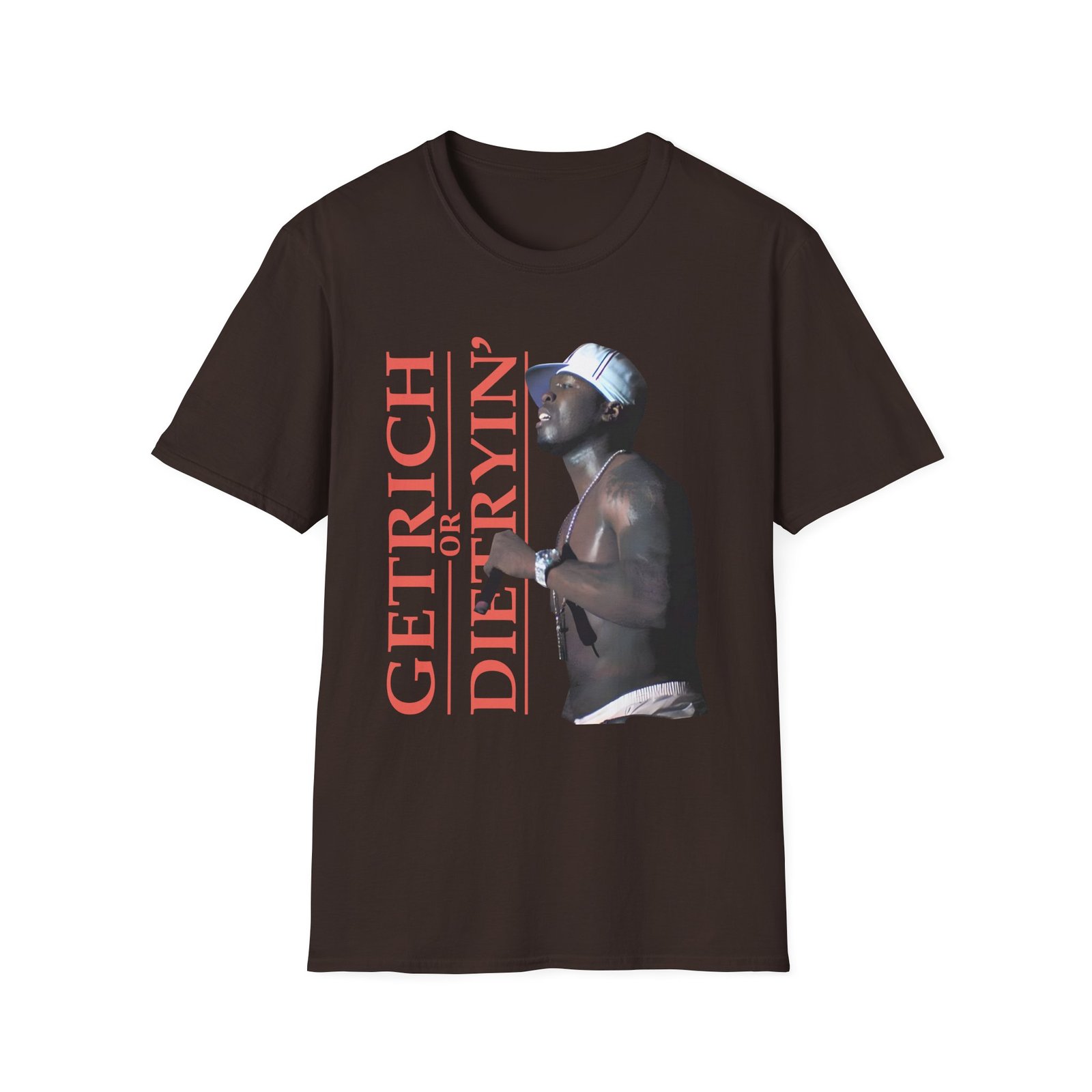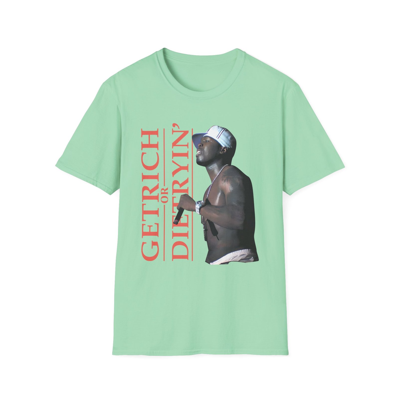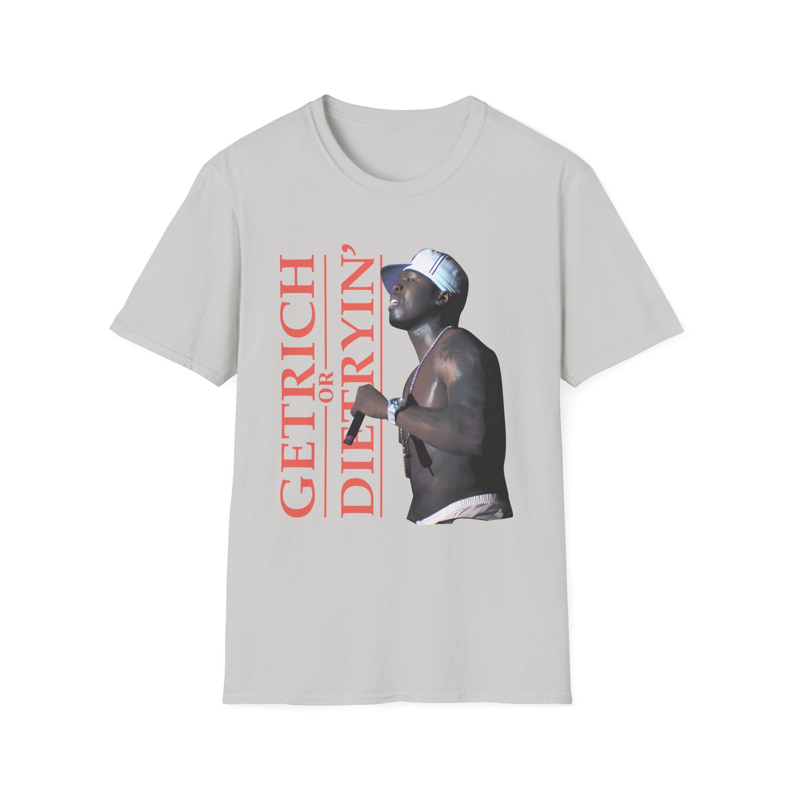 The 50 Cent Get Rich Logo unisex soft-style t-shirt puts a new spin on casual comfort. Made from very soft materials, this tee is 100% cotton for solid colors. Heather colors and sports grey include polyester. The shoulders have twill tape for improved durability. There are no side seams. The collar is made with ribbed knitting to prevent curling damage.