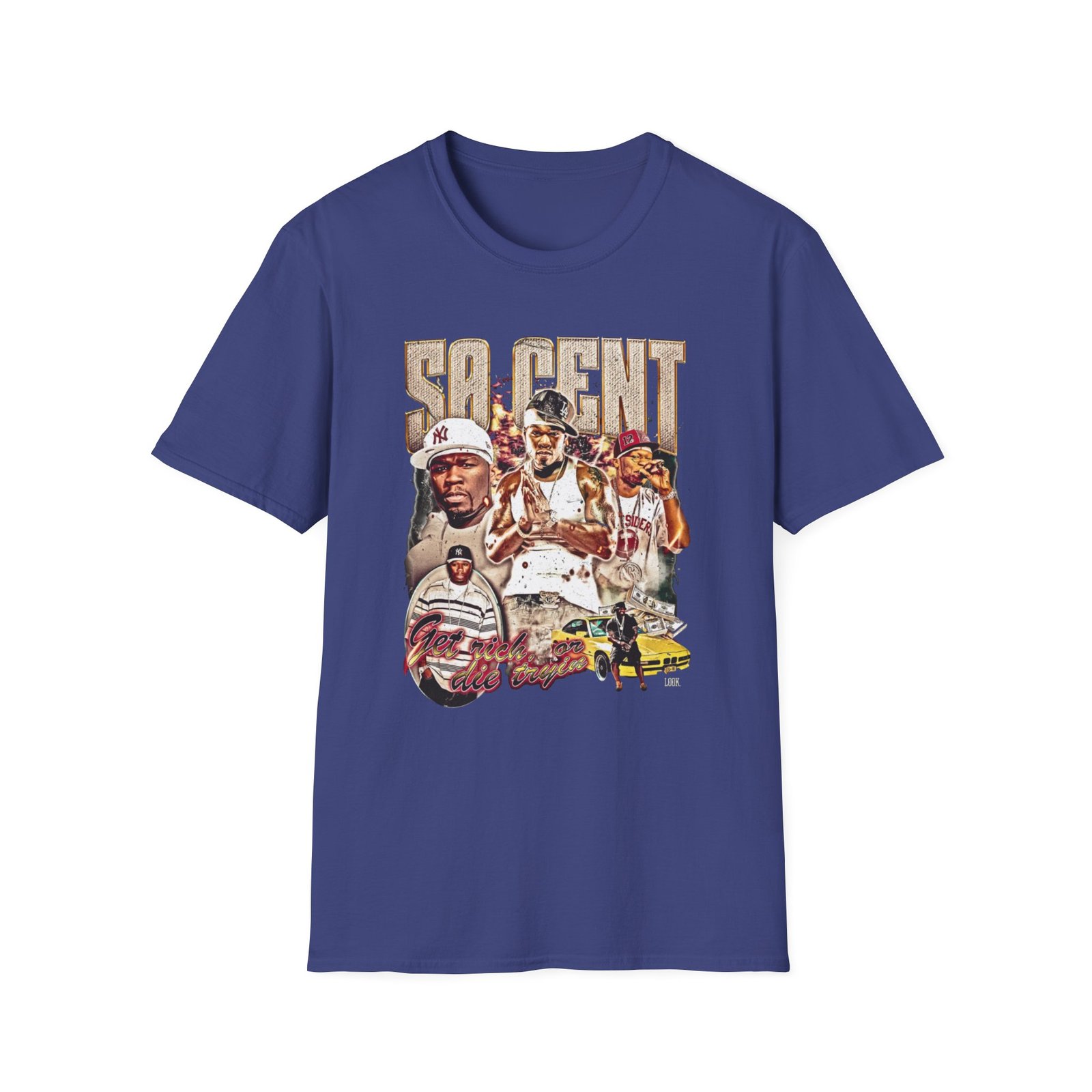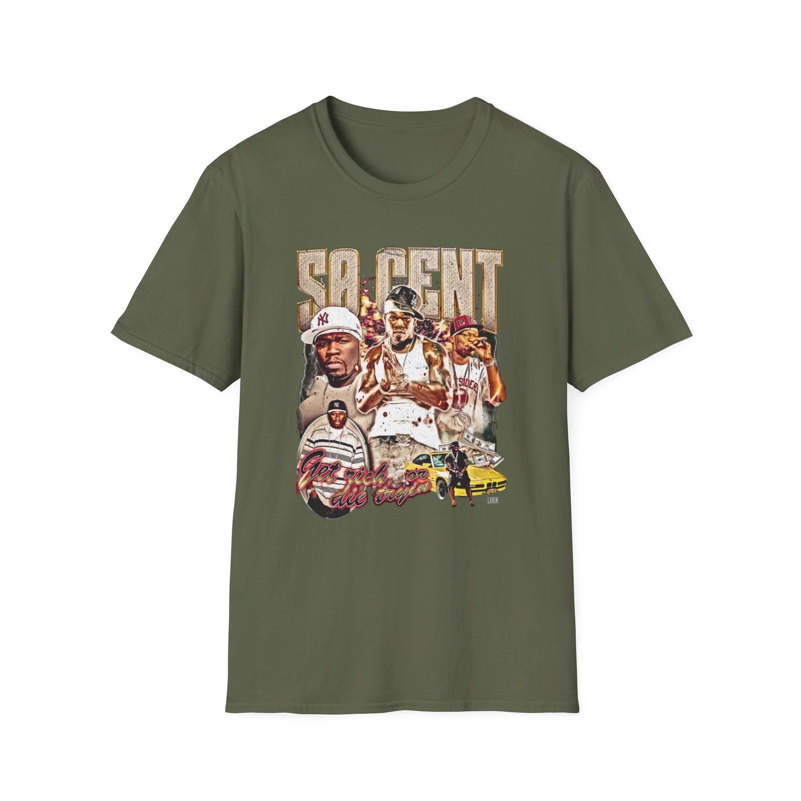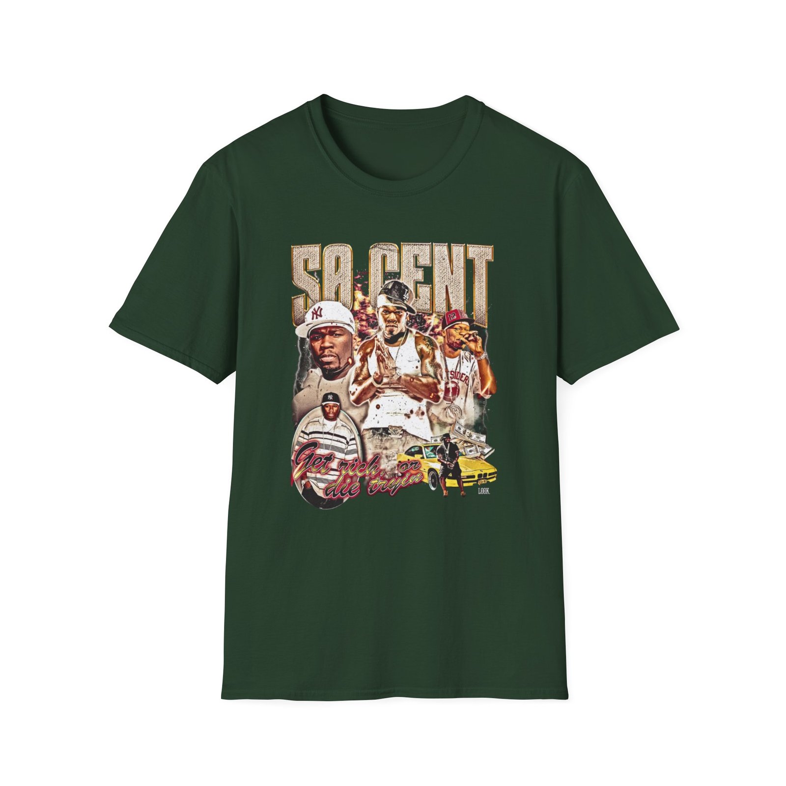 The 50 Cent Get Rich or Die Tryin unisex soft-style t-shirt puts a new spin on casual comfort. Made from very soft materials, this tee is 100% cotton for solid colors. Heather colors and sports grey include polyester. The shoulders have twill tape for improved durability. There are no side seams. The collar is made with ribbed knitting to prevent curling damage.
