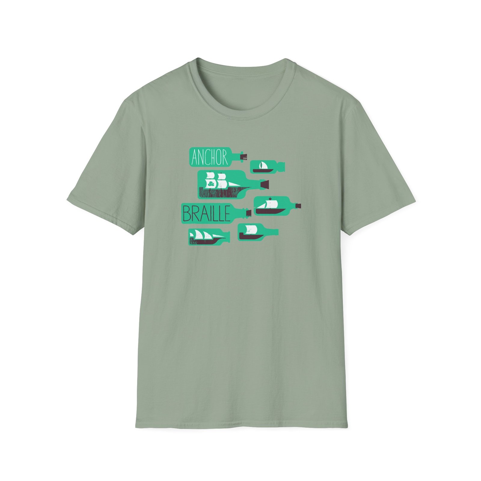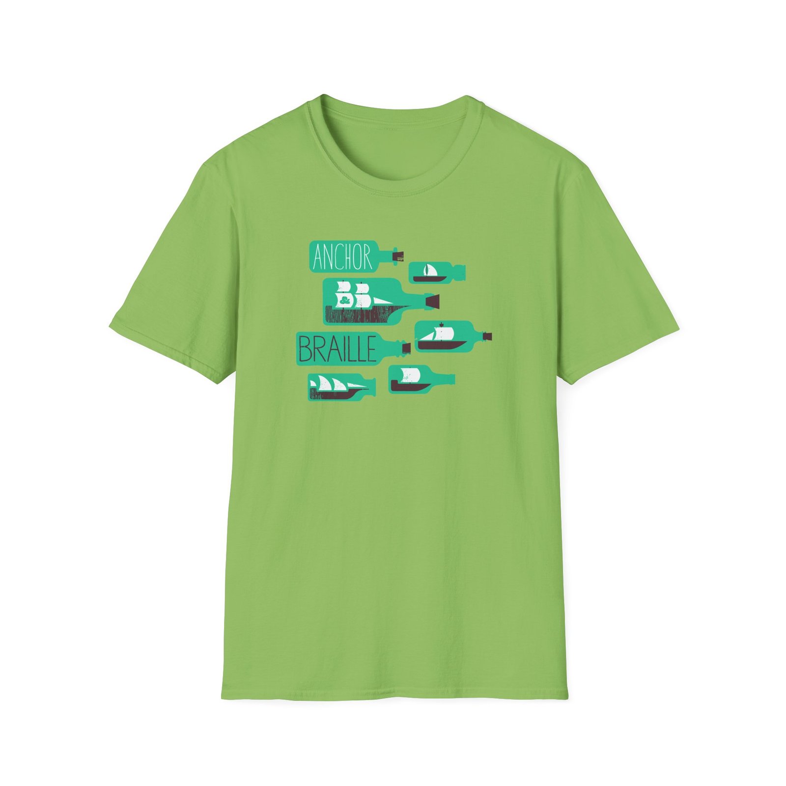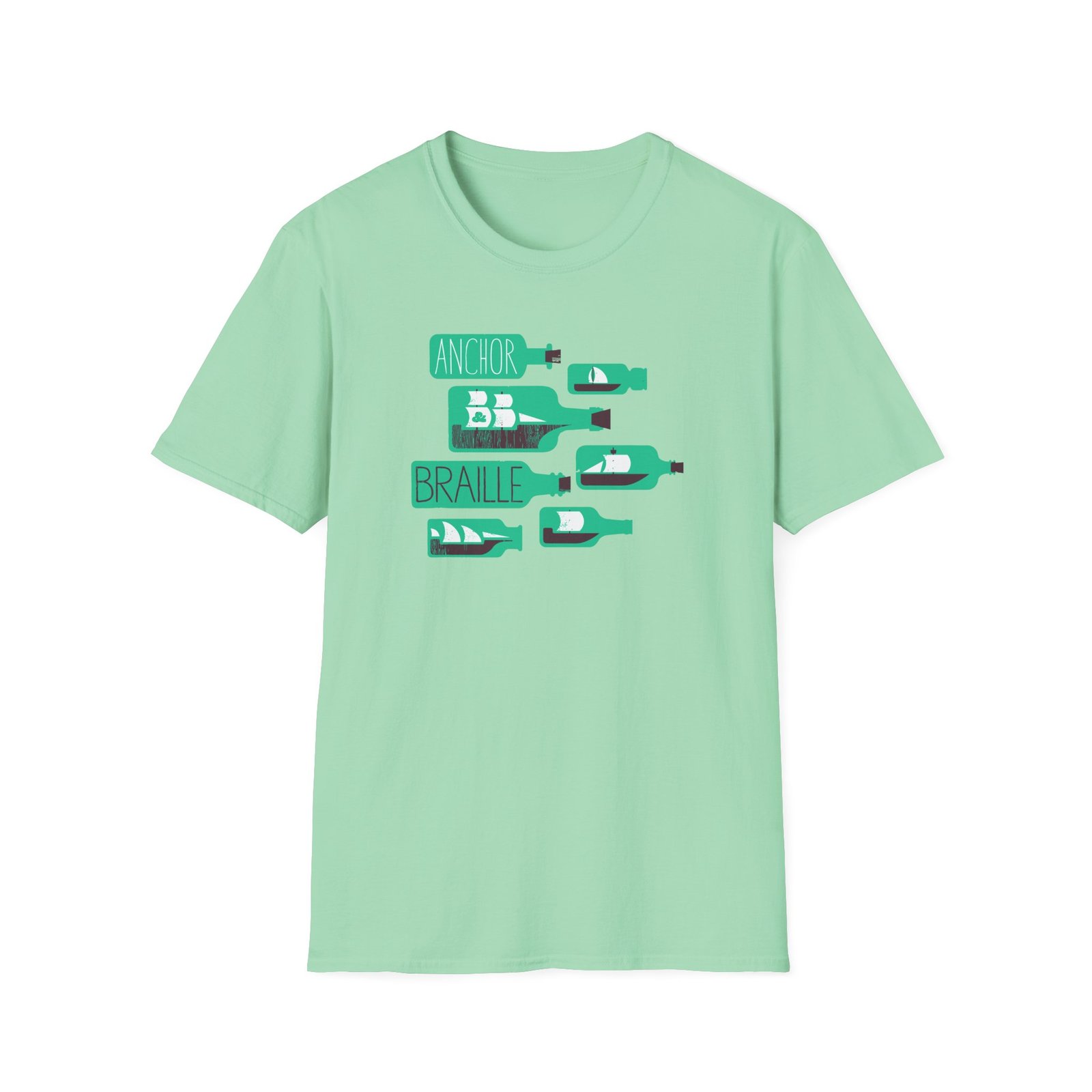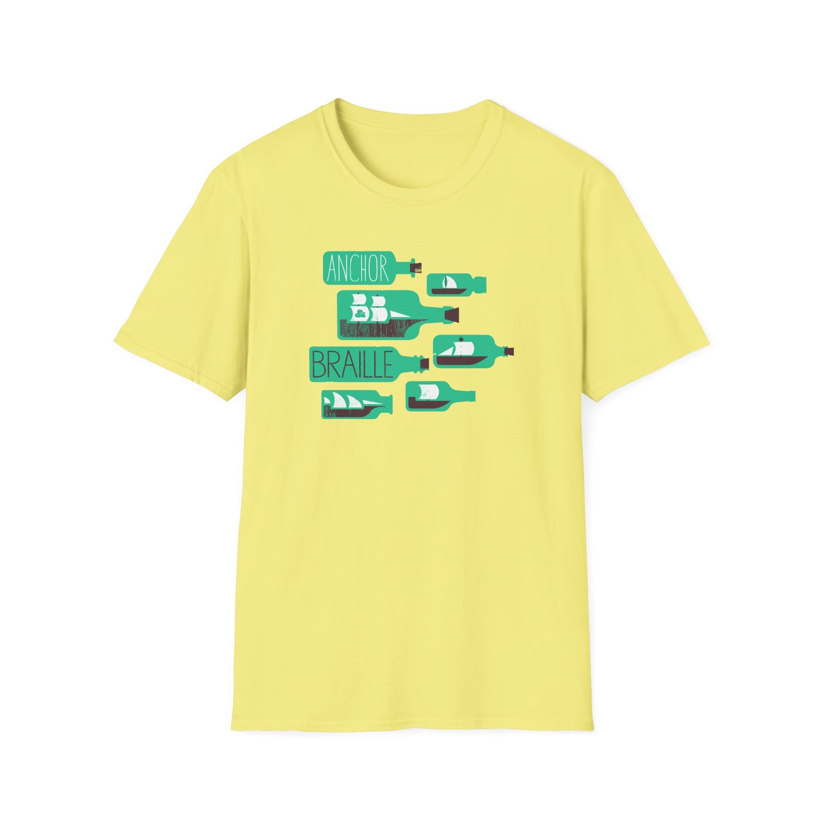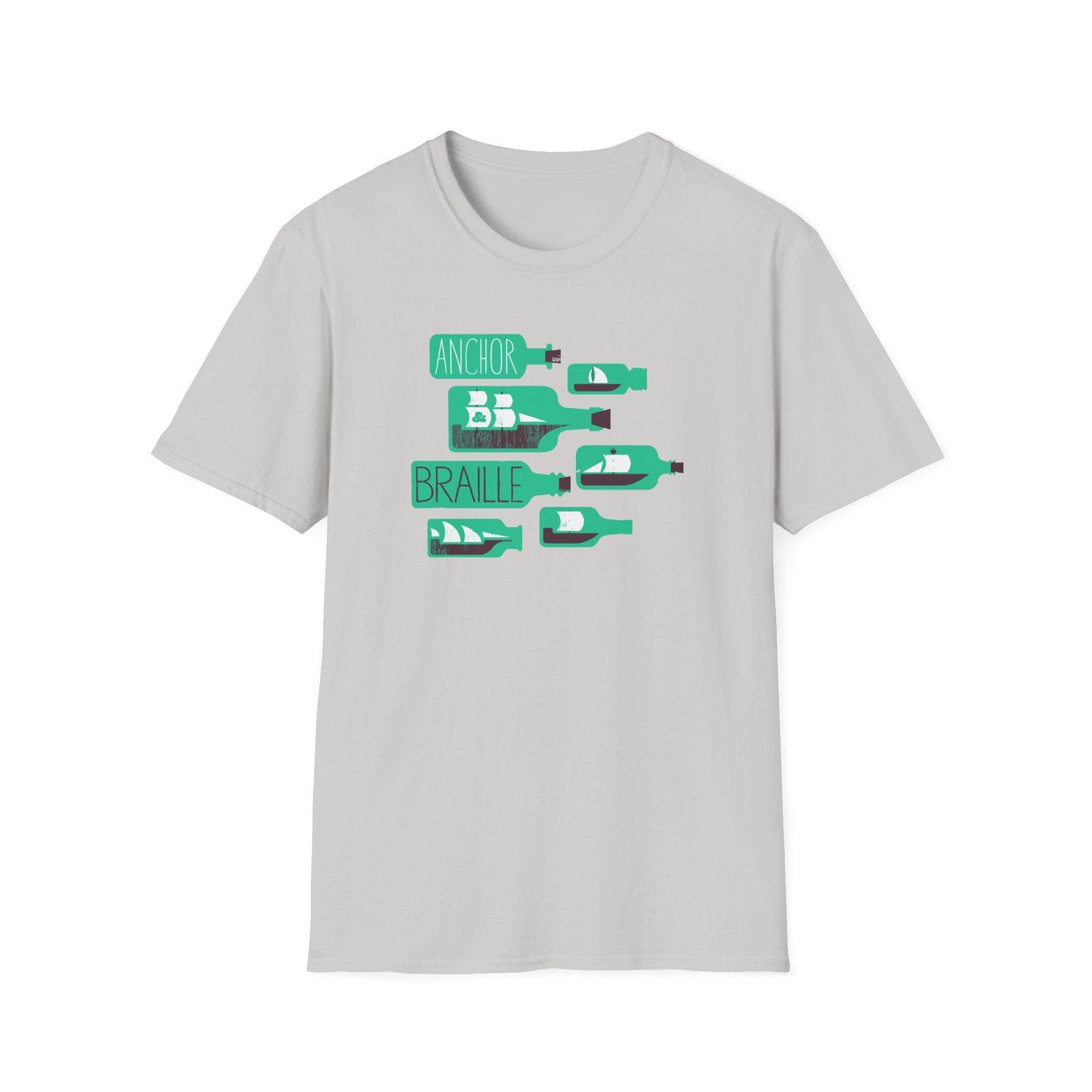The Anchor and Braille Ships Bottles unisex soft-style t-shirt puts a new spin on casual comfort. Made from very soft materials, this tee is 100% cotton for solid colors. Heather colors and sports grey include polyester. The shoulders have twill tape for improved durability. There are no side seams. The collar is made with ribbed knitting to prevent curling damage.