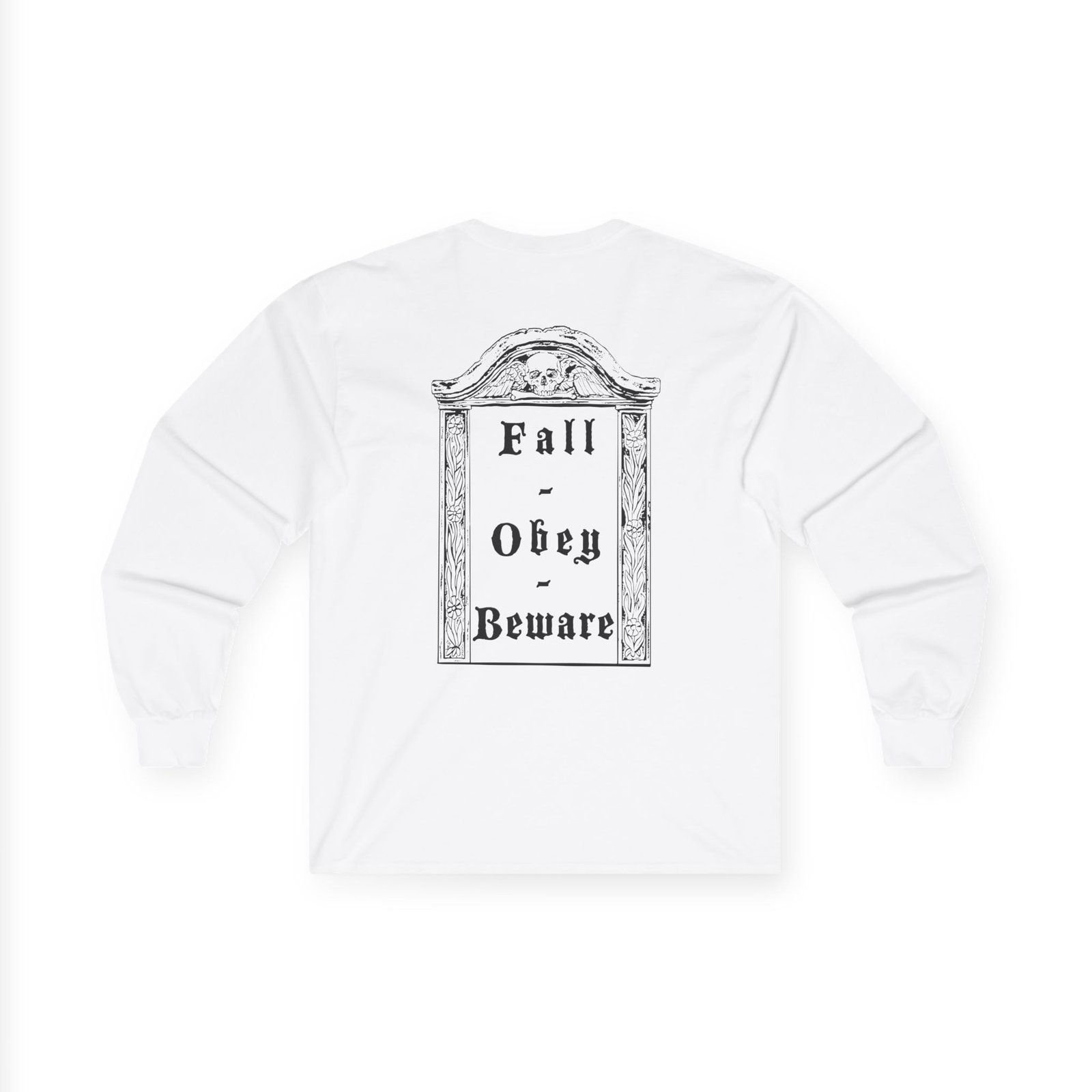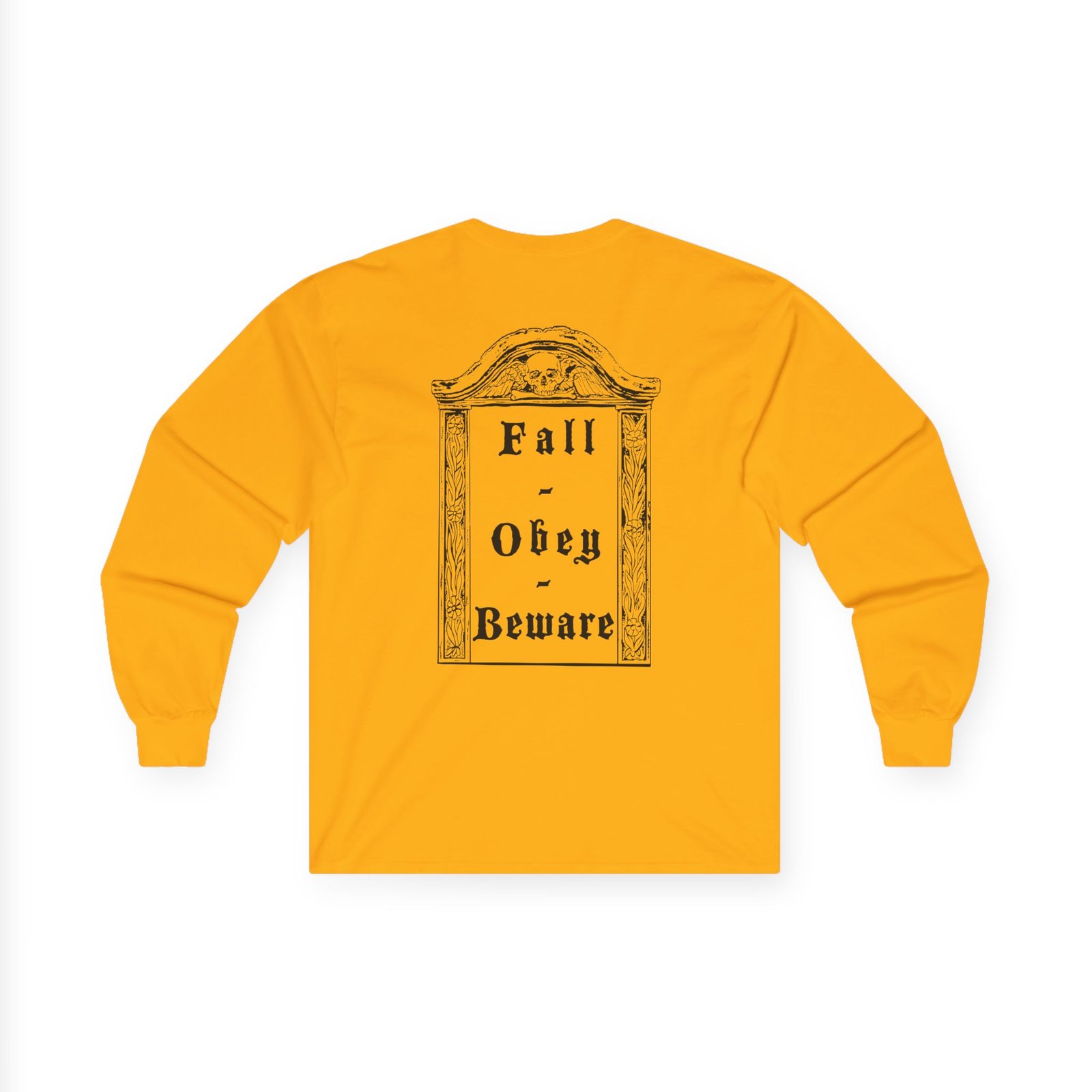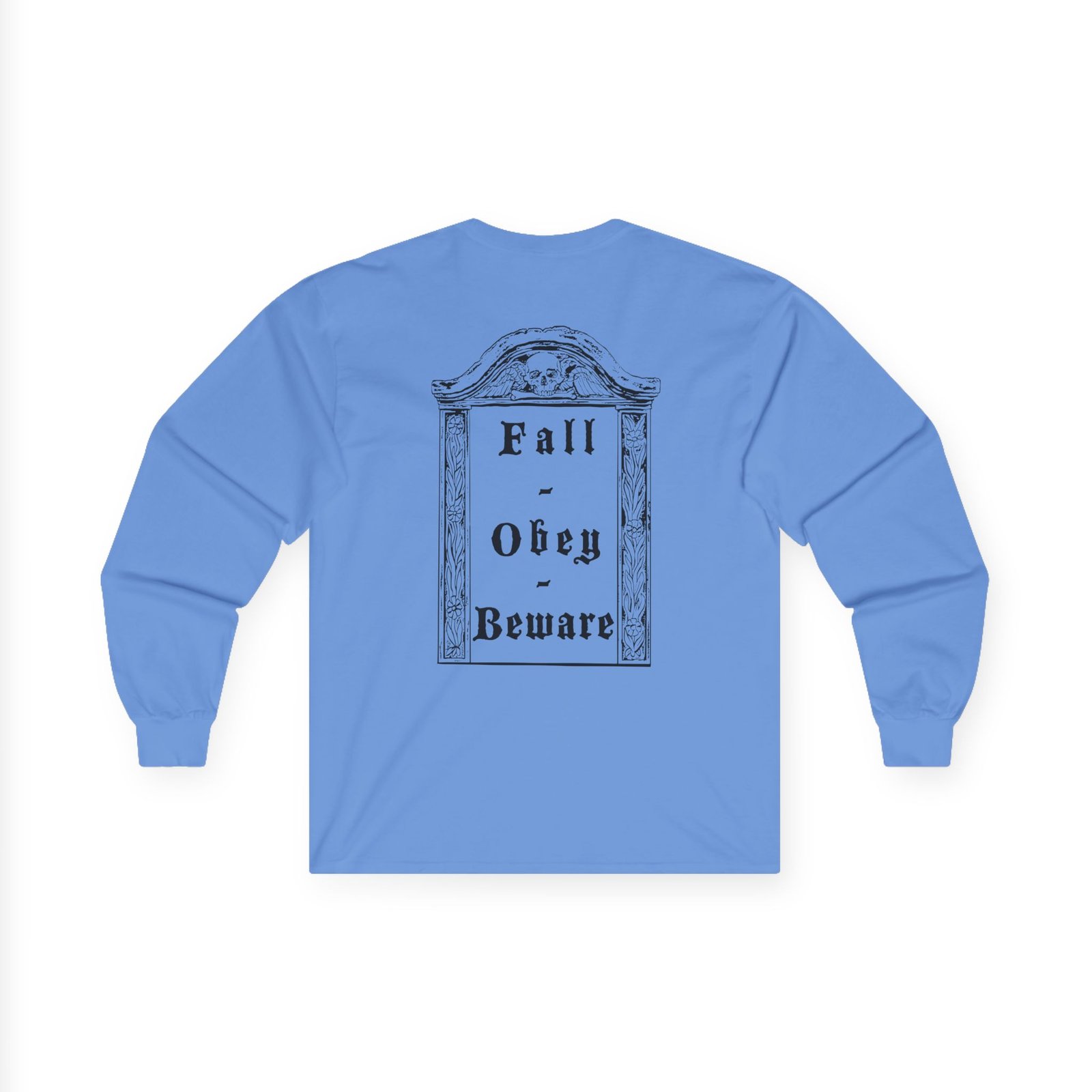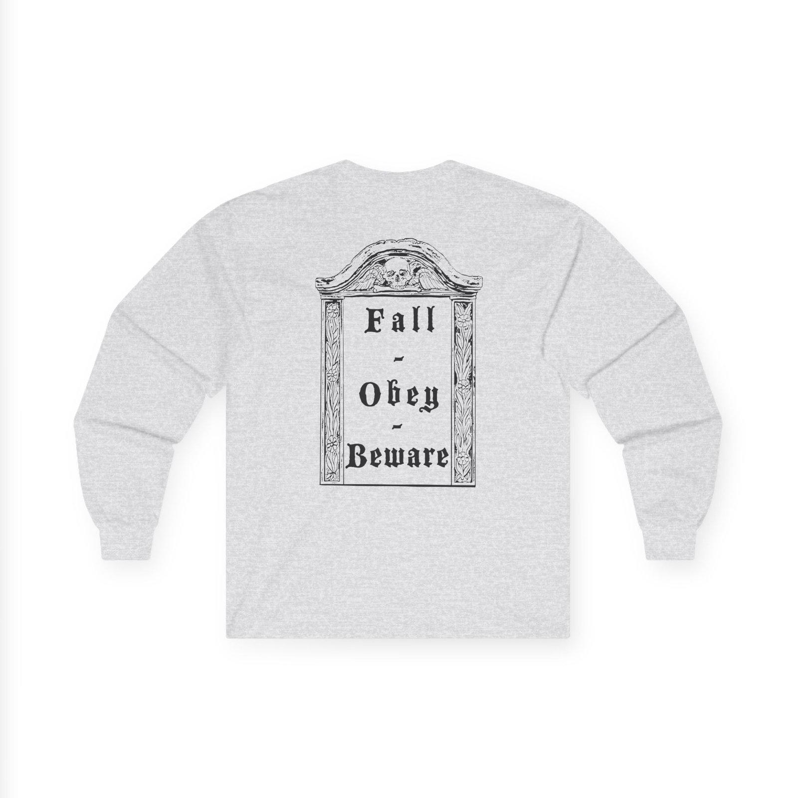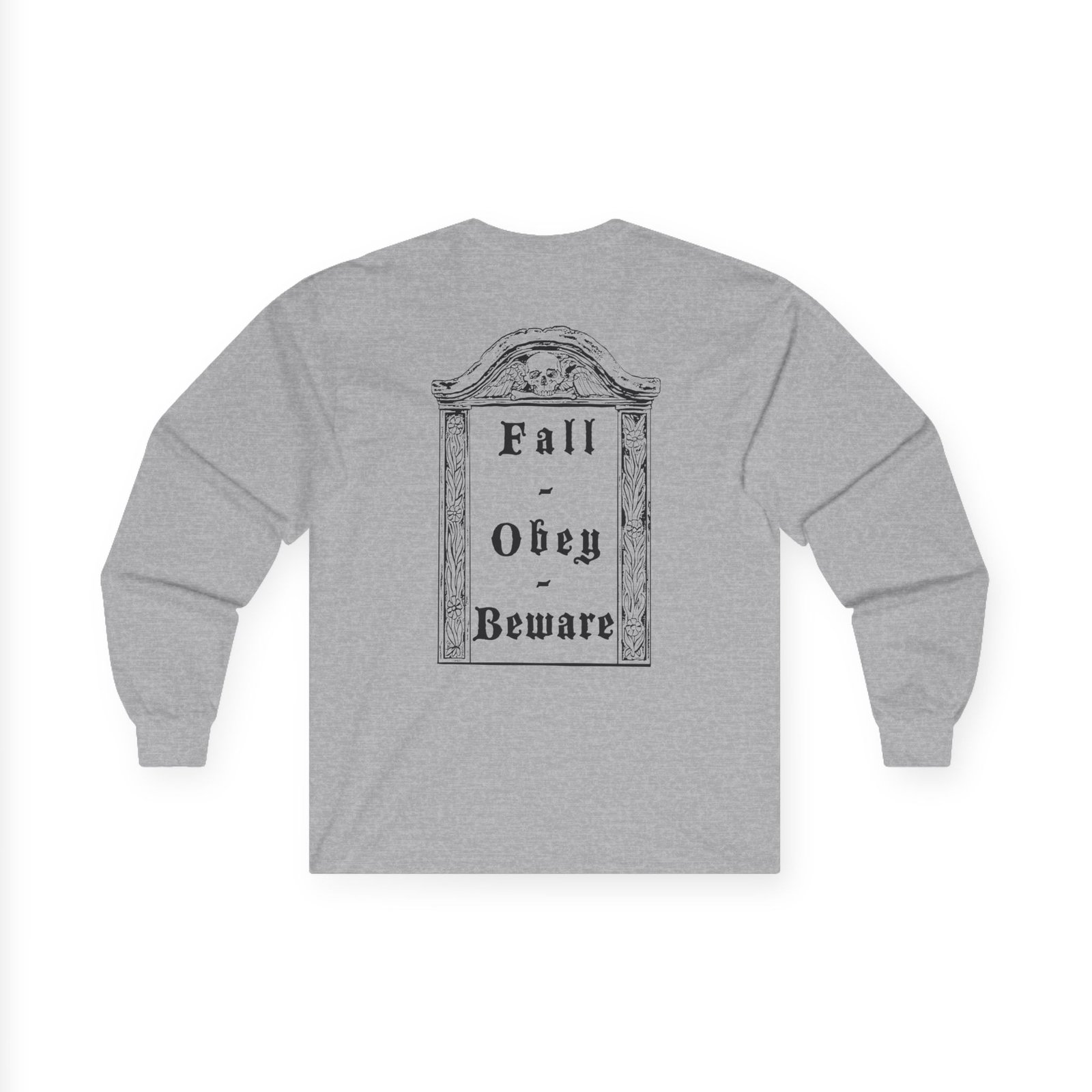 A bit more formal than a standard-issue t-shirt, the Bewitcher Fall. Obey. Beware. ultra cotton long sleeve tee is a clear comfort winner. The sleeves also act as a nice frame. There are no side seams. The shoulders are taped for improved durability. This makes for a good fitting around the shoulders and neck. The cotton used for these shirts is environmentally friendly.