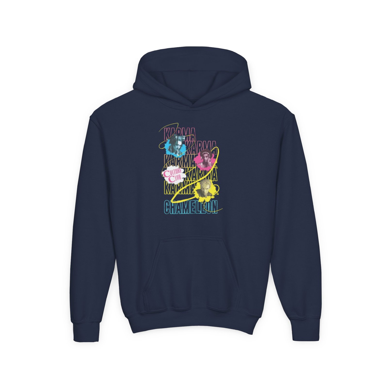 Soft, comfy, and a little bit mischievous — this youth Boy George Karma Chameleon Band hoodie brings bright, playful energy to everyday wear. A drippy gradient smiley sits on the chest in neon orange-to-pink, framed by bold lettering that gives the design attitude without shouting. The midweight fabric holds its shape and keeps kids cozy through playground runs, chilly school mornings, and weekend hangouts. Thoughtful details like a roomy kangaroo pocket and twill neck tape make it durable and comfortable, while print and embroidery options let you add a custom touch. It’s the kind of hoodie that becomes a go-to for active days and casual adventures.