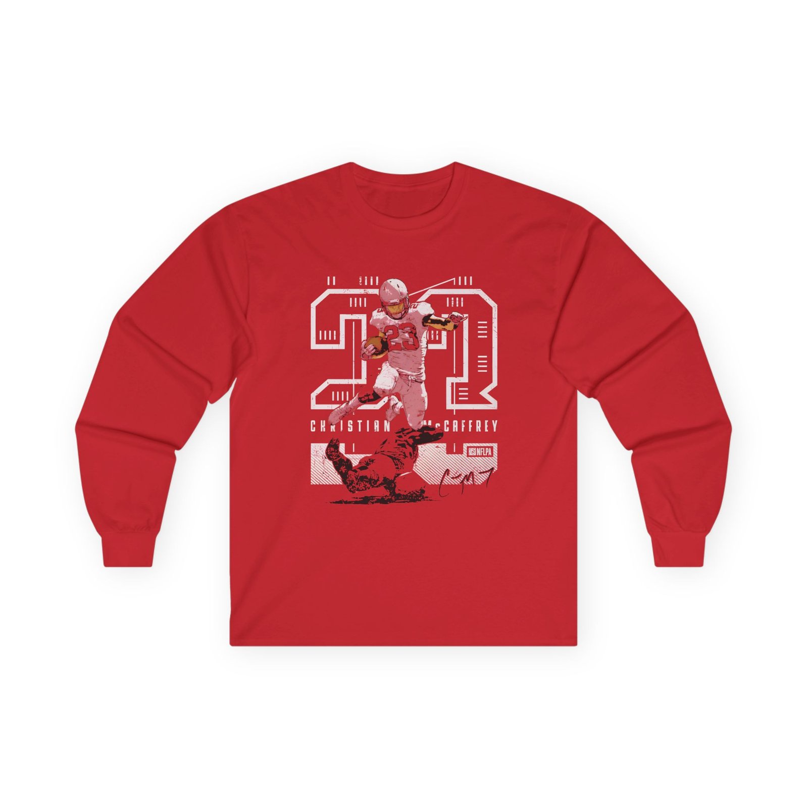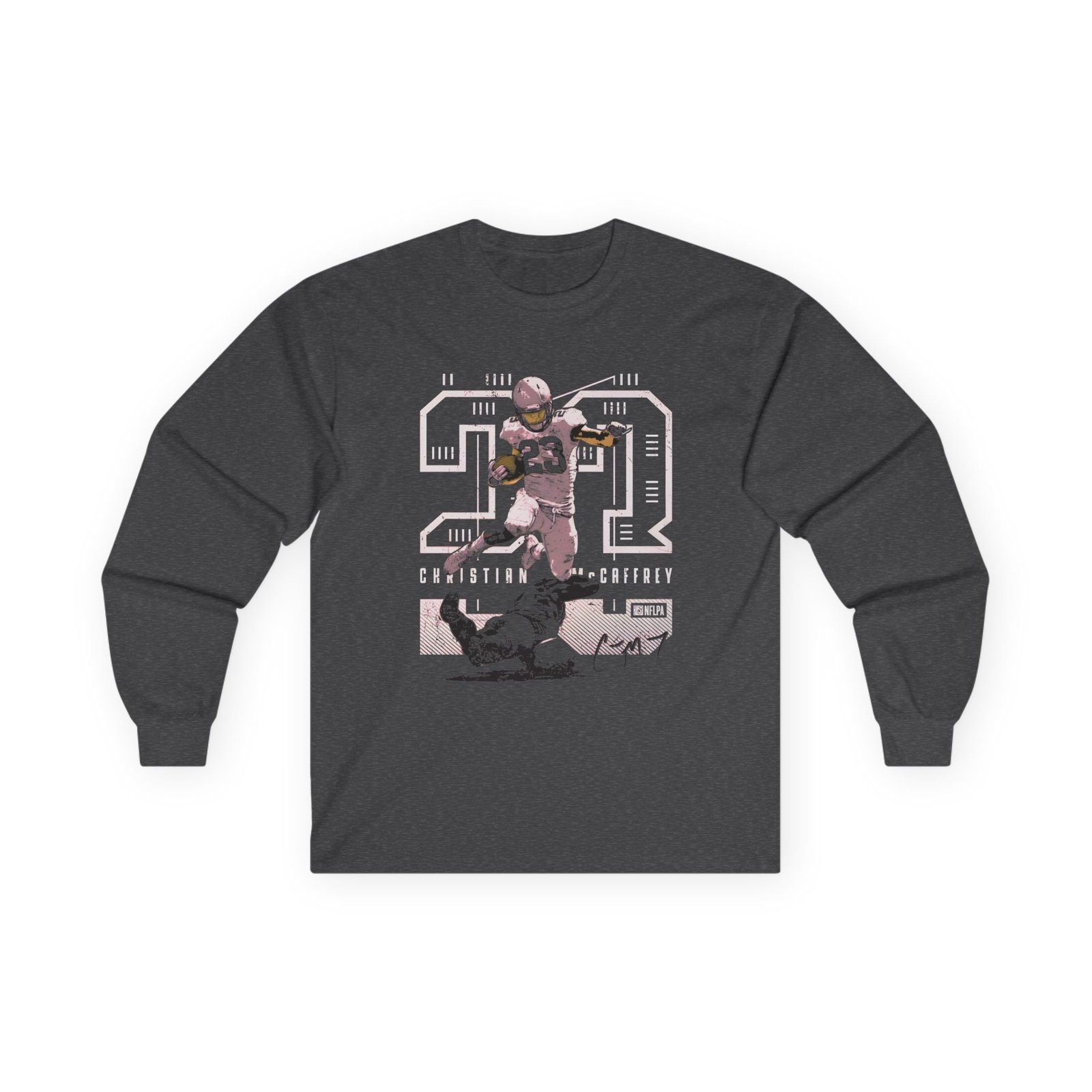 A bit more formal than a standard-issue t-shirt, the Christian Mccaffrey Future ultra cotton long sleeve tee is a clear comfort winner. The sleeves also act as a nice frame. There are no side seams. The shoulders are taped for improved durability. This makes for a good fitting around the shoulders and neck. The cotton used for these shirts is environmentally friendly.