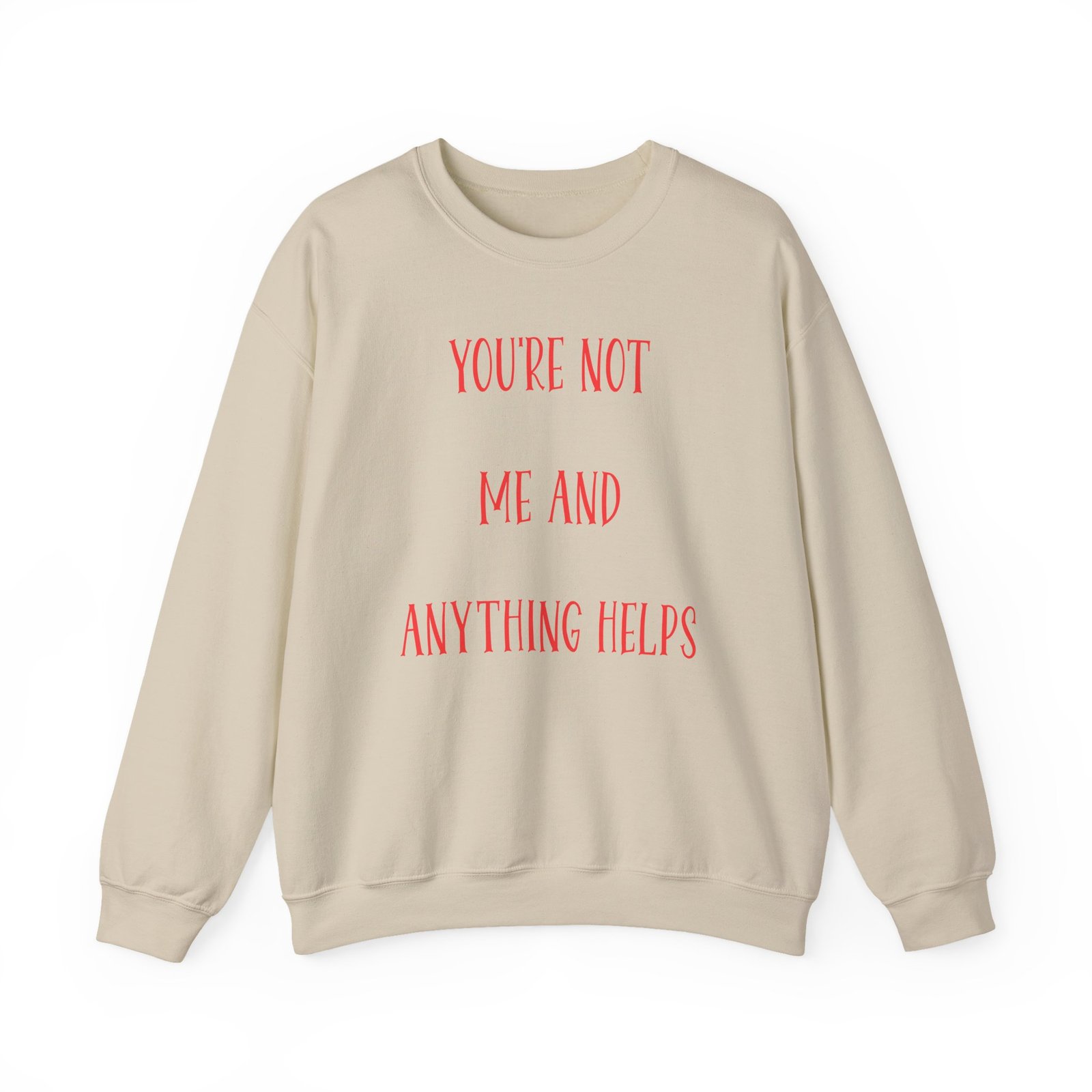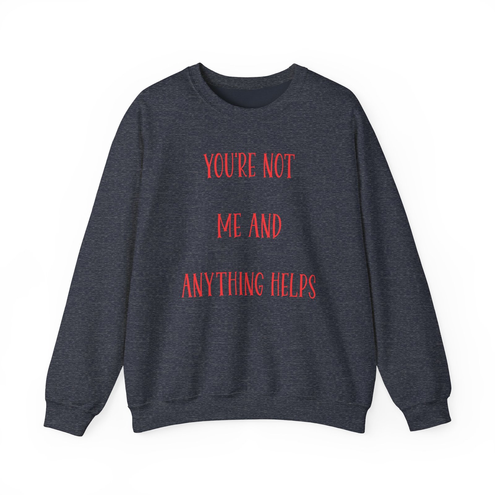Ideal for any situation, a Corey Scherer You're Not Me and Anything Helps unisex heavy blend crewneck sweatshirt is pure comfort. These garments are made from polyester and cotton. This combination helps designs come out looking fresh and beautiful. The collar is ribbed knit, so it retains its shape even after washing. There are no itchy side seams on these sweaters.