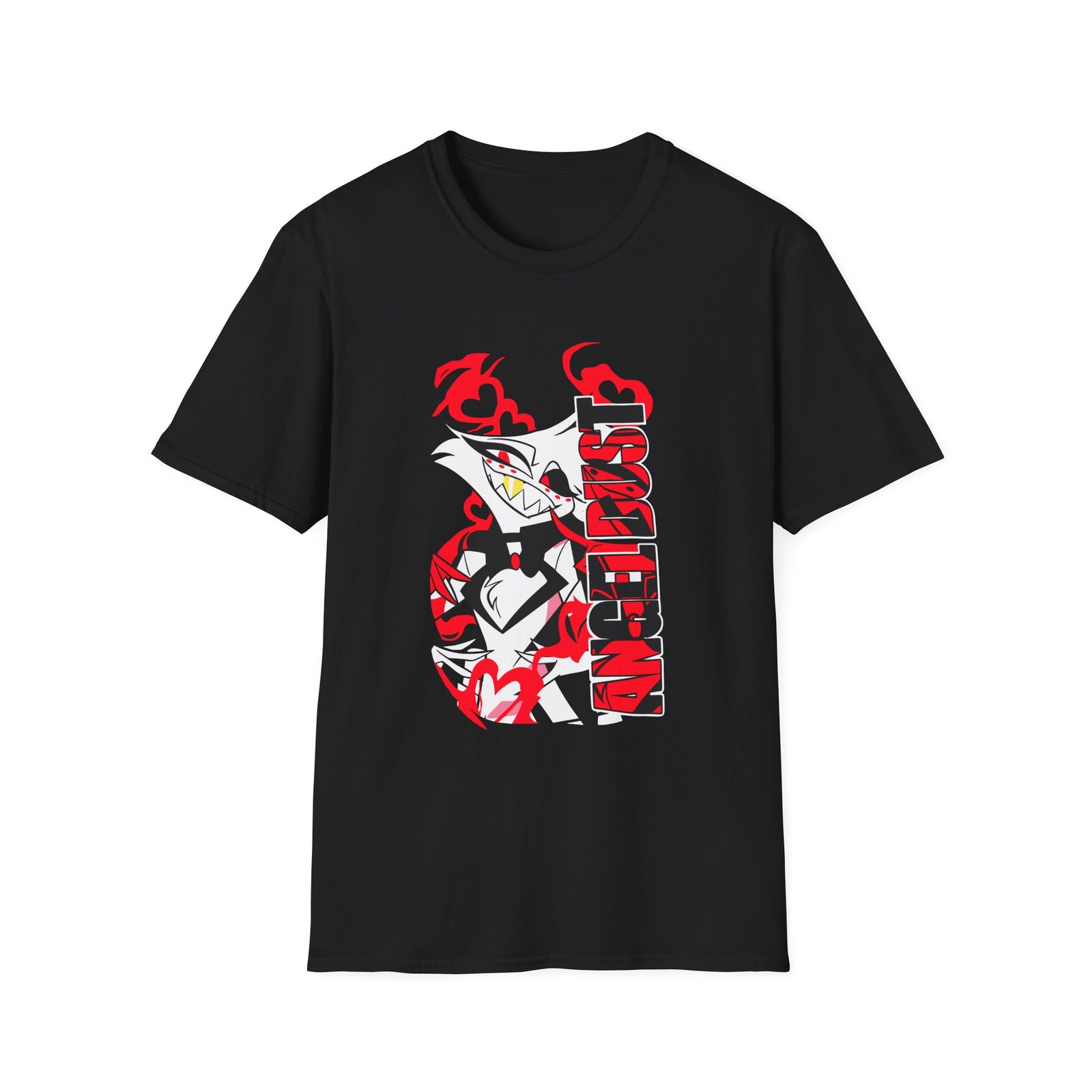 The Hazbin Hotel Angel Dust unisex soft-style t-shirt puts a new spin on casual comfort. Made from very soft materials, this tee is 100% cotton for solid colors. Heather colors and sports grey include polyester. The shoulders have twill tape for improved durability. There are no side seams. The collar is made with ribbed knitting to prevent curling damage.