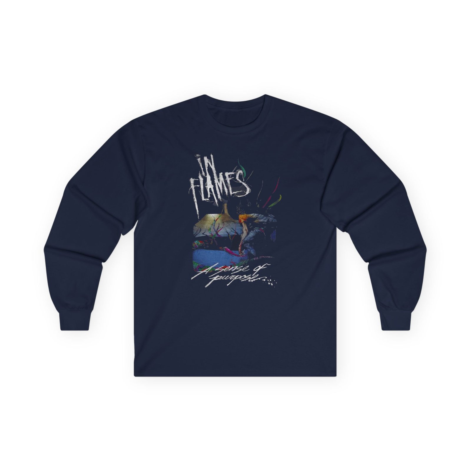 A bit more formal than a standard-issue t-shirt, the In Flames A Sense of Purpose ultra cotton long sleeve tee is a clear comfort winner. The sleeves also act as a nice frame. There are no side seams. The shoulders are taped for improved durability. This makes for a good fitting around the shoulders and neck. The cotton used for these shirts is environmentally friendly.
