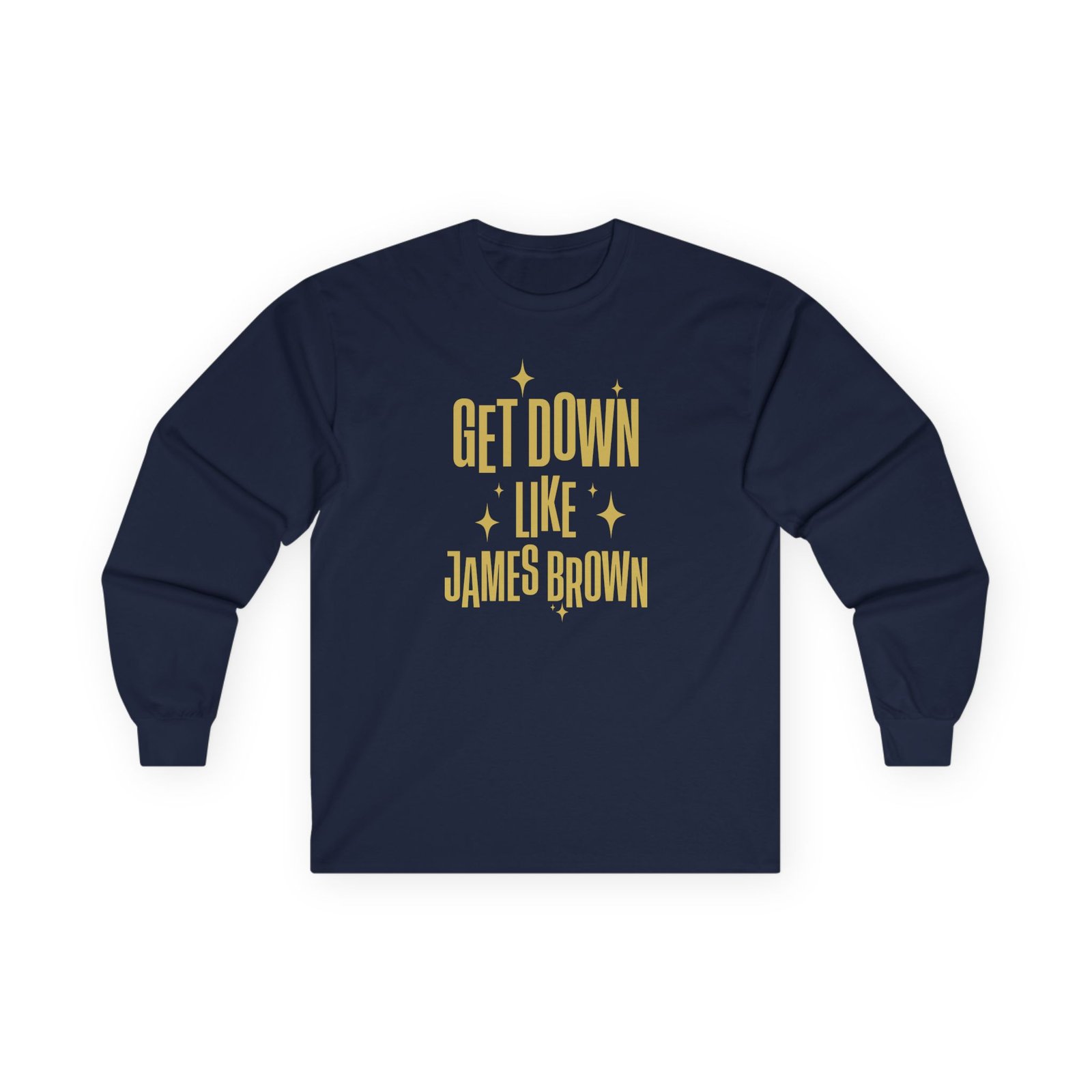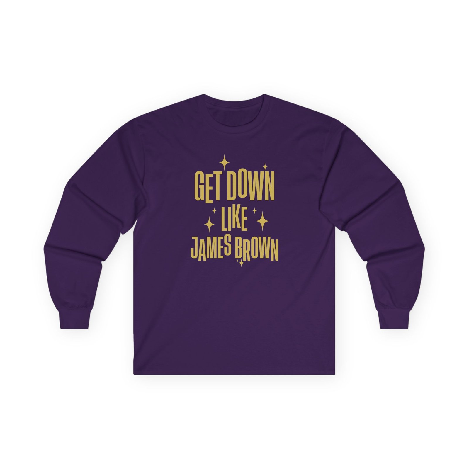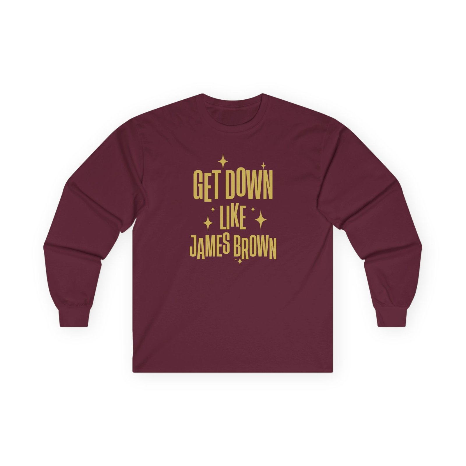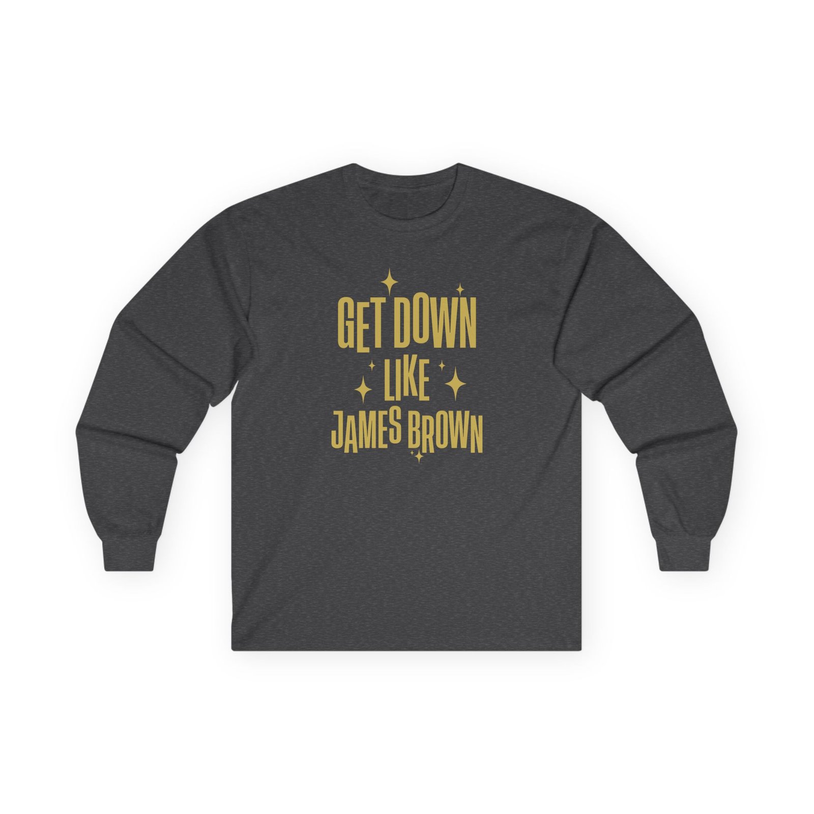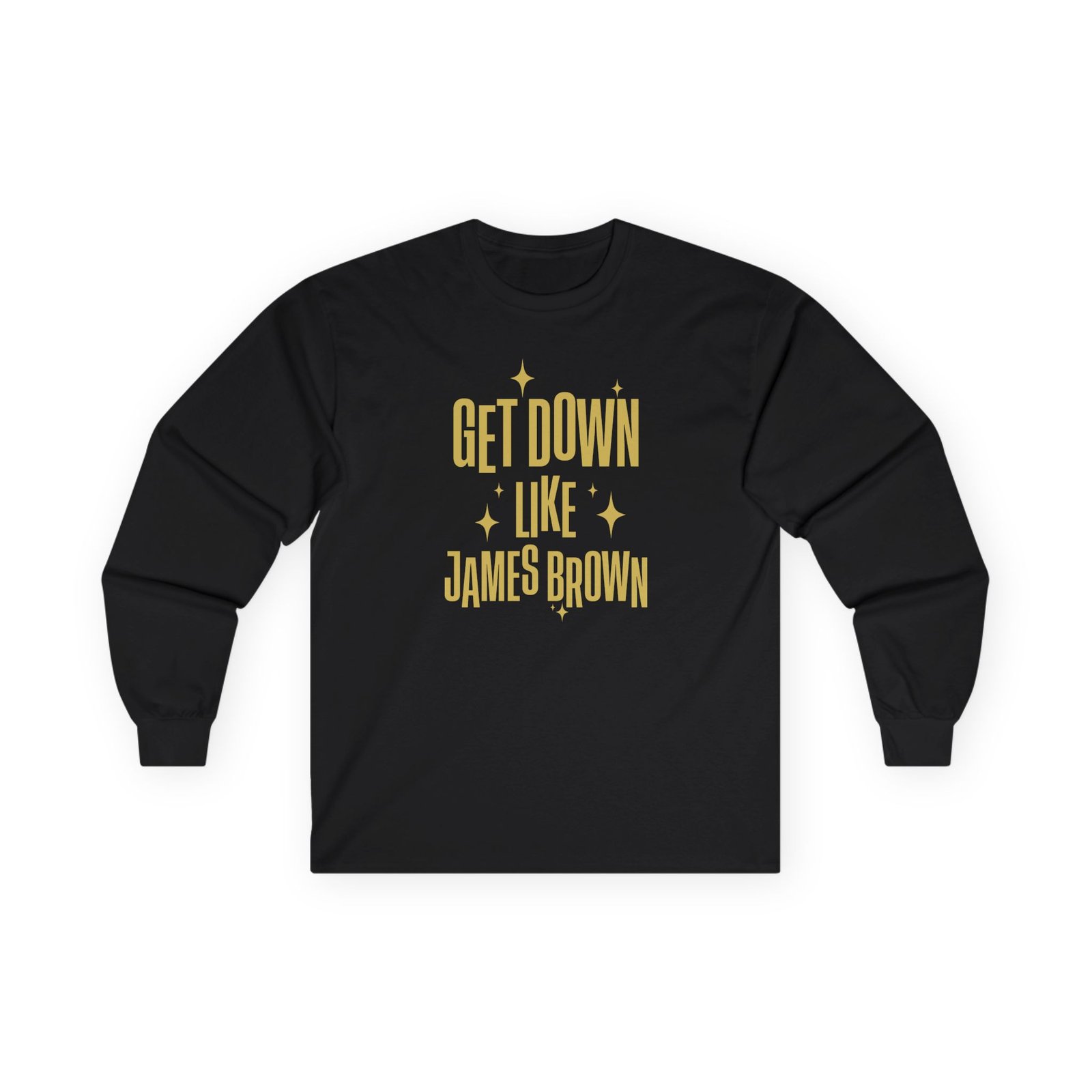 A bit more formal than a standard-issue t-shirt, the James Brown Get Down Like ultra cotton long sleeve tee is a clear comfort winner. The sleeves also act as a nice frame. There are no side seams. The shoulders are taped for improved durability. This makes for a good fitting around the shoulders and neck. The cotton used for these shirts is environmentally friendly.