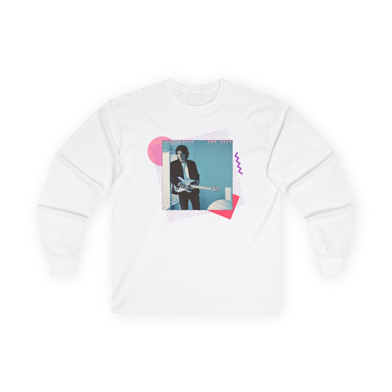 A bit more formal than a standard-issue t-shirt, the John Mayer Album Cover Photo ultra cotton long sleeve tee is a clear comfort winner. The sleeves also act as a nice frame. There are no side seams. The shoulders are taped for improved durability. This makes for a good fitting around the shoulders and neck. The cotton used for these shirts is environmentally friendly.