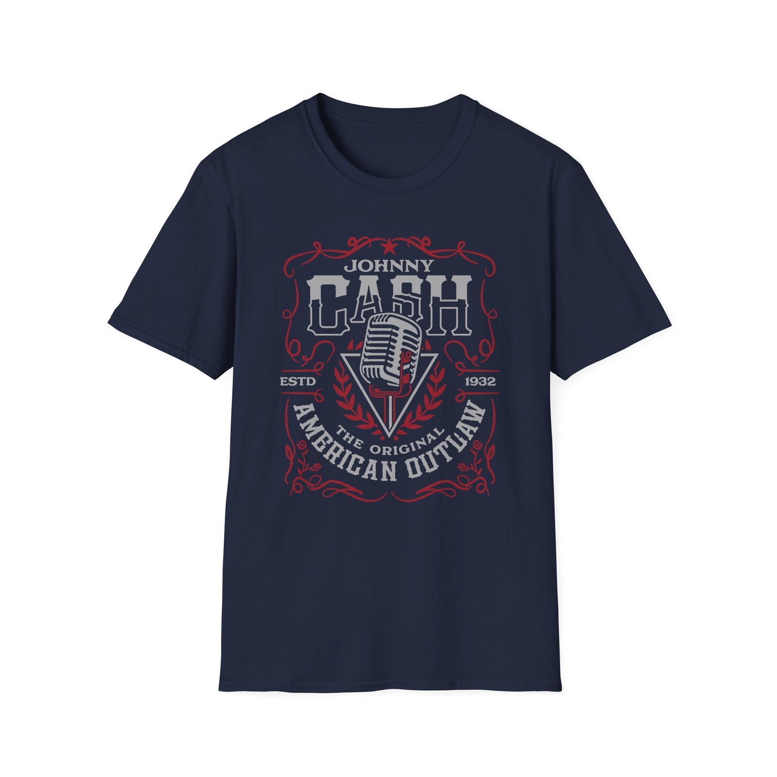 The Johnny Cash American Outlaw Microphone unisex soft-style t-shirt puts a new spin on casual comfort. Made from very soft materials, this tee is 100% cotton for solid colors. Heather colors and sports grey include polyester. The shoulders have twill tape for improved durability. There are no side seams. The collar is made with ribbed knitting to prevent curling damage.