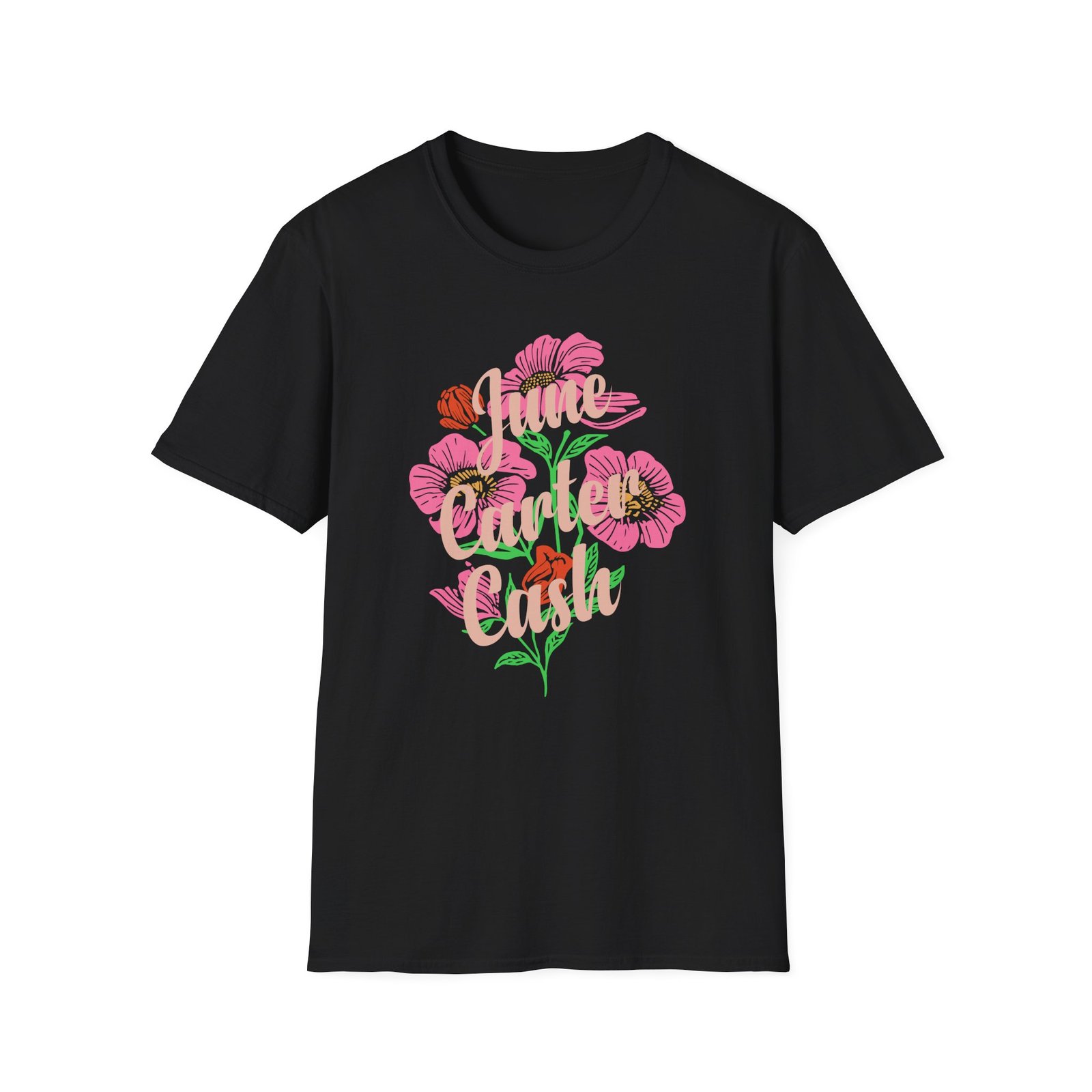 The Johnny Cash June Carter Cash Flowers unisex soft-style t-shirt puts a new spin on casual comfort. Made from very soft materials, this tee is 100% cotton for solid colors. Heather colors and sports grey include polyester. The shoulders have twill tape for improved durability. There are no side seams. The collar is made with ribbed knitting to prevent curling damage.