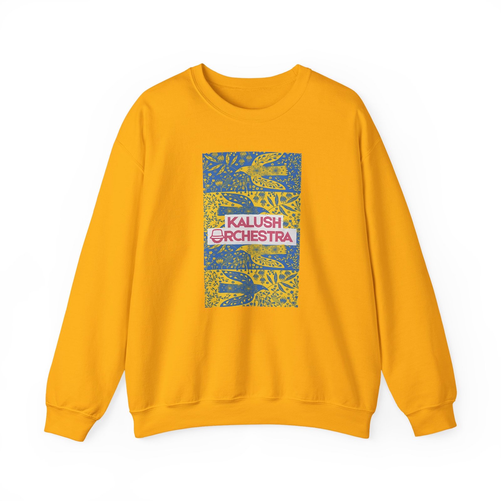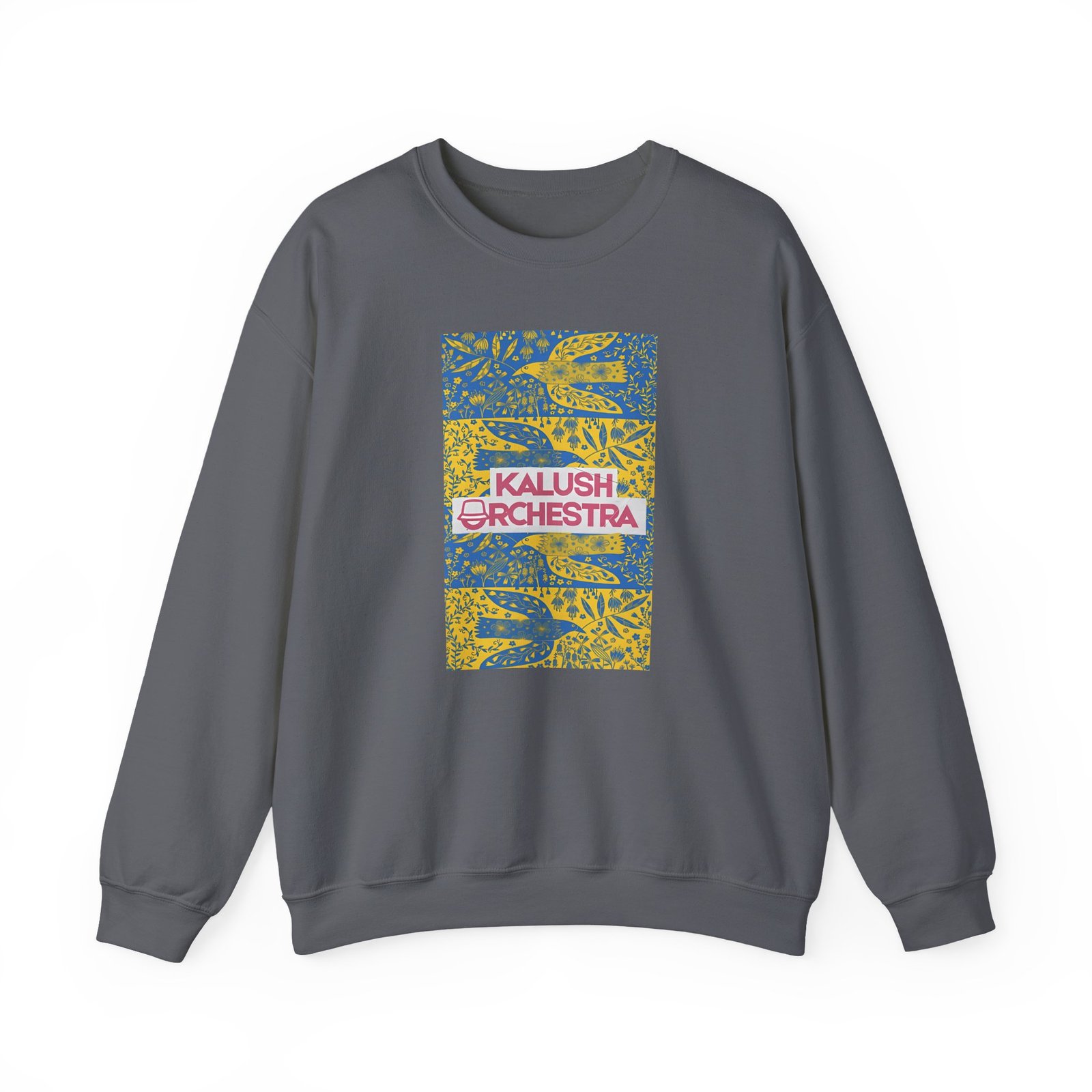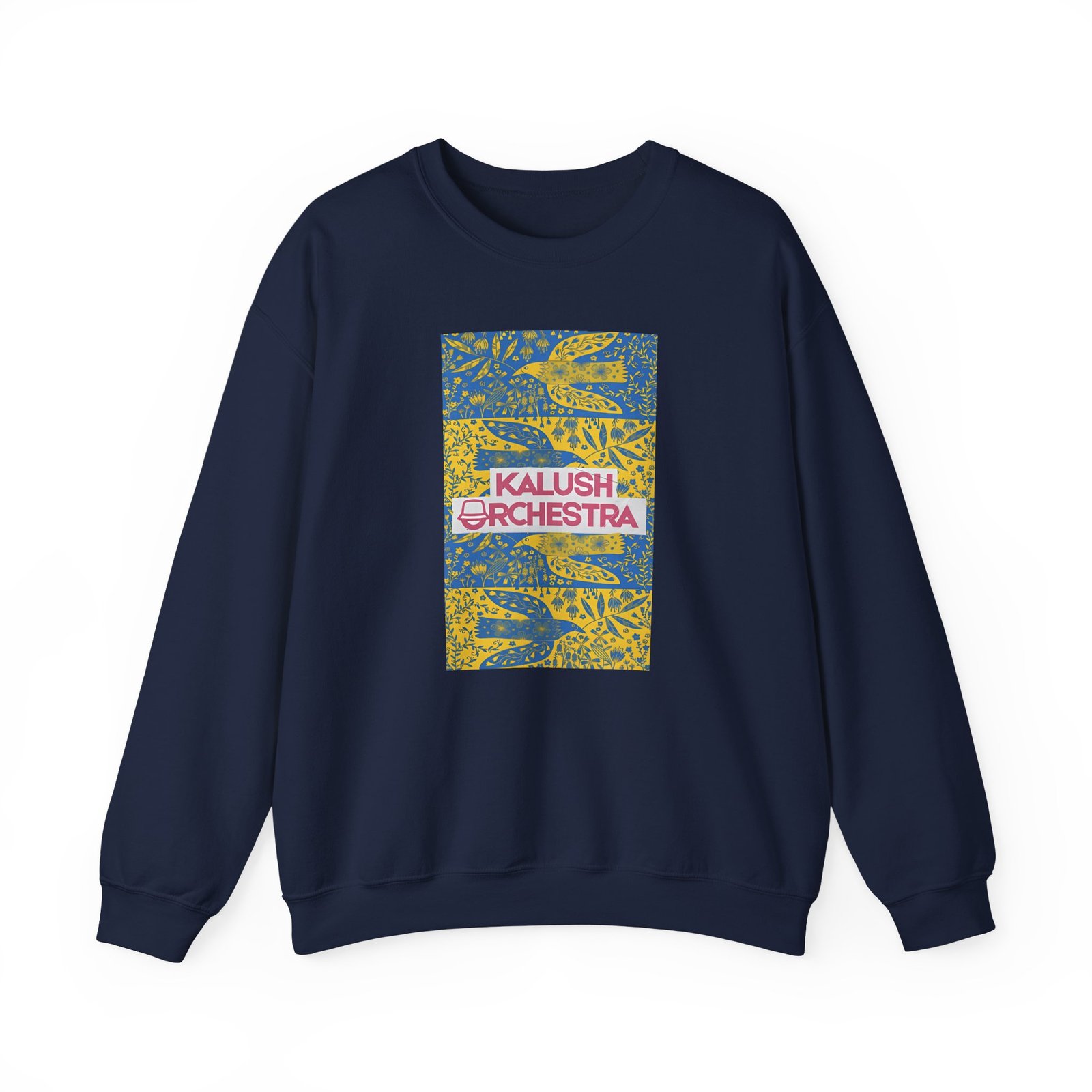 Ideal for any situation, a Kalush Orchestra unisex heavy blend crewneck sweatshirt is pure comfort. These garments are made from polyester and cotton. This combination helps designs come out looking fresh and beautiful. The collar is ribbed knit, so it retains its shape even after washing. There are no itchy side seams on these sweaters.