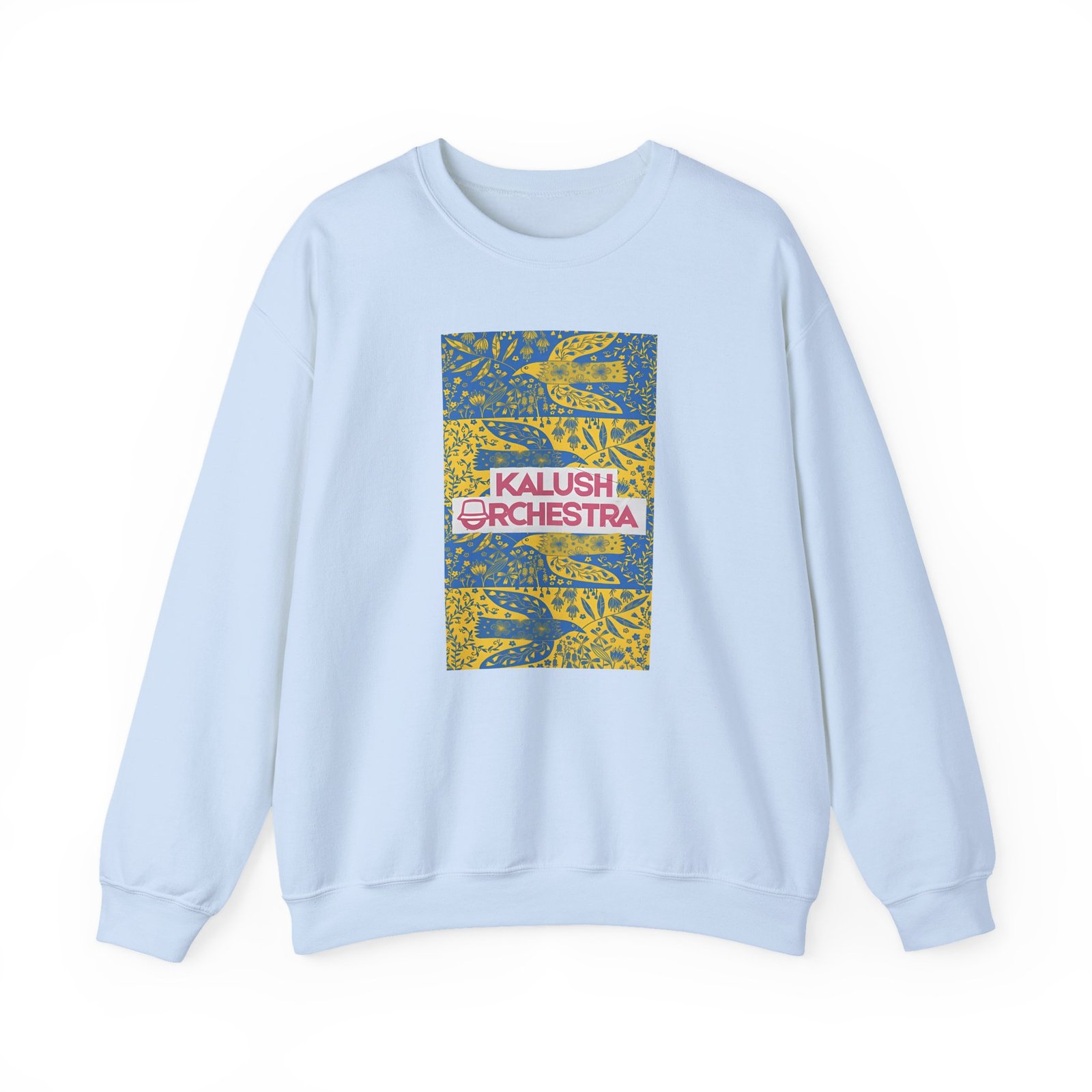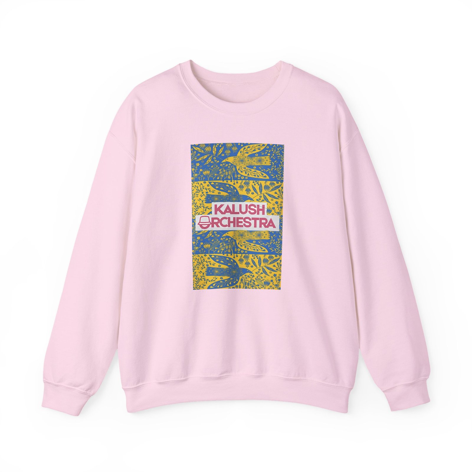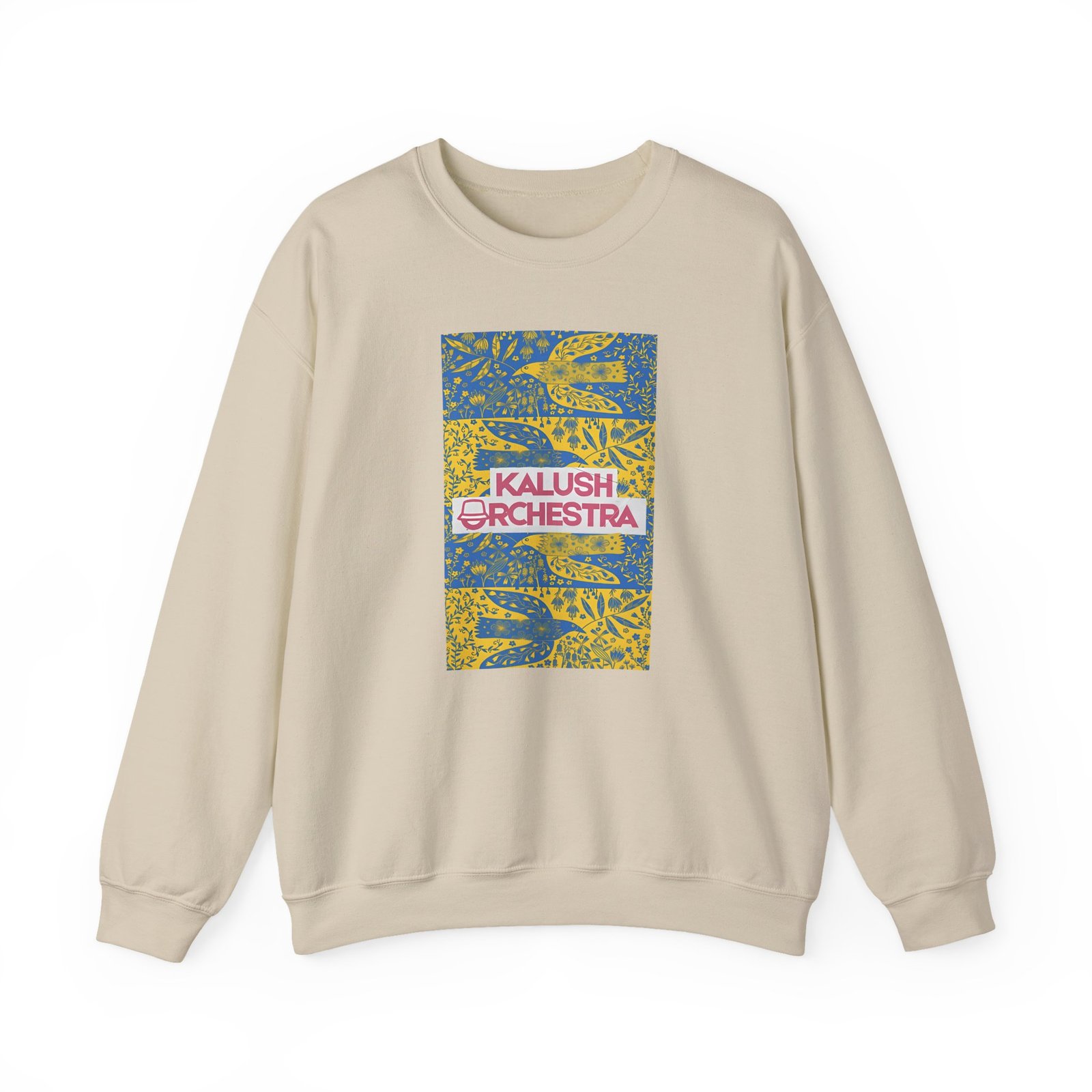 Ideal for any situation, a Kalush Orchestra unisex heavy blend crewneck sweatshirt is pure comfort. These garments are made from polyester and cotton. This combination helps designs come out looking fresh and beautiful. The collar is ribbed knit, so it retains its shape even after washing. There are no itchy side seams on these sweaters.