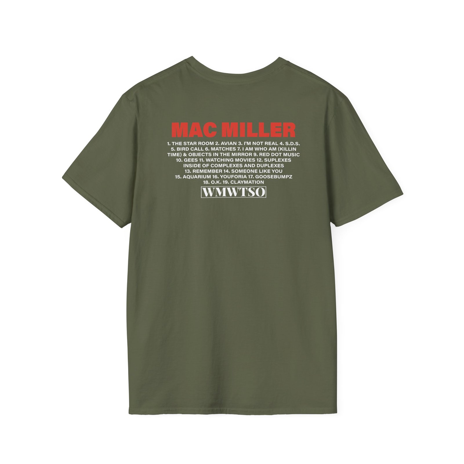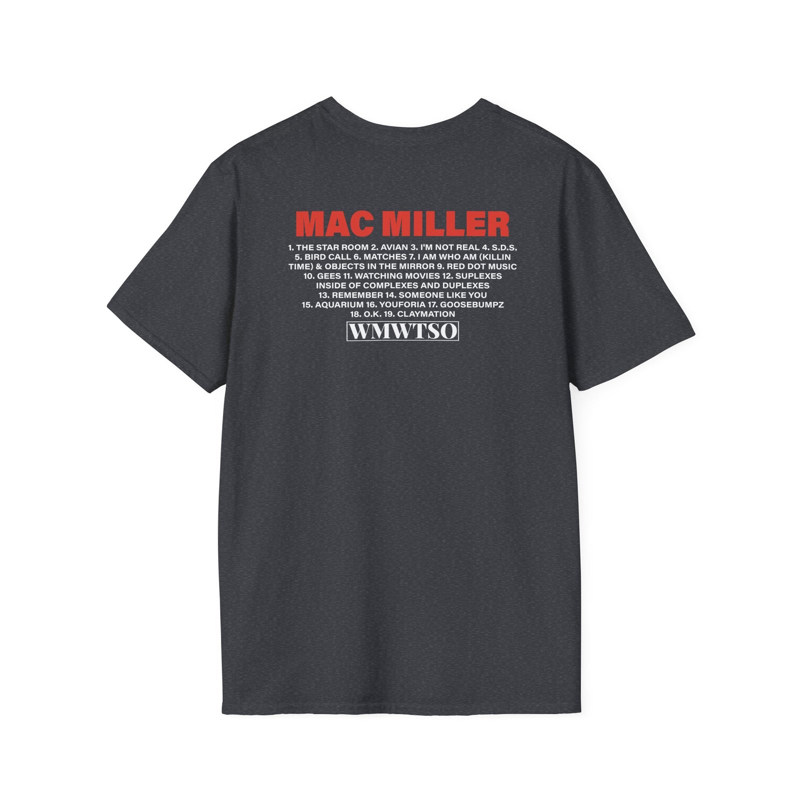 The Mac Miller Wmwtso Track List unisex soft-style t-shirt puts a new spin on casual comfort. Made from very soft materials, this tee is 100% cotton for solid colors. Heather colors and sports grey include polyester. The shoulders have twill tape for improved durability. There are no side seams. The collar is made with ribbed knitting to prevent curling damage.