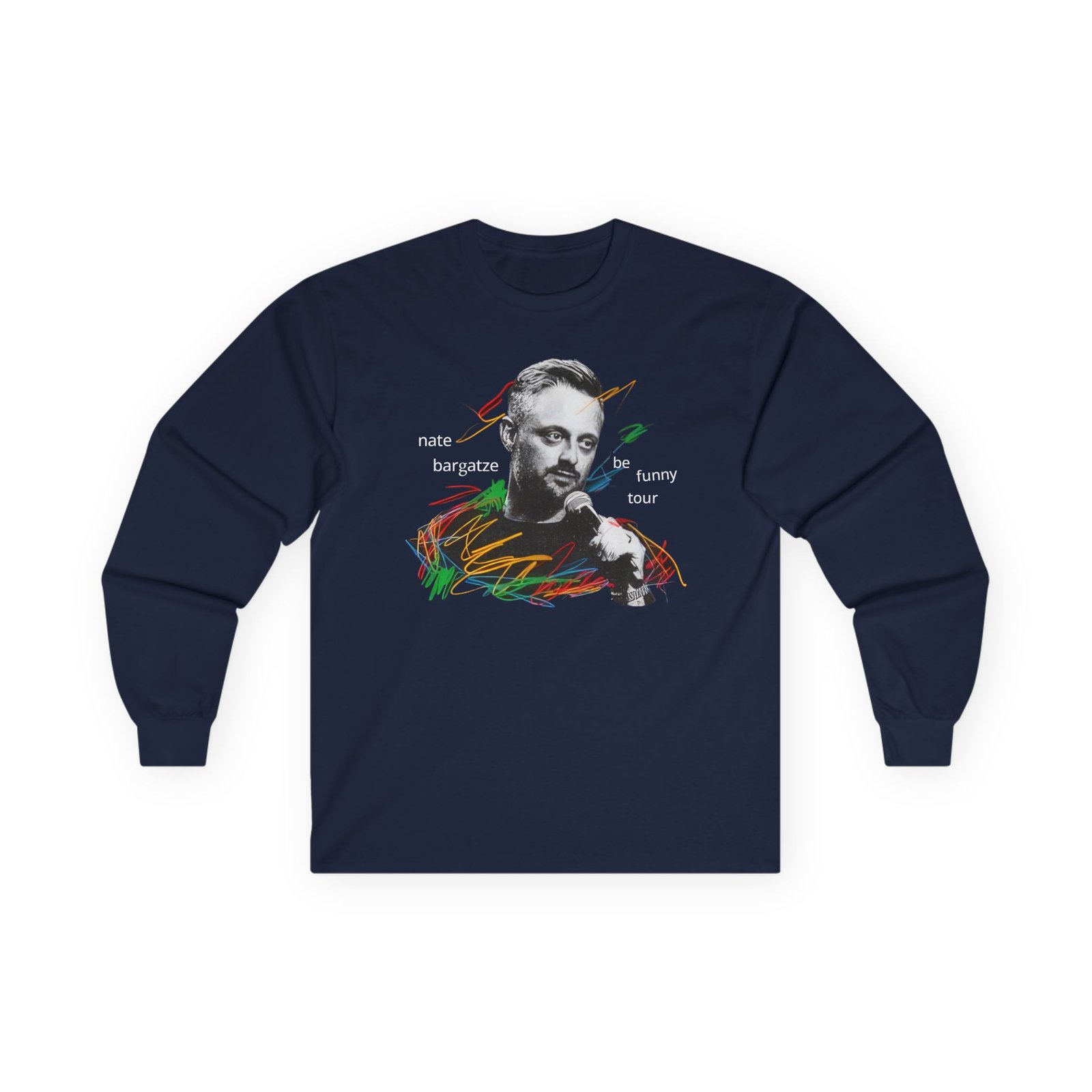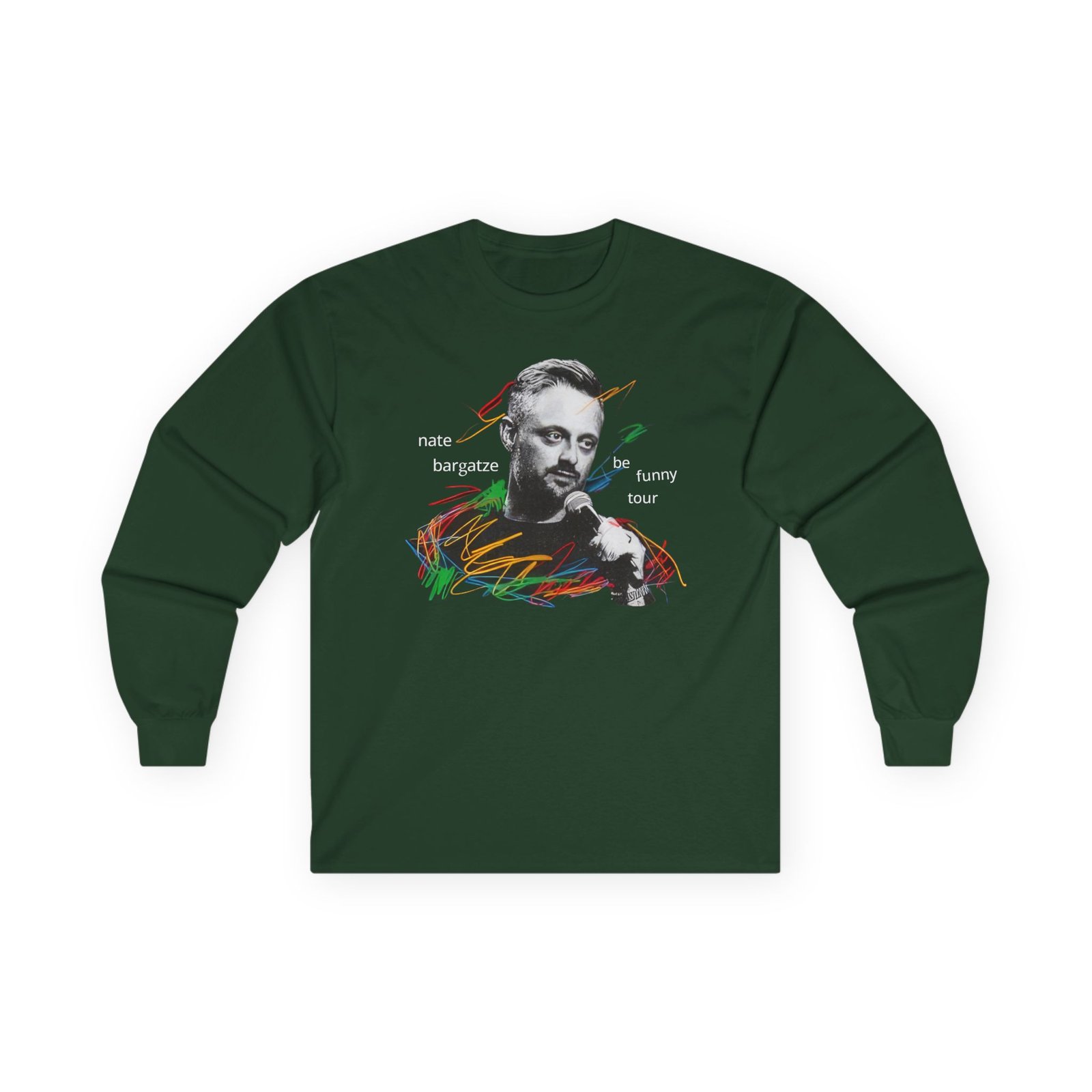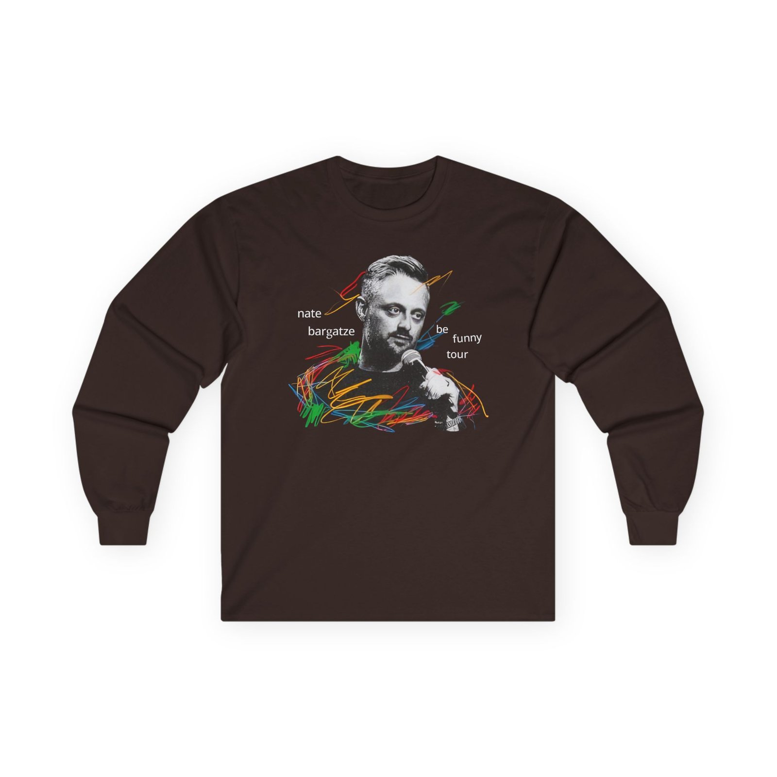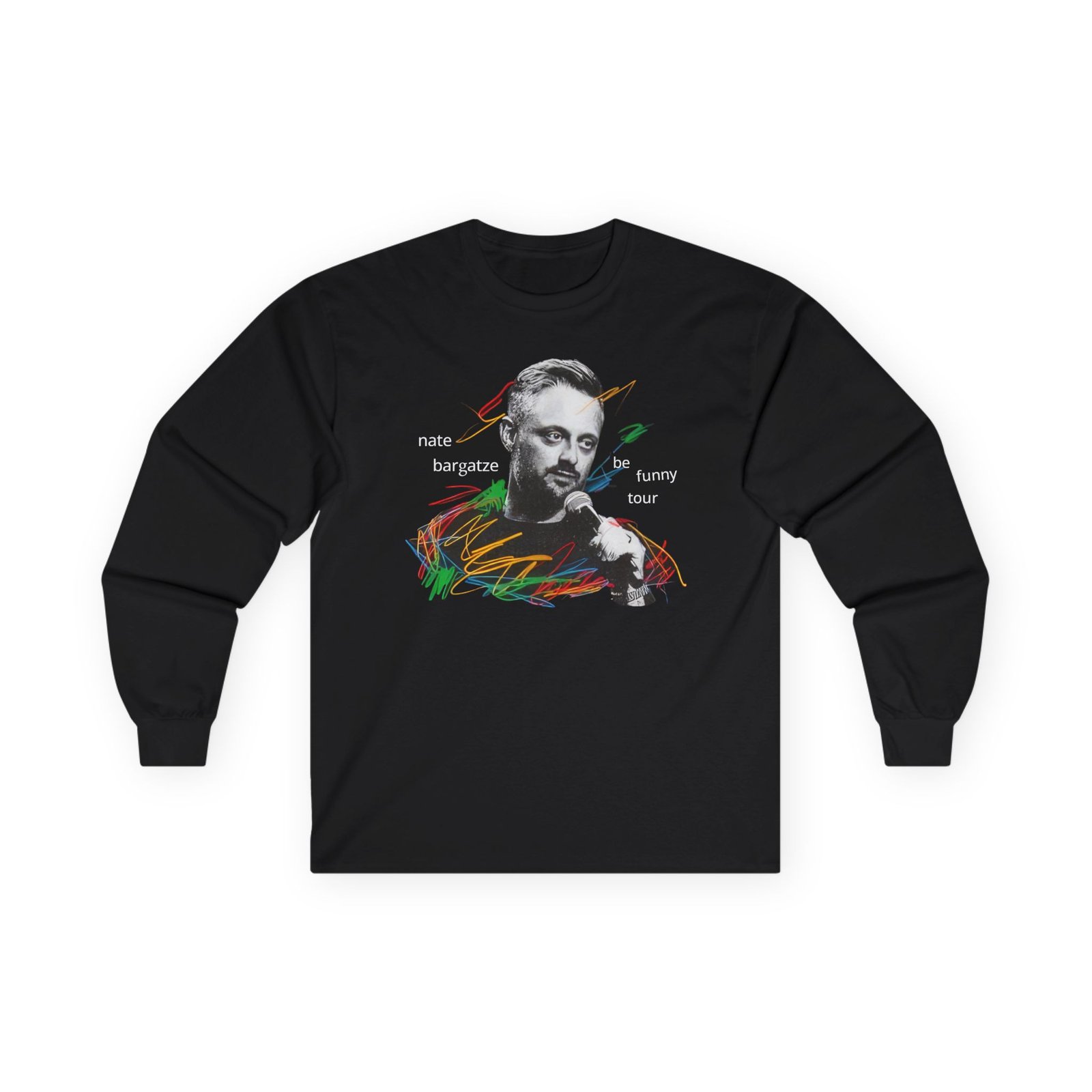 A bit more formal than a standard-issue t-shirt, the Nate Bargatze 2024 Be Funny Tour ultra cotton long sleeve tee is a clear comfort winner. The sleeves also act as a nice frame. There are no side seams. The shoulders are taped for improved durability. This makes for a good fitting around the shoulders and neck. The cotton used for these shirts is environmentally friendly.