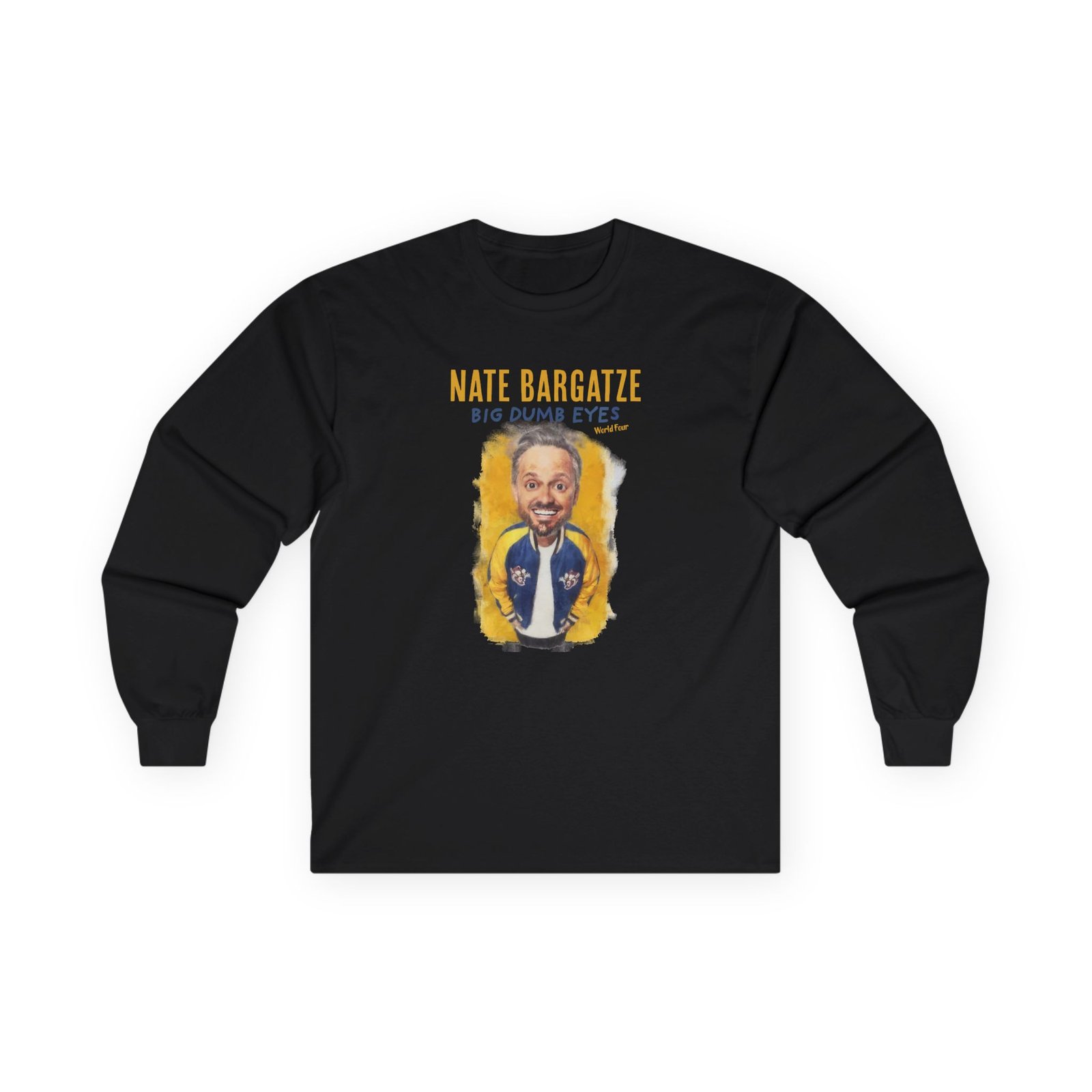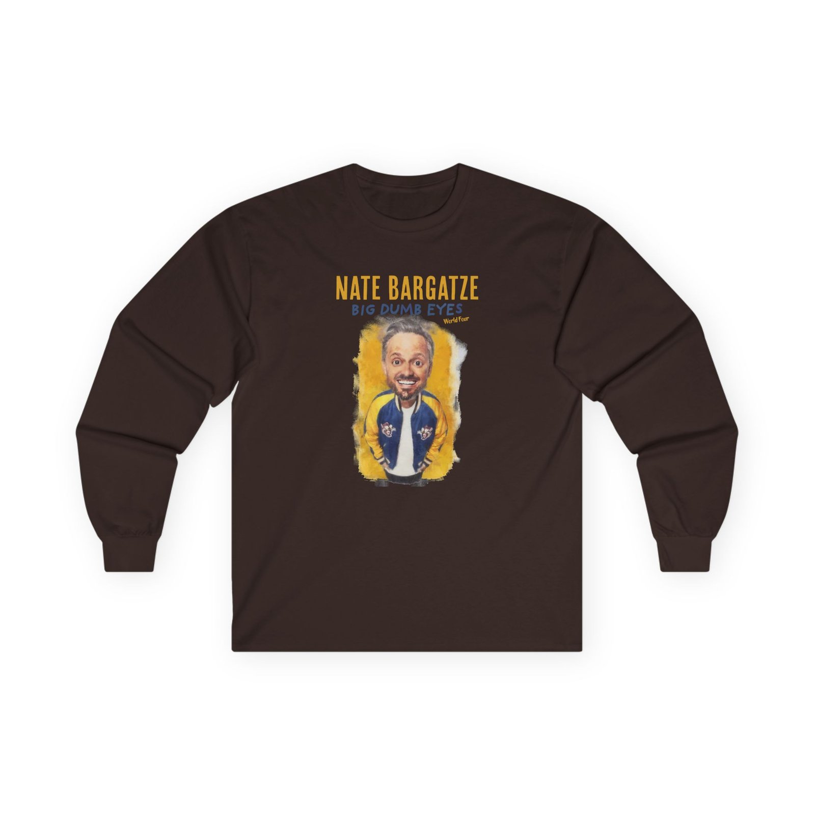 A bit more formal than a standard-issue t-shirt, the Nate Bargatze Big Dumb Eyes Tour ultra cotton long sleeve tee is a clear comfort winner. The sleeves also act as a nice frame. There are no side seams. The shoulders are taped for improved durability. This makes for a good fitting around the shoulders and neck. The cotton used for these shirts is environmentally friendly.