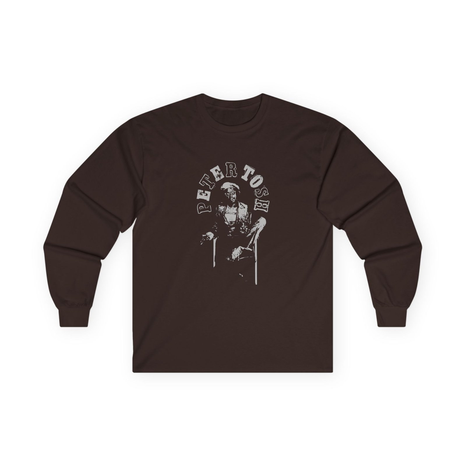 A bit more formal than a standard-issue t-shirt, the Peter Tosh Throne ultra cotton long sleeve tee is a clear comfort winner. The sleeves also act as a nice frame. There are no side seams. The shoulders are taped for improved durability. This makes for a good fitting around the shoulders and neck. The cotton used for these shirts is environmentally friendly.