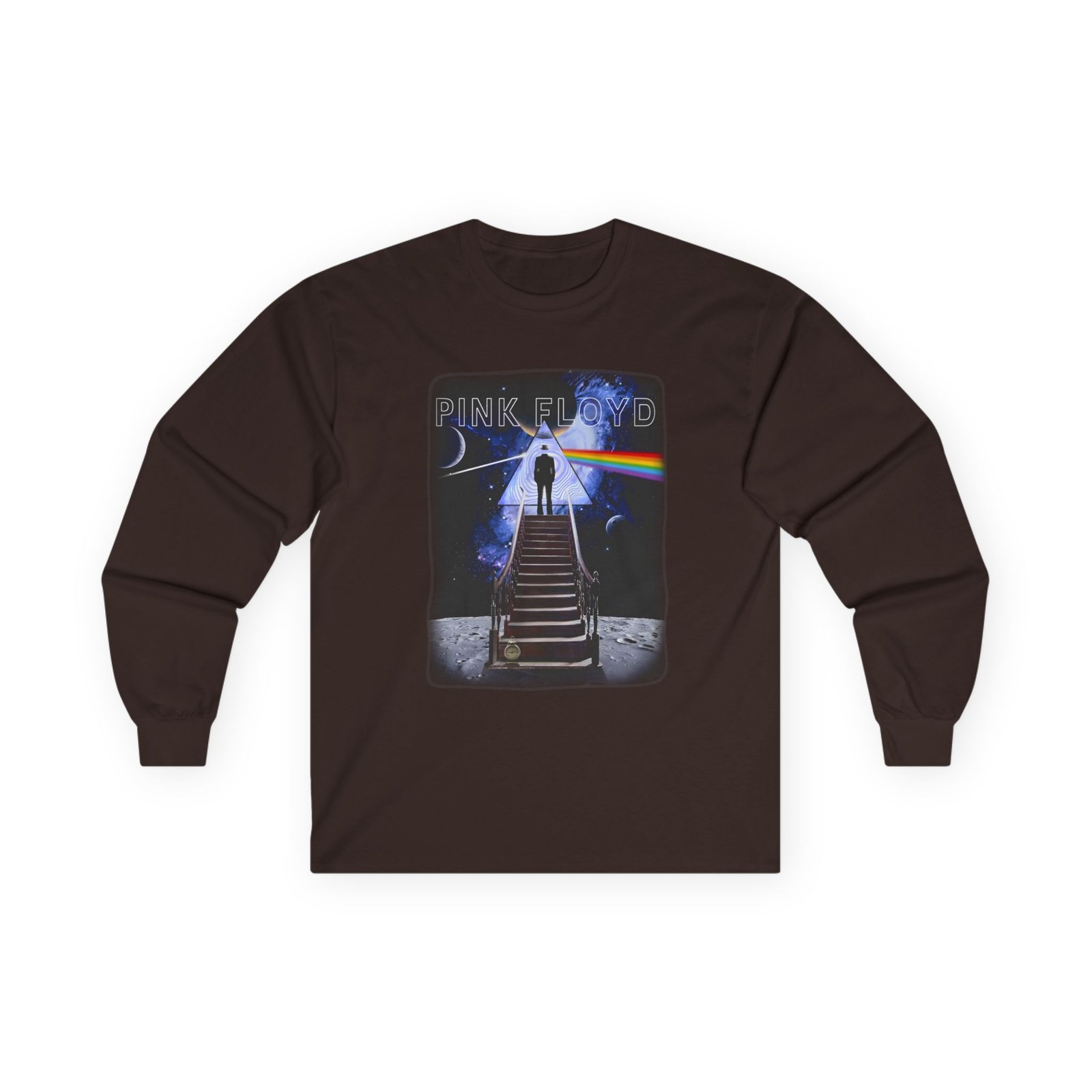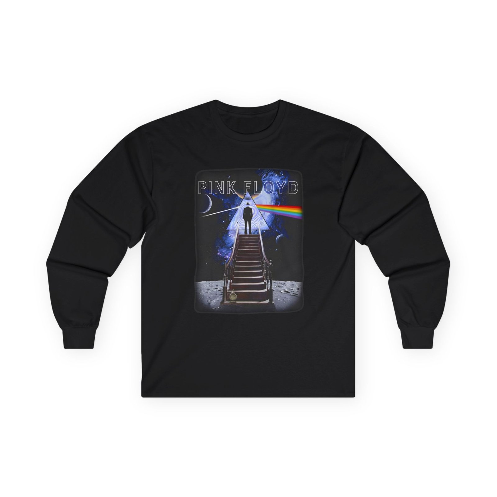 A bit more formal than a standard-issue t-shirt, the Pink Floyd Stairway to the Moon ultra cotton long sleeve tee is a clear comfort winner. The sleeves also act as a nice frame. There are no side seams. The shoulders are taped for improved durability. This makes for a good fitting around the shoulders and neck. The cotton used for these shirts is environmentally friendly.