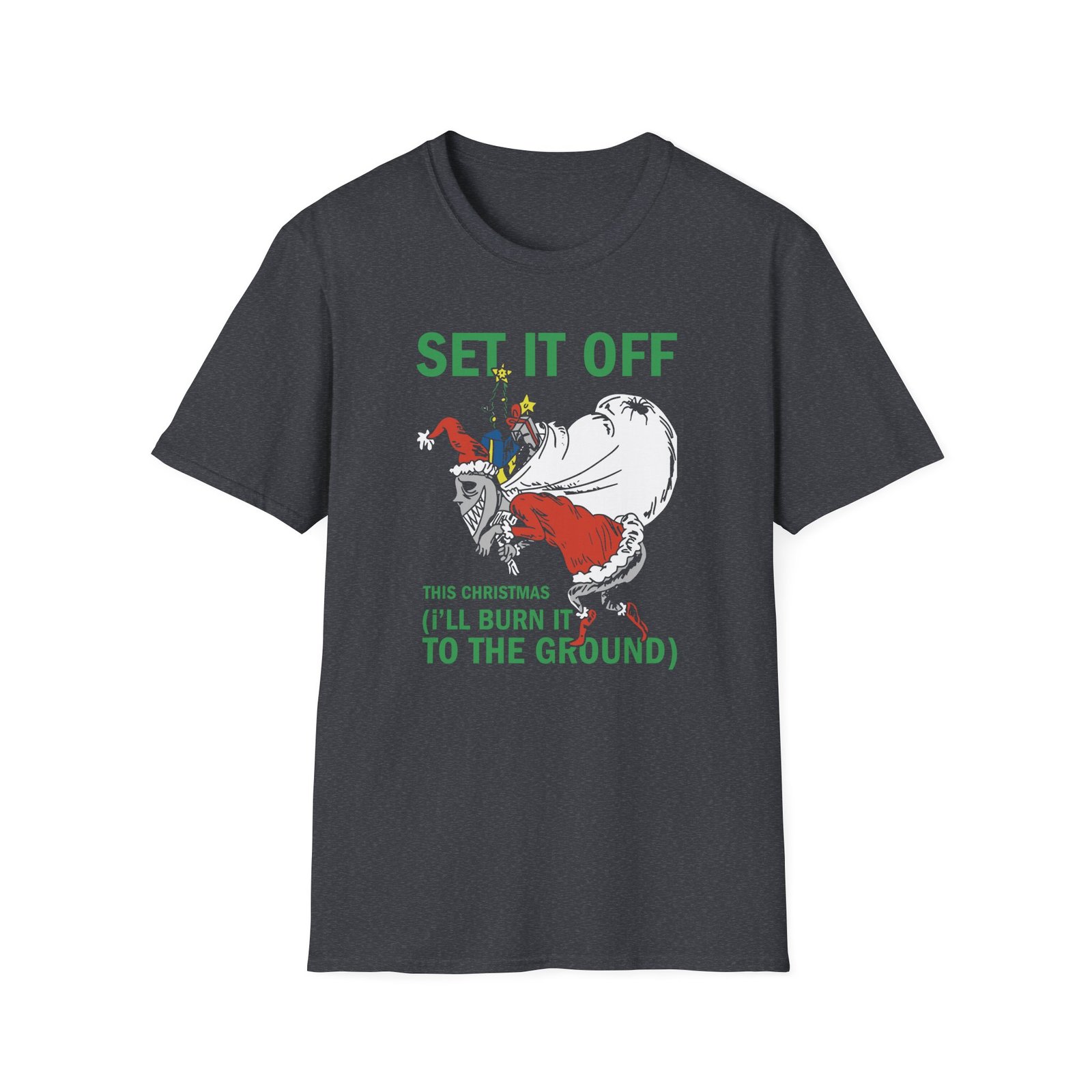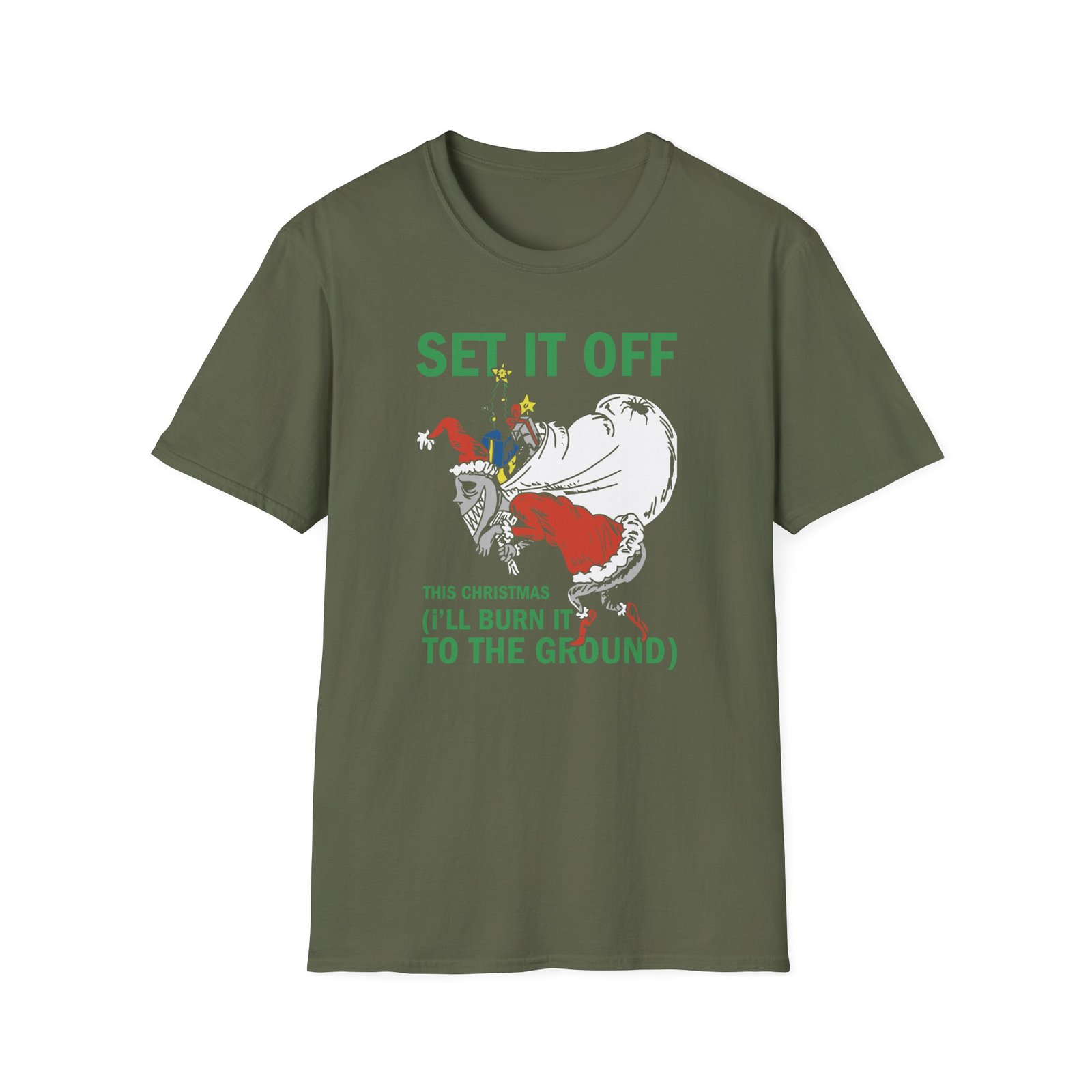 The Set It Off Grinch unisex soft-style t-shirt puts a new spin on casual comfort. Made from very soft materials, this tee is 100% cotton for solid colors. Heather colors and sports grey include polyester. The shoulders have twill tape for improved durability. There are no side seams. The collar is made with ribbed knitting to prevent curling damage.