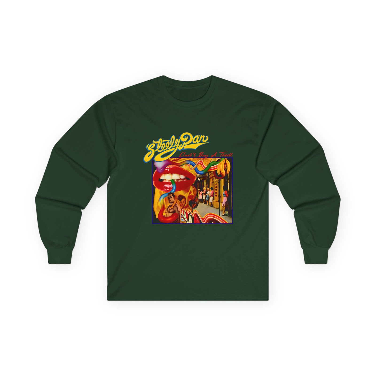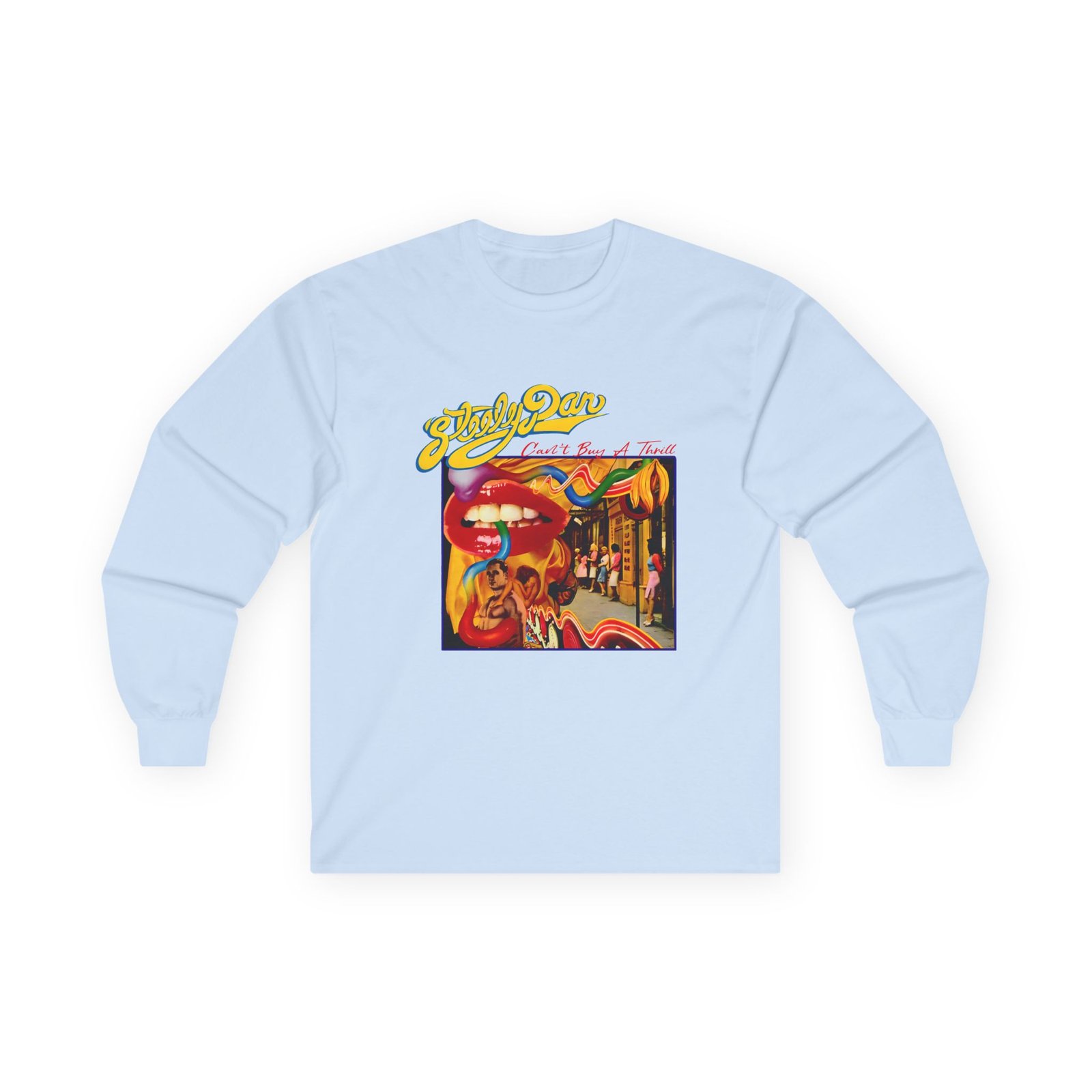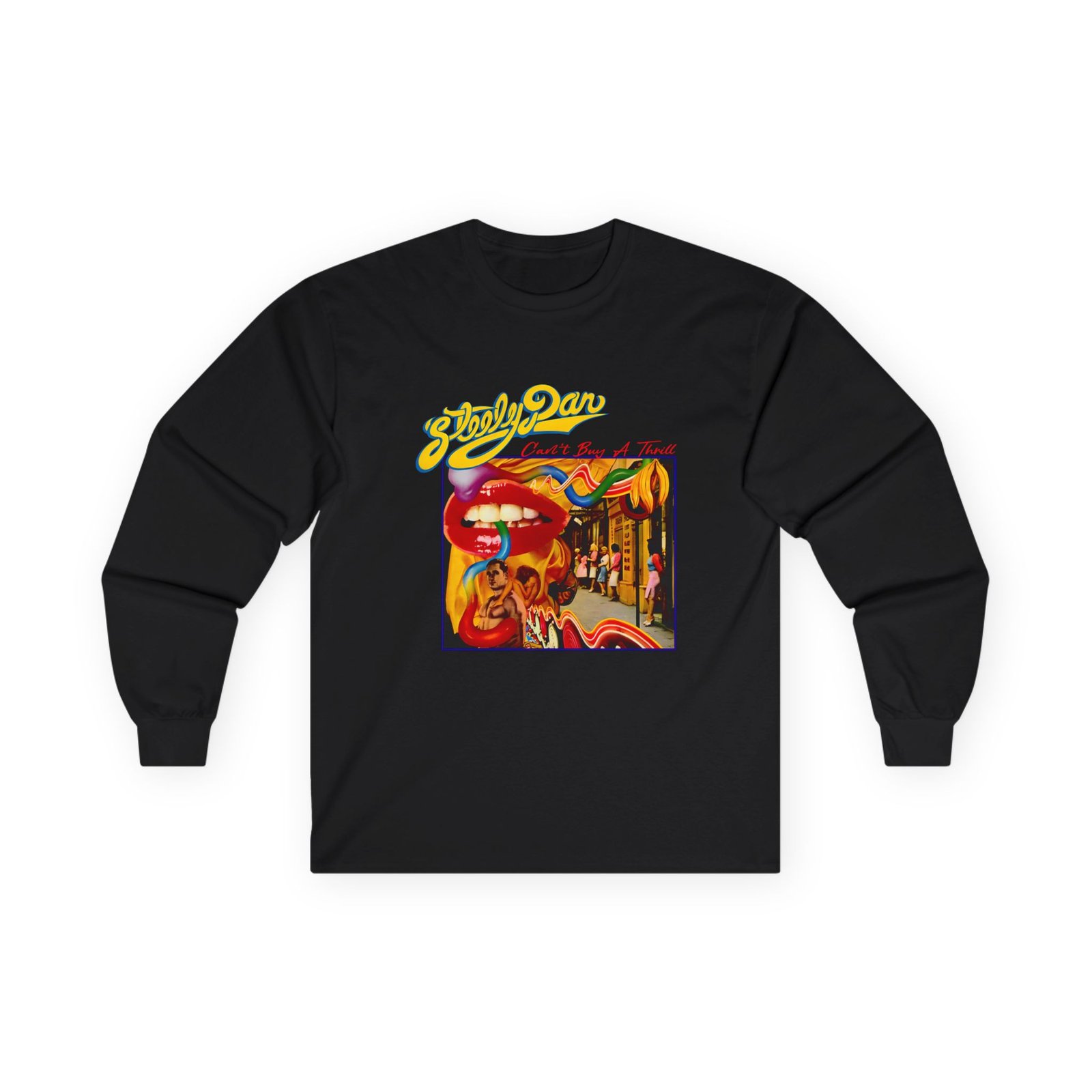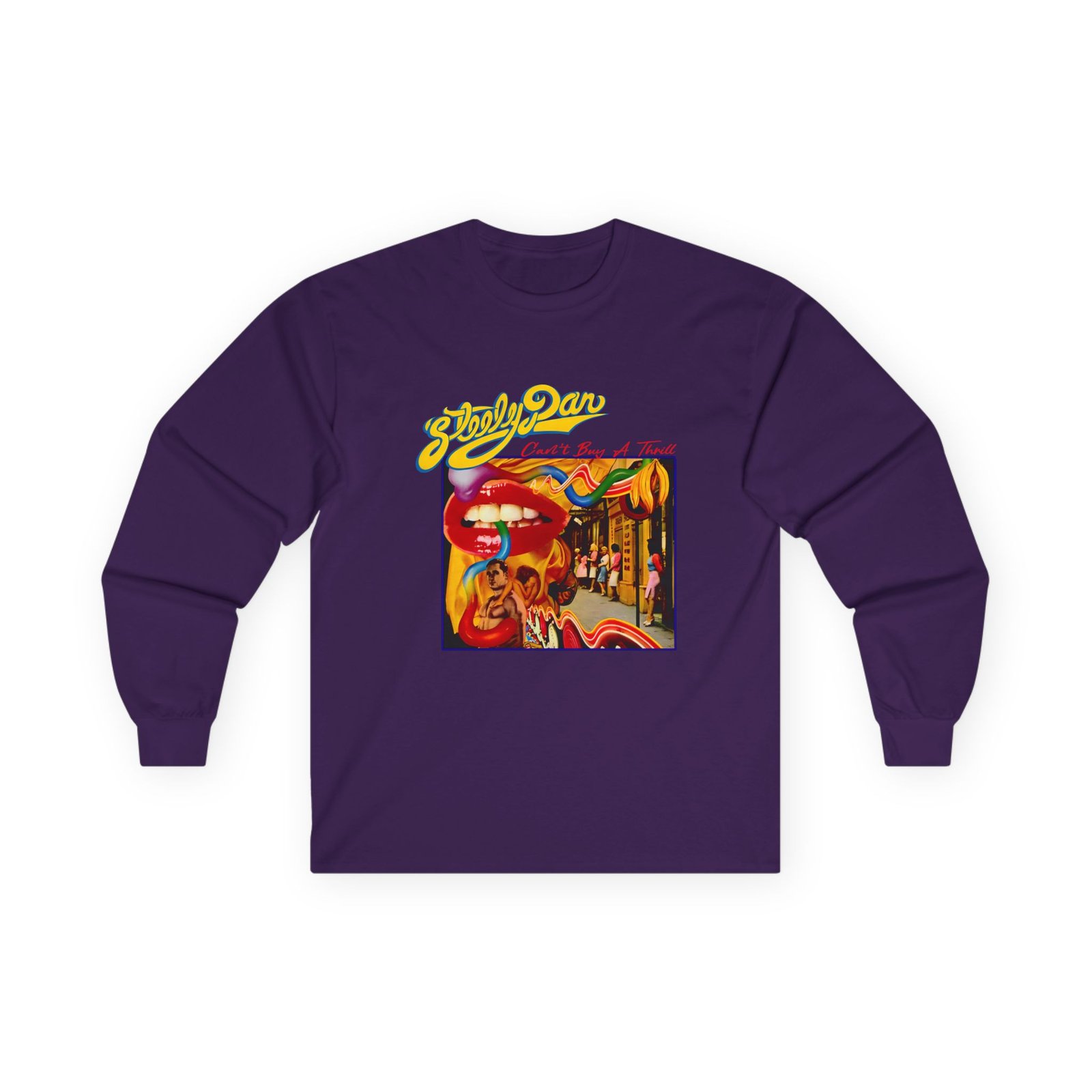 A bit more formal than a standard-issue t-shirt, the Steely Dan Can't Buy a Thrill Album Cover ultra cotton long sleeve tee is a clear comfort winner. The sleeves also act as a nice frame. There are no side seams. The shoulders are taped for improved durability. This makes for a good fitting around the shoulders and neck. The cotton used for these shirts is environmentally friendly.