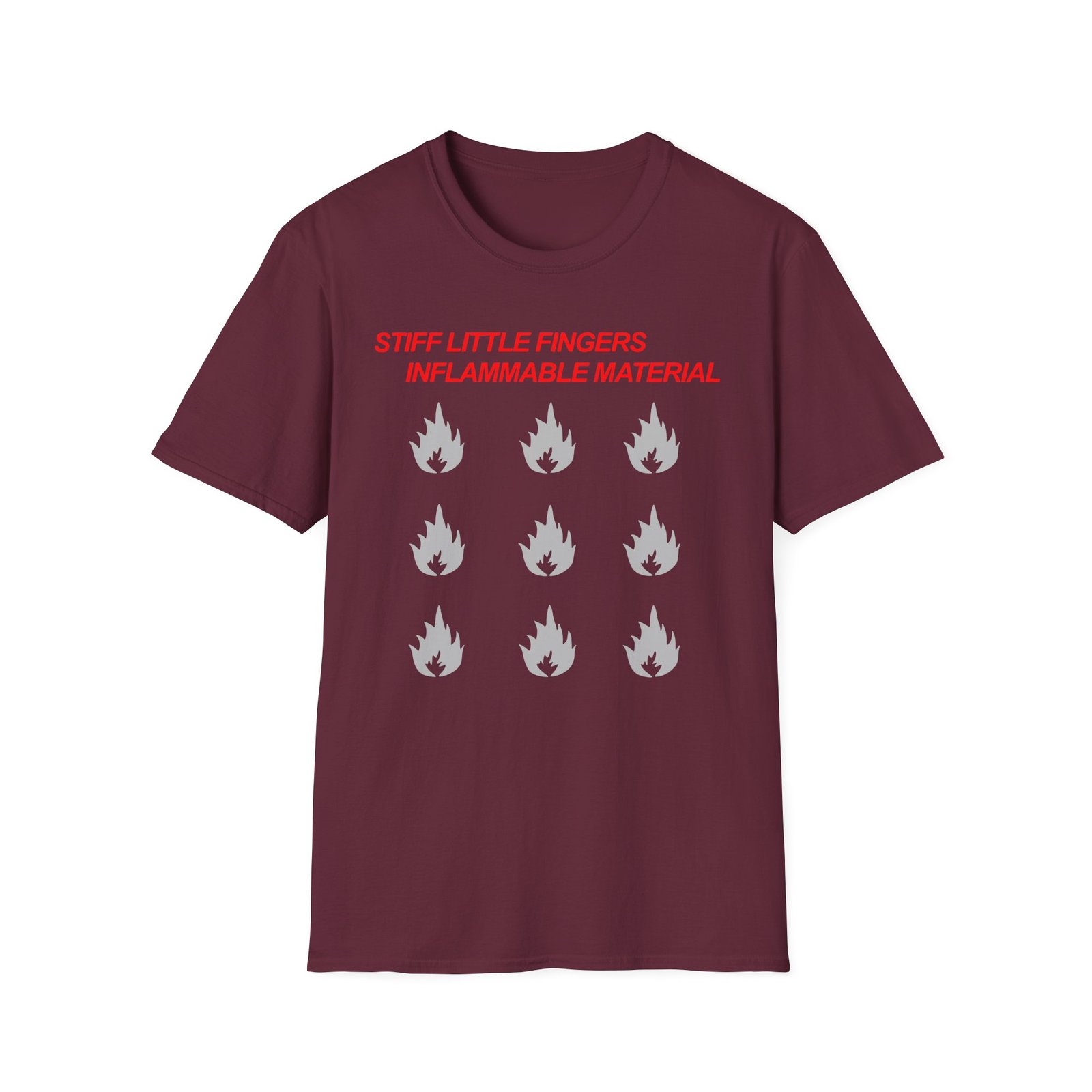 The Stiff Little Fingers Inflammable Material unisex soft-style t-shirt puts a new spin on casual comfort. Made from very soft materials, this tee is 100% cotton for solid colors. Heather colors and sports grey include polyester. The shoulders have twill tape for improved durability. There are no side seams. The collar is made with ribbed knitting to prevent curling damage.