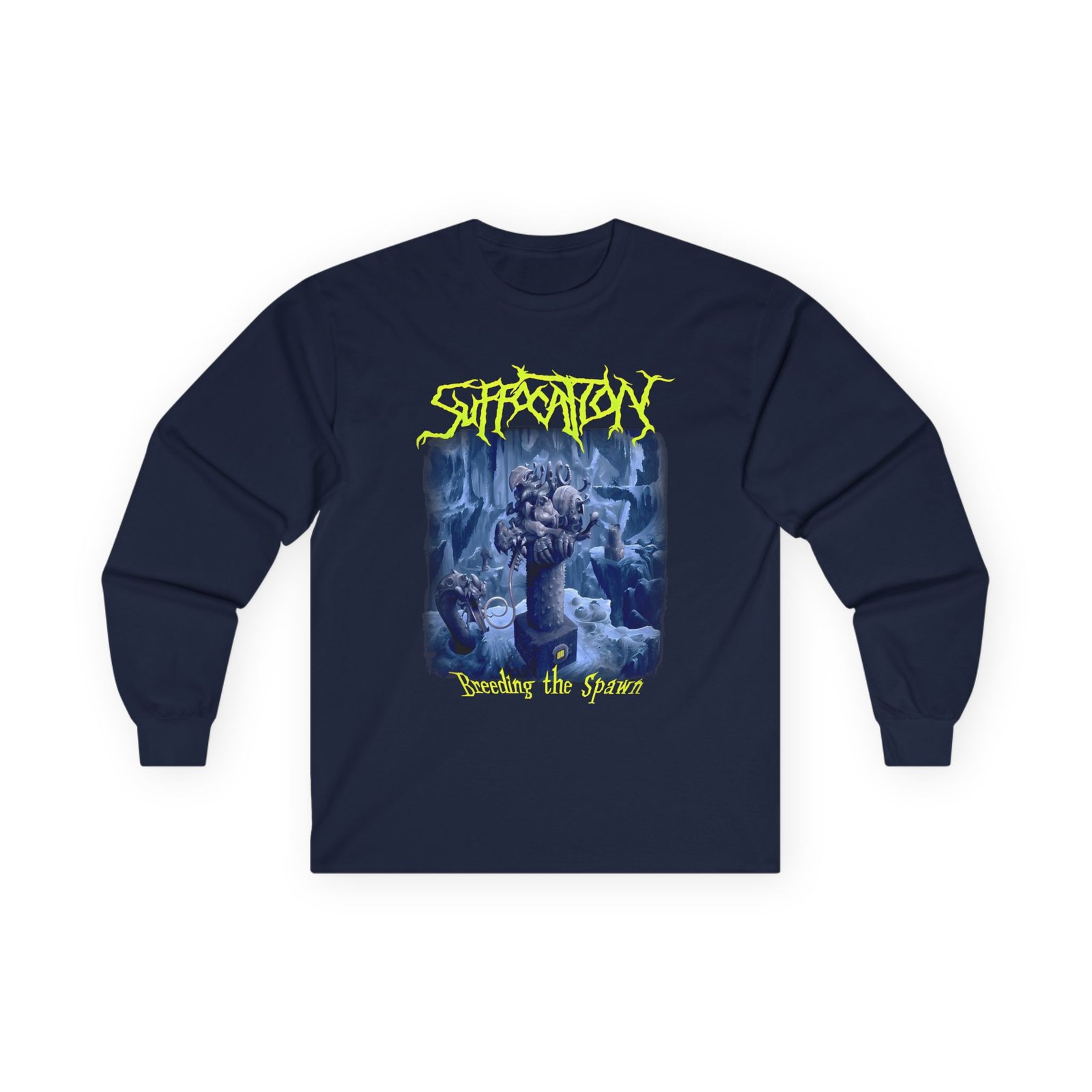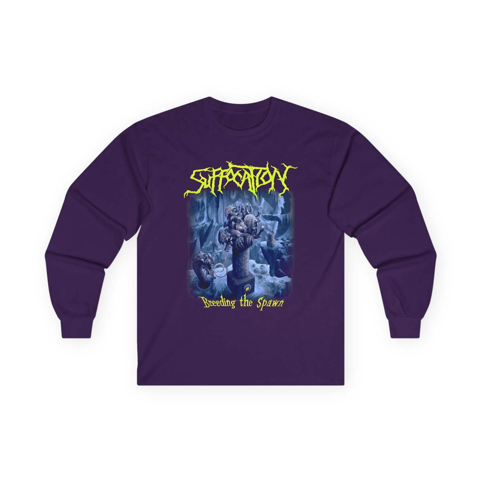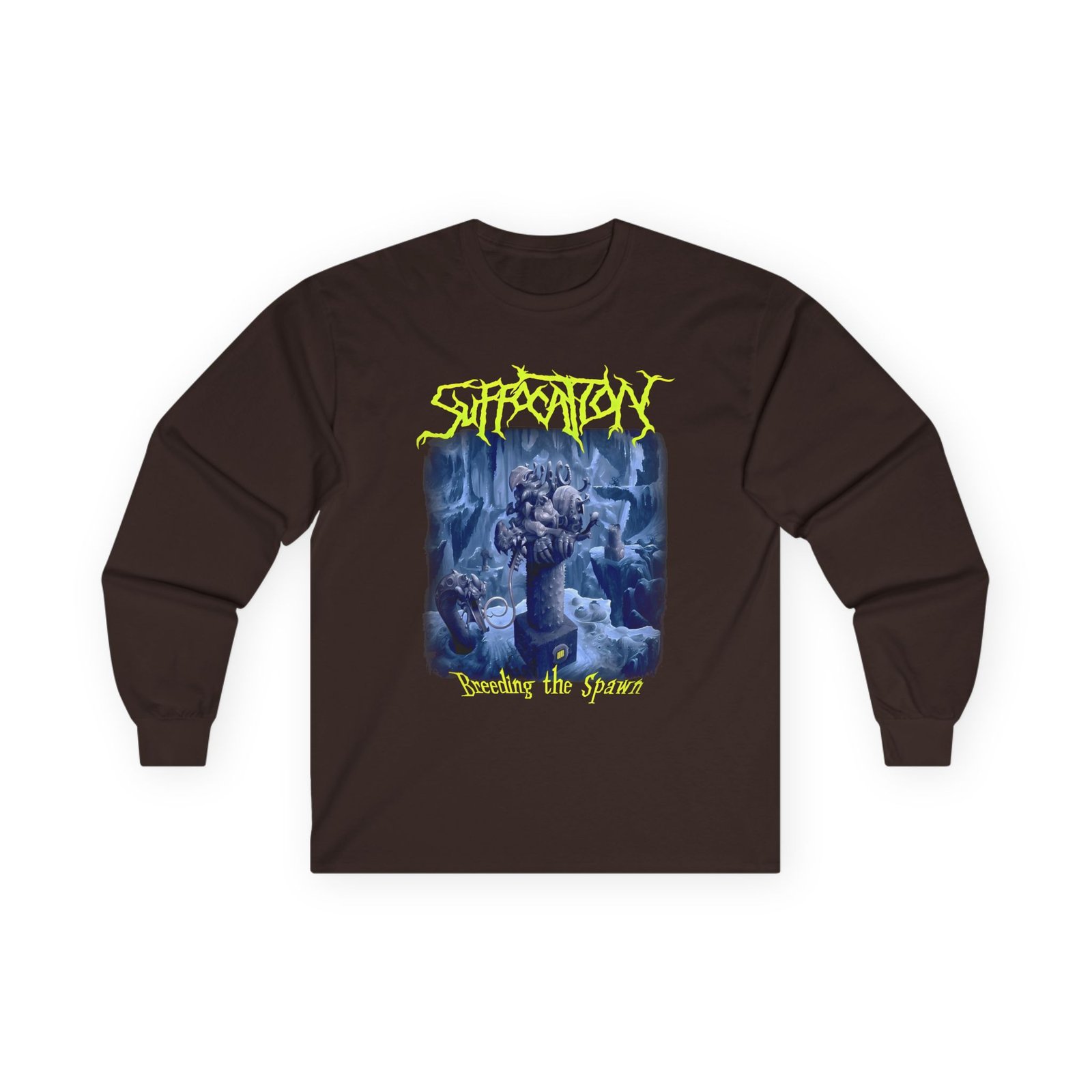 A bit more formal than a standard-issue t-shirt, the Suffocation Breeding The Spawn ultra cotton long sleeve tee is a clear comfort winner. The sleeves also act as a nice frame. There are no side seams. The shoulders are taped for improved durability. This makes for a good fitting around the shoulders and neck. The cotton used for these shirts is environmentally friendly.