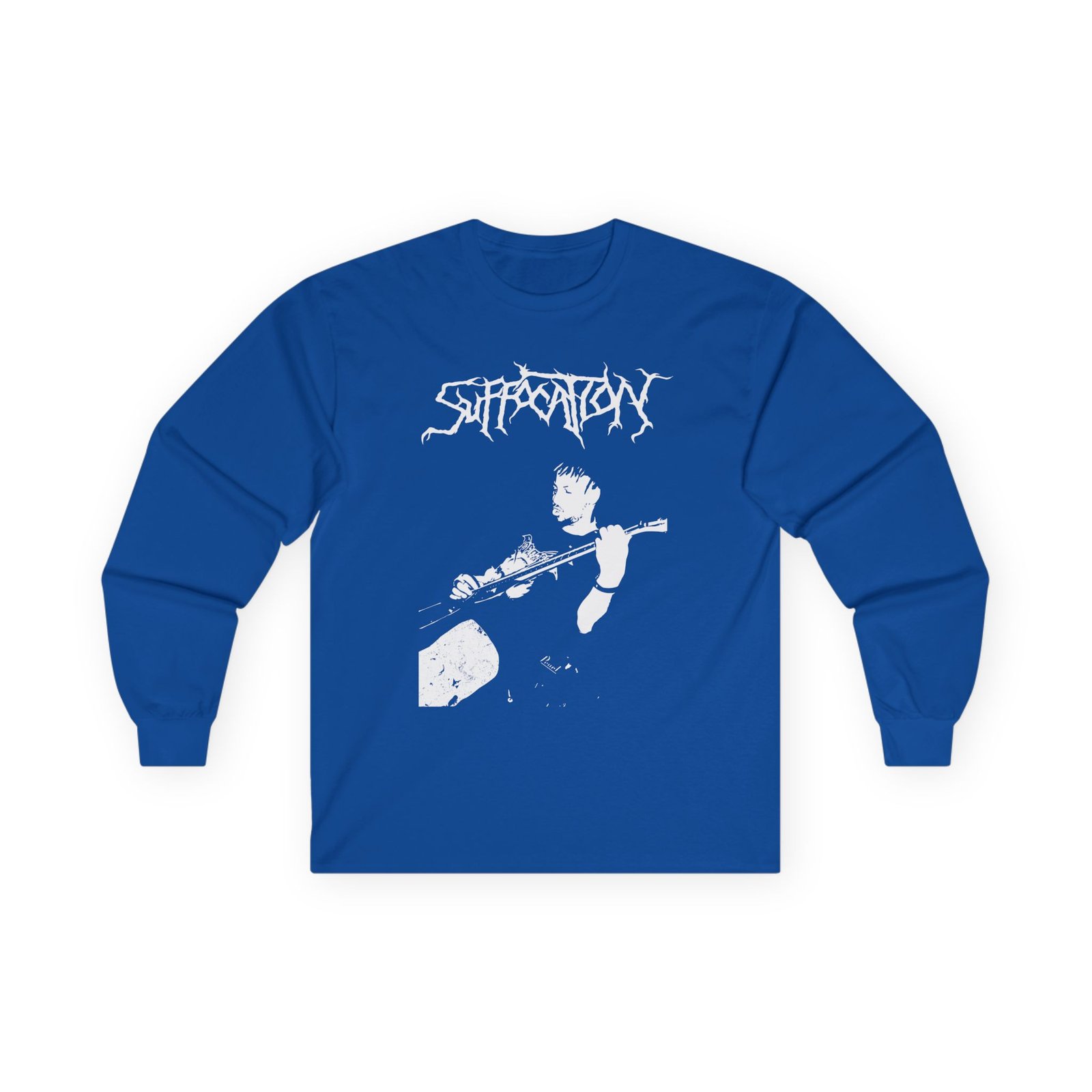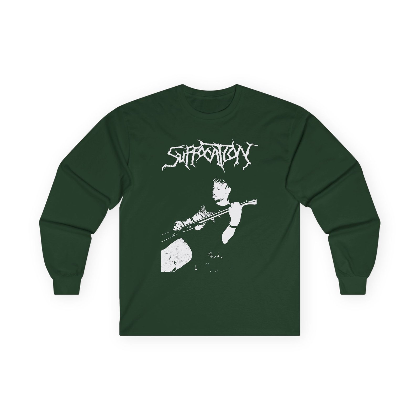 A bit more formal than a standard-issue t-shirt, the Suffocation Hobbs Slam ultra cotton long sleeve tee is a clear comfort winner. The sleeves also act as a nice frame. There are no side seams. The shoulders are taped for improved durability. This makes for a good fitting around the shoulders and neck. The cotton used for these shirts is environmentally friendly.