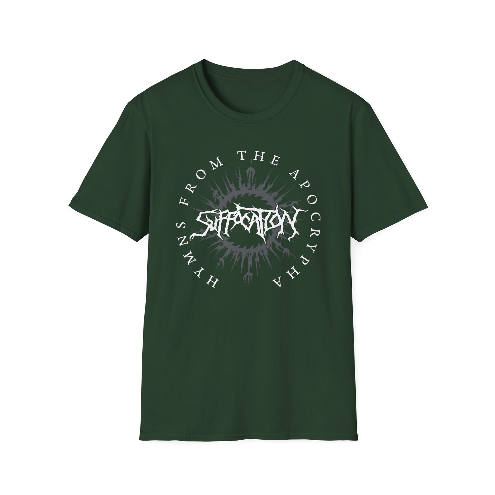 The Suffocation Hymns Logo unisex soft-style t-shirt puts a new spin on casual comfort. Made from very soft materials, this tee is 100% cotton for solid colors. Heather colors and sports grey include polyester. The shoulders have twill tape for improved durability. There are no side seams. The collar is made with ribbed knitting to prevent curling damage.