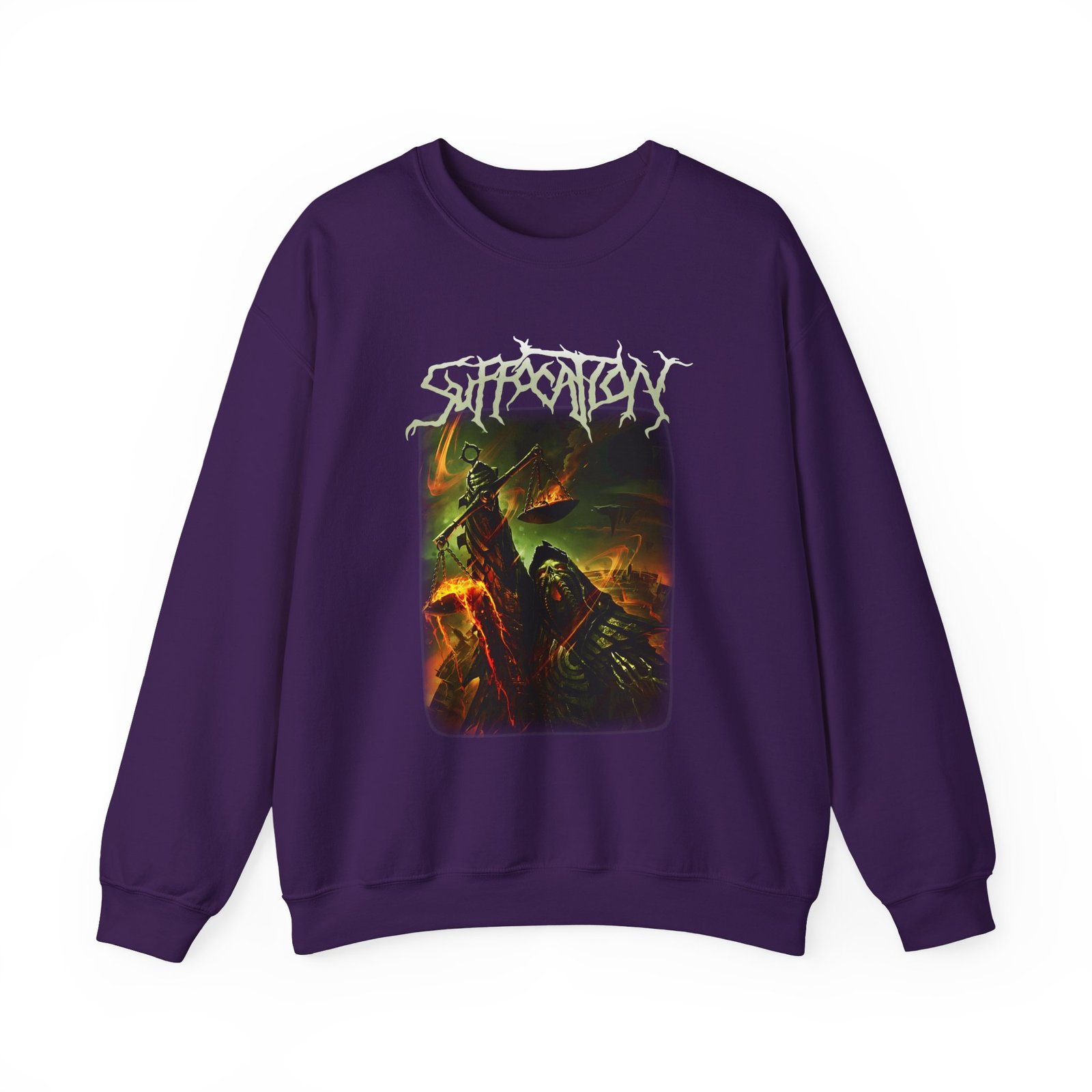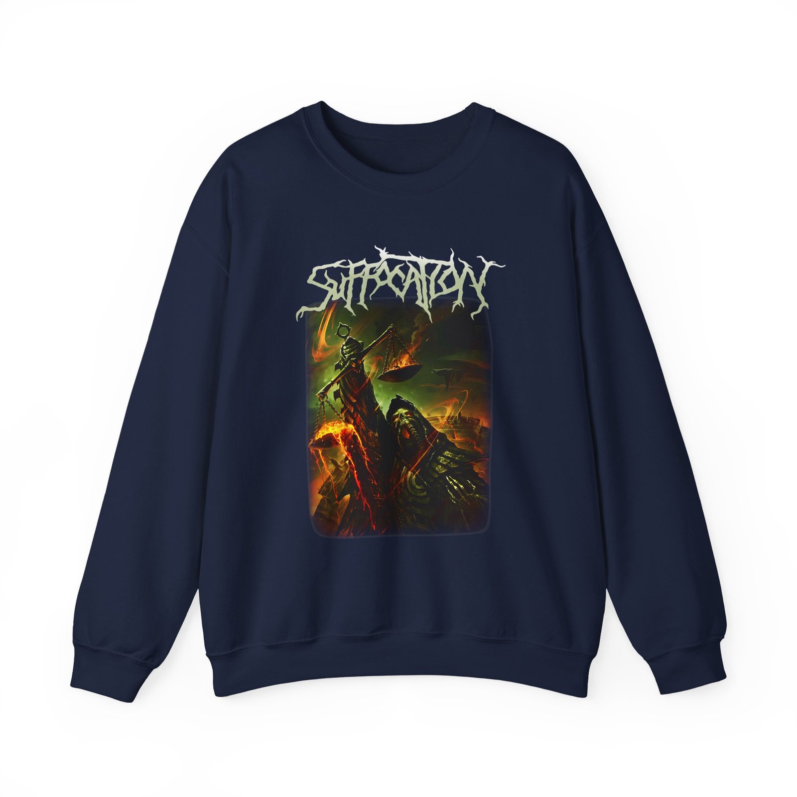 Ideal for any situation, a Suffocation Pinnacle Of Bedlam unisex heavy blend crewneck sweatshirt is pure comfort. These garments are made from polyester and cotton. This combination helps designs come out looking fresh and beautiful. The collar is ribbed knit, so it retains its shape even after washing. There are no itchy side seams on these sweaters.