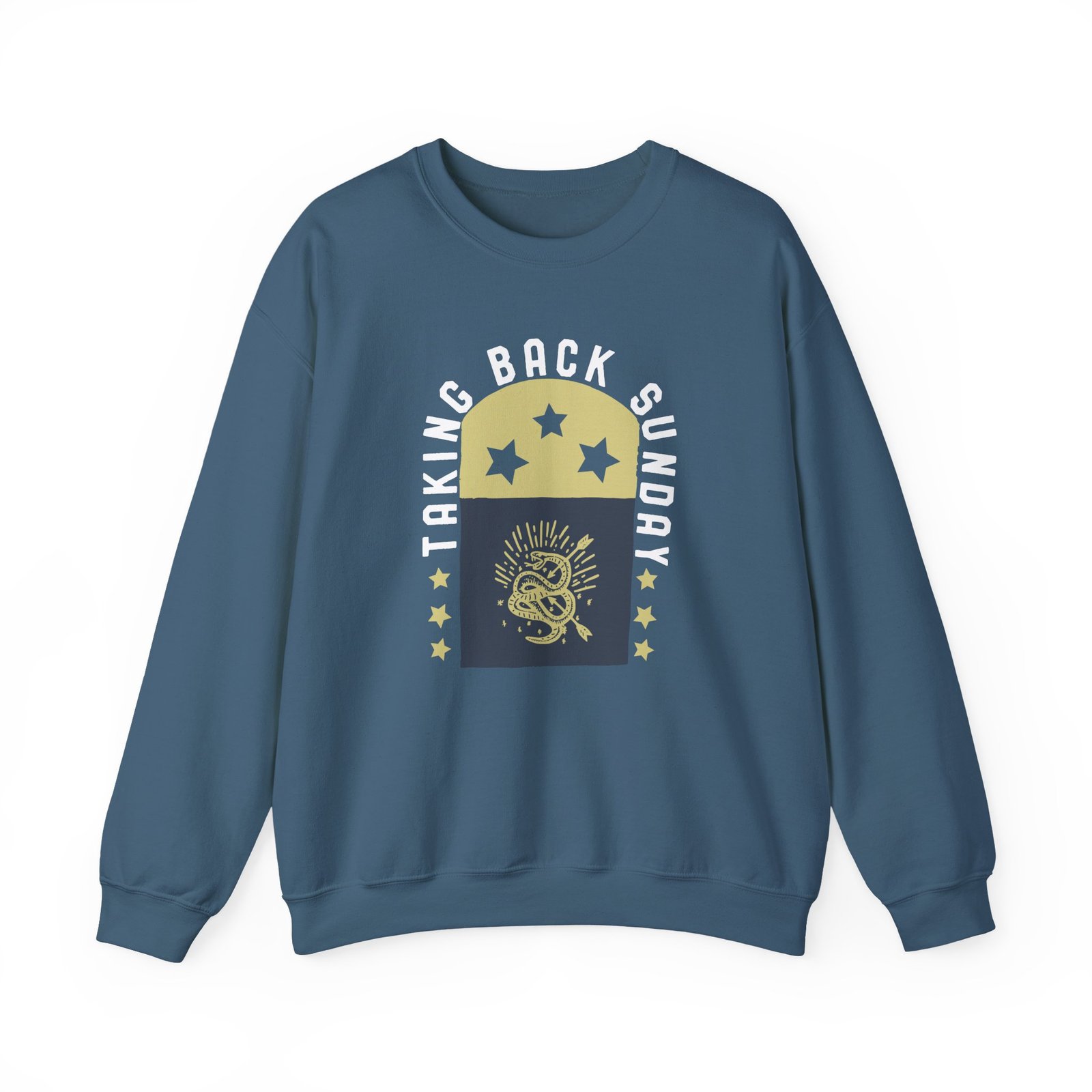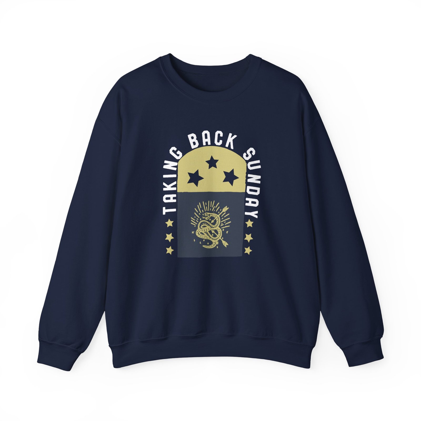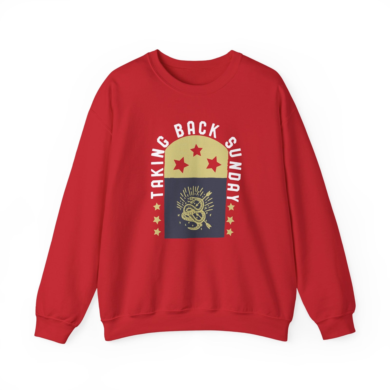 Ideal for any situation, a Taking Back Sunday Star Flag unisex heavy blend crewneck sweatshirt is pure comfort. These garments are made from polyester and cotton. This combination helps designs come out looking fresh and beautiful. The collar is ribbed knit, so it retains its shape even after washing. There are no itchy side seams on these sweaters.