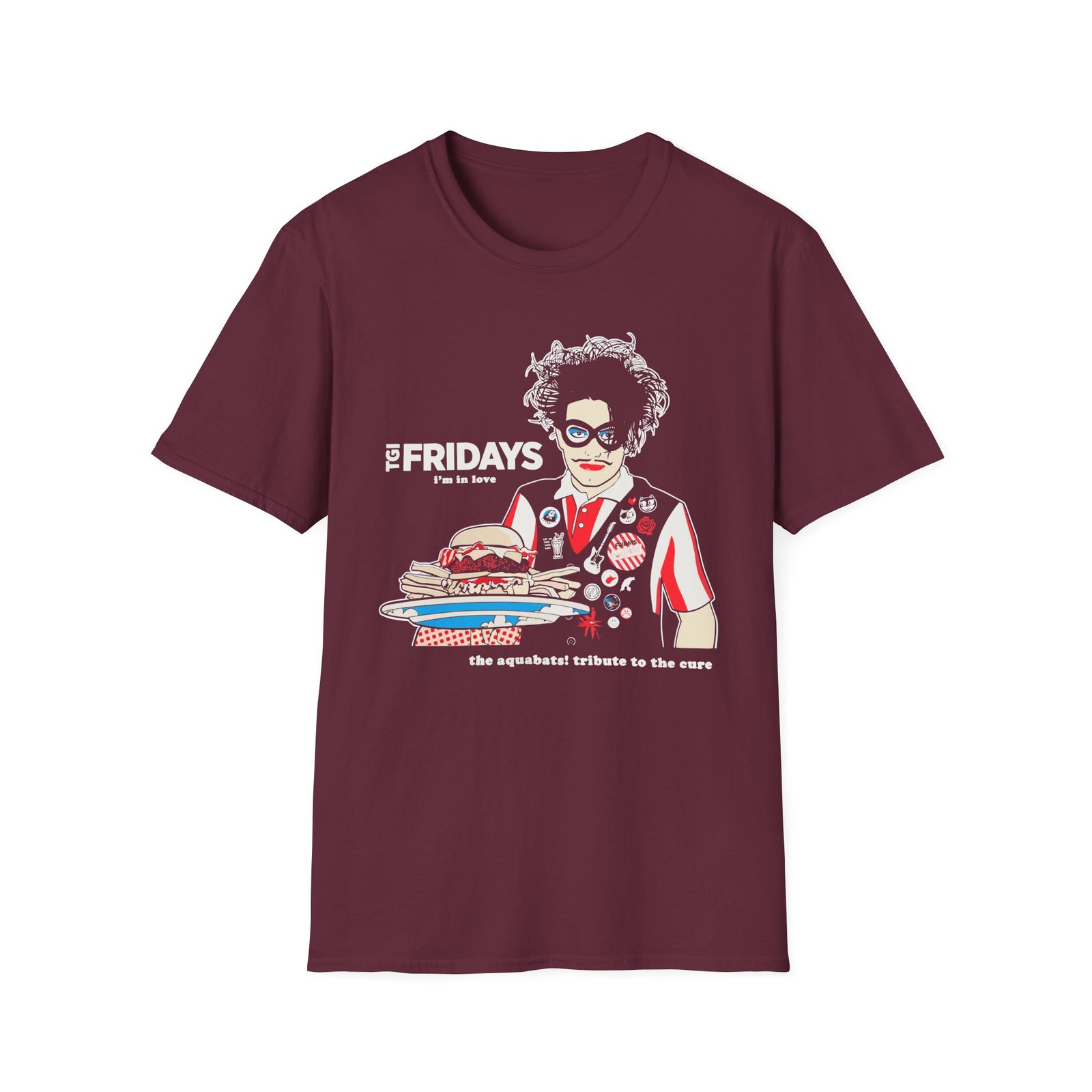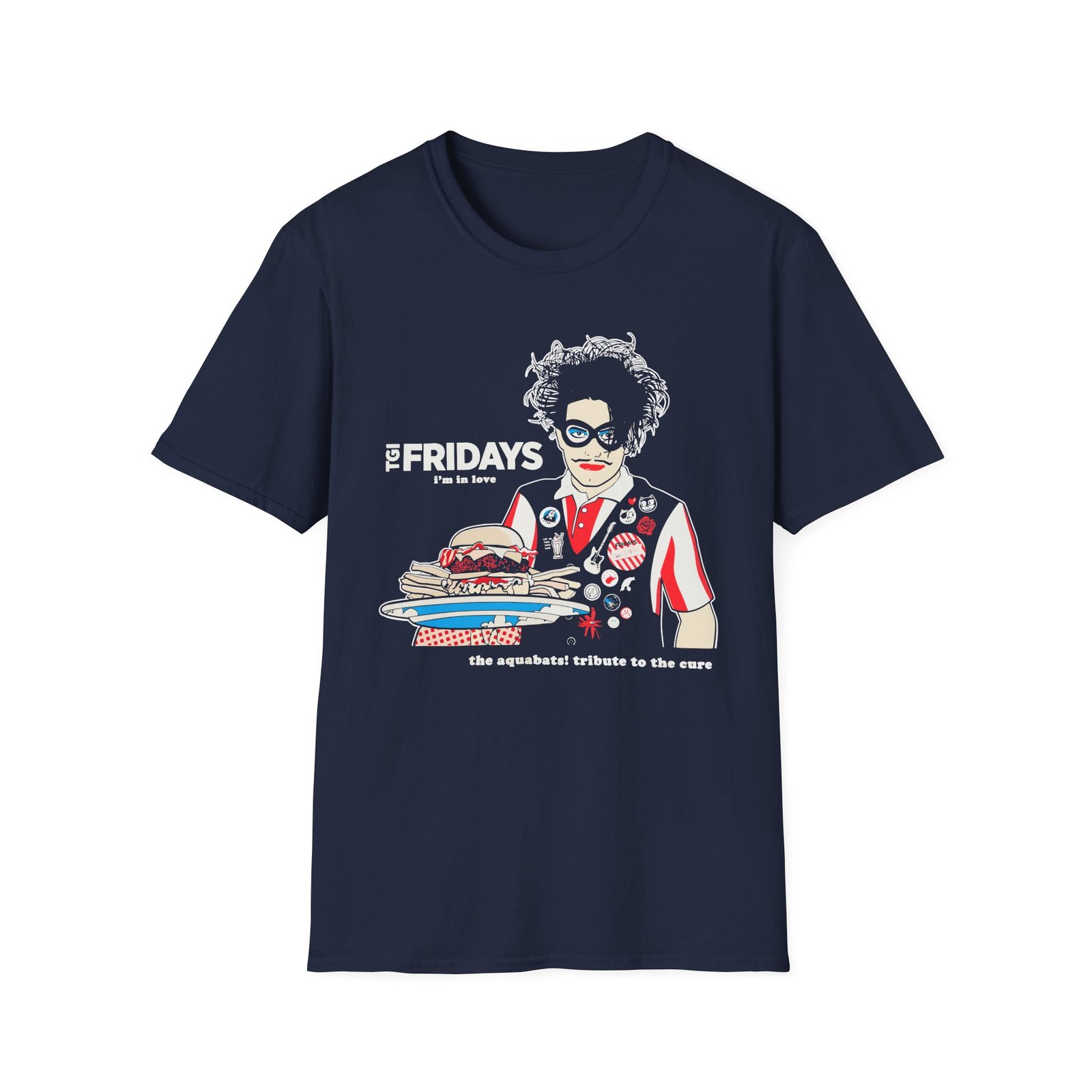 The The Aquabats TGI Fridays I'm In Love Tribute To The Cure unisex soft-style t-shirt puts a new spin on casual comfort. Made from very soft materials, this tee is 100% cotton for solid colors. Heather colors and sports grey include polyester. The shoulders have twill tape for improved durability. There are no side seams. The collar is made with ribbed knitting to prevent curling damage.
