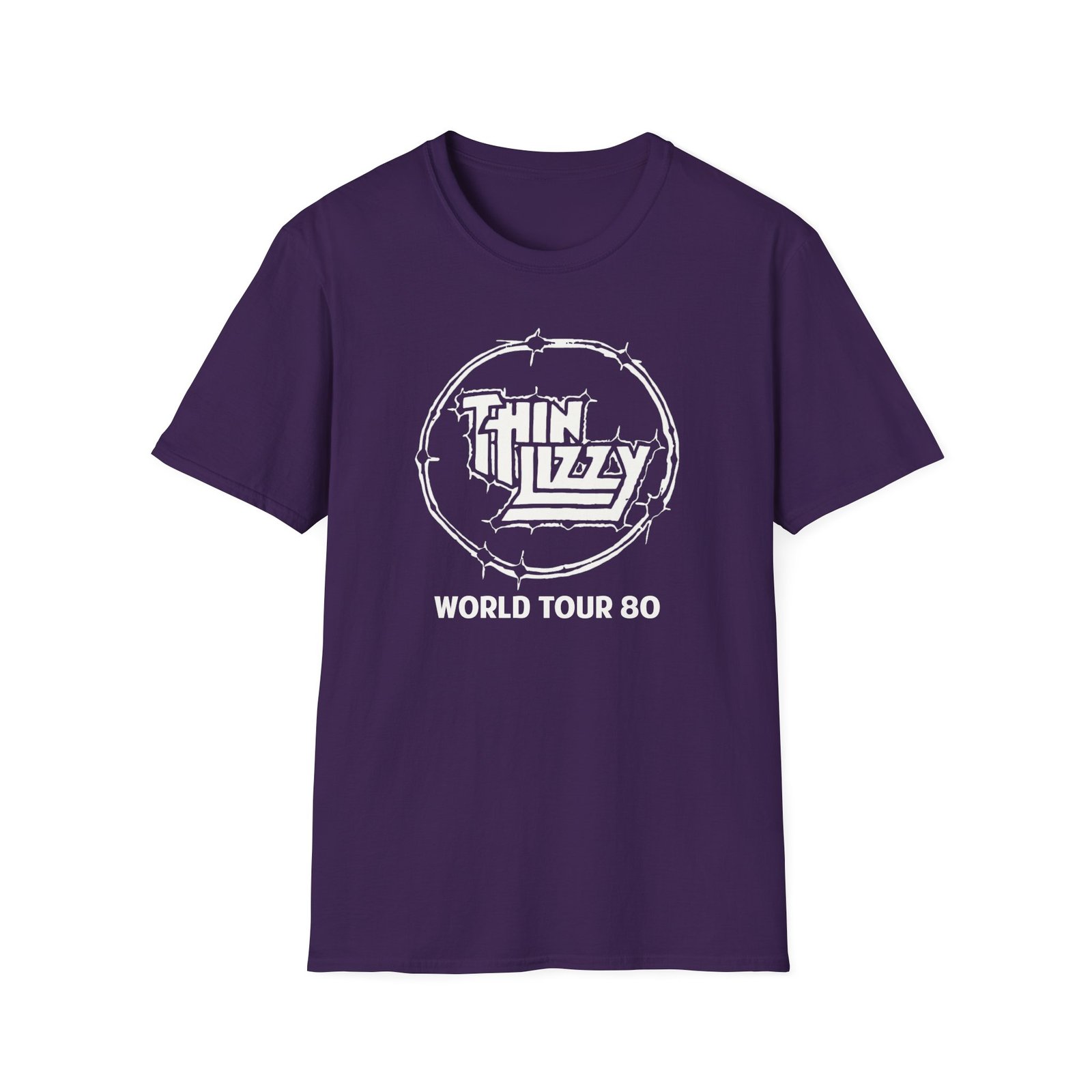 The Thin Lizzy World Tour 80 unisex soft-style t-shirt puts a new spin on casual comfort. Made from very soft materials, this tee is 100% cotton for solid colors. Heather colors and sports grey include polyester. The shoulders have twill tape for improved durability. There are no side seams. The collar is made with ribbed knitting to prevent curling damage.