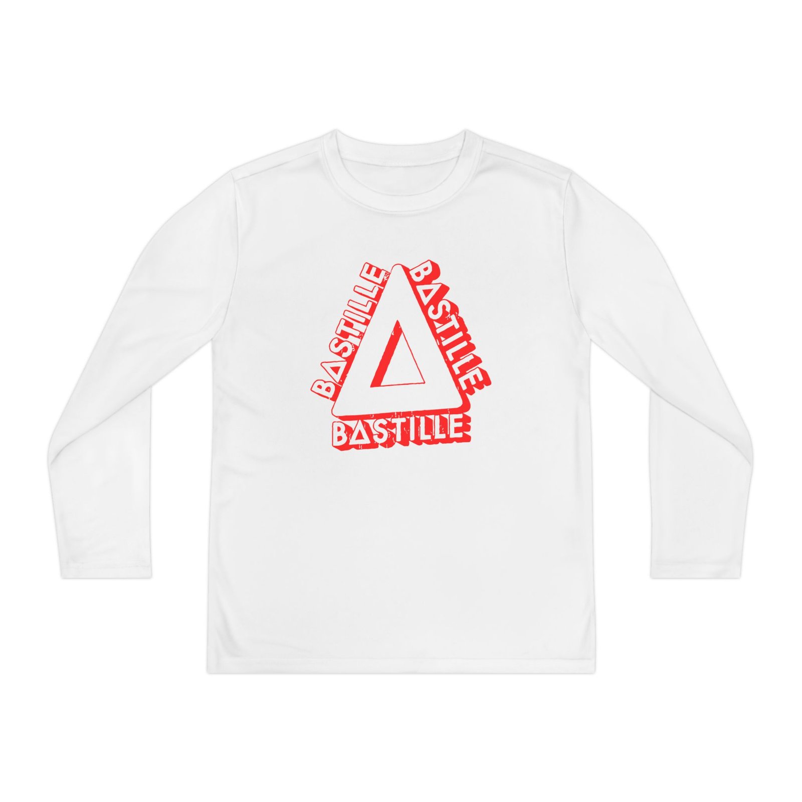 A lightweight Bastille 3d Triangle long-sleeve designed for active kids who lean into darker, atmospheric style. The shirt’s smooth, moisture-wicking polyester keeps movement unhindered and dries fast after practice or a day outside. The front art drops into a stormy, grayscale scene crowned by a jagged flash of lightning and moody gothic lettering — a bold, quietly rebellious statement that pairs with skate nights, band practice, or just hanging with friends. The athletic cut skims the body for an energetic silhouette, while the tear-away label keeps comfort high. Warmth is balanced with breathability, so it layers easily under a jacket or wears solo on cooler evenings.