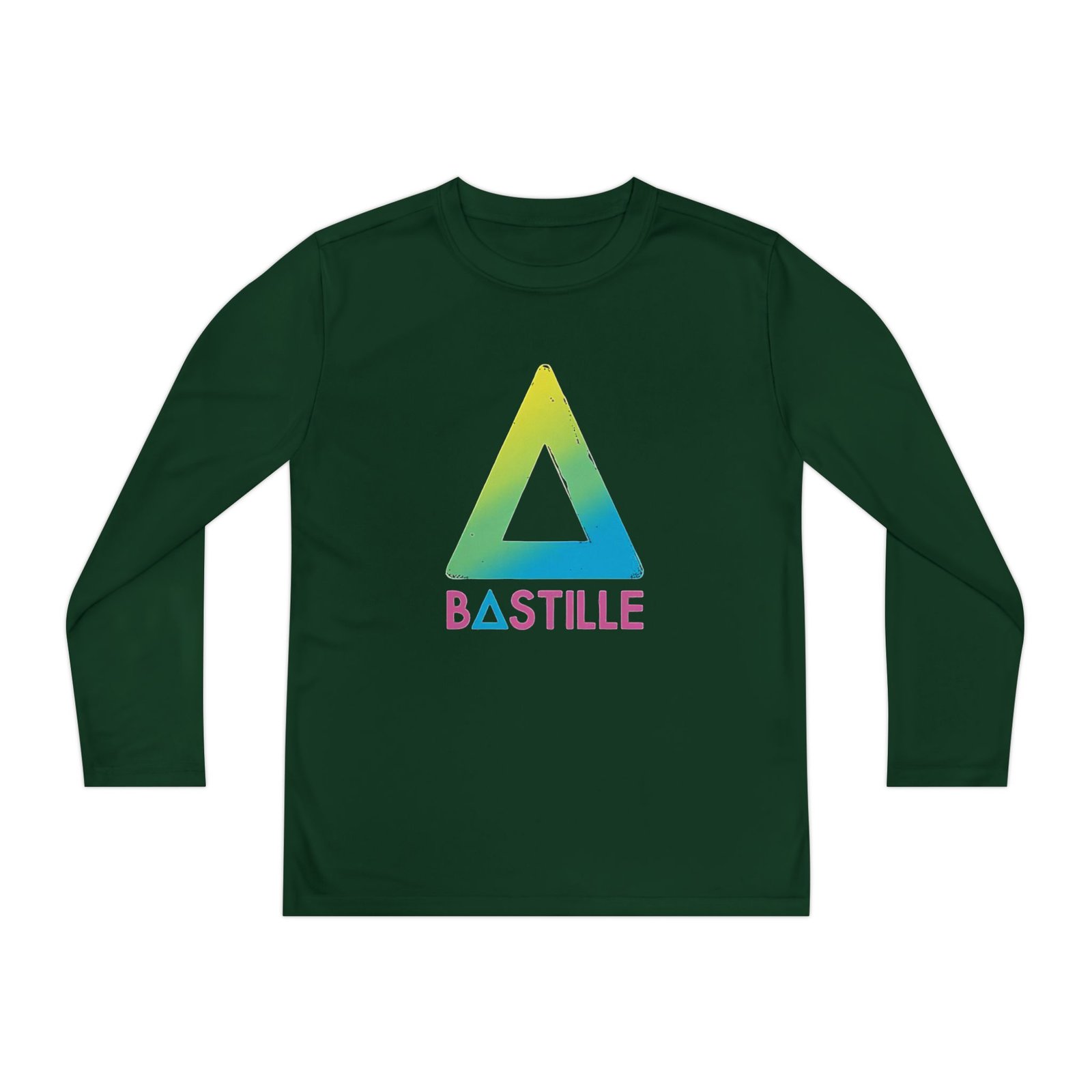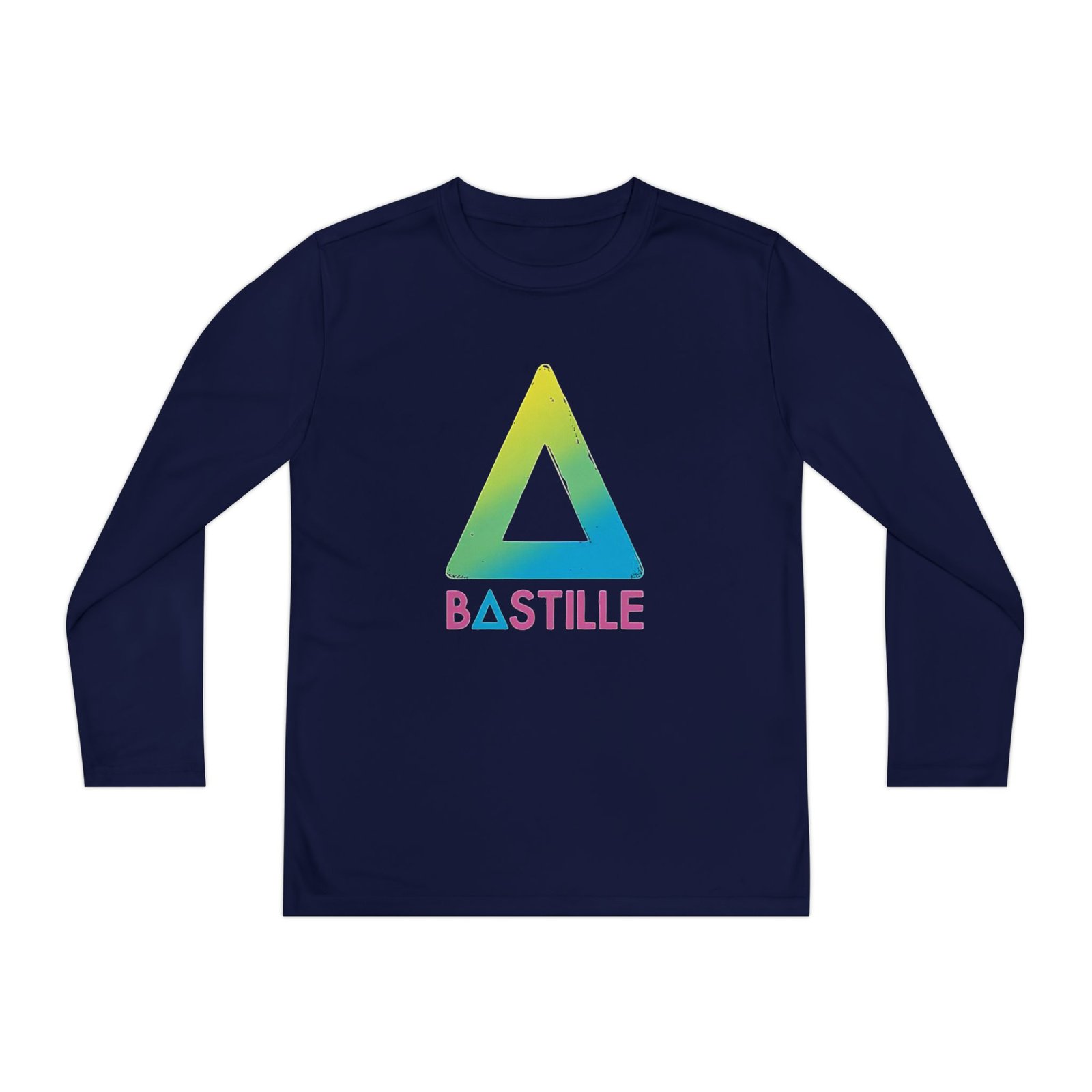 A lightweight Bastille Rainbow Logo long-sleeve designed for active kids who lean into darker, atmospheric style. The shirt’s smooth, moisture-wicking polyester keeps movement unhindered and dries fast after practice or a day outside. The front art drops into a stormy, grayscale scene crowned by a jagged flash of lightning and moody gothic lettering — a bold, quietly rebellious statement that pairs with skate nights, band practice, or just hanging with friends. The athletic cut skims the body for an energetic silhouette, while the tear-away label keeps comfort high. Warmth is balanced with breathability, so it layers easily under a jacket or wears solo on cooler evenings.
