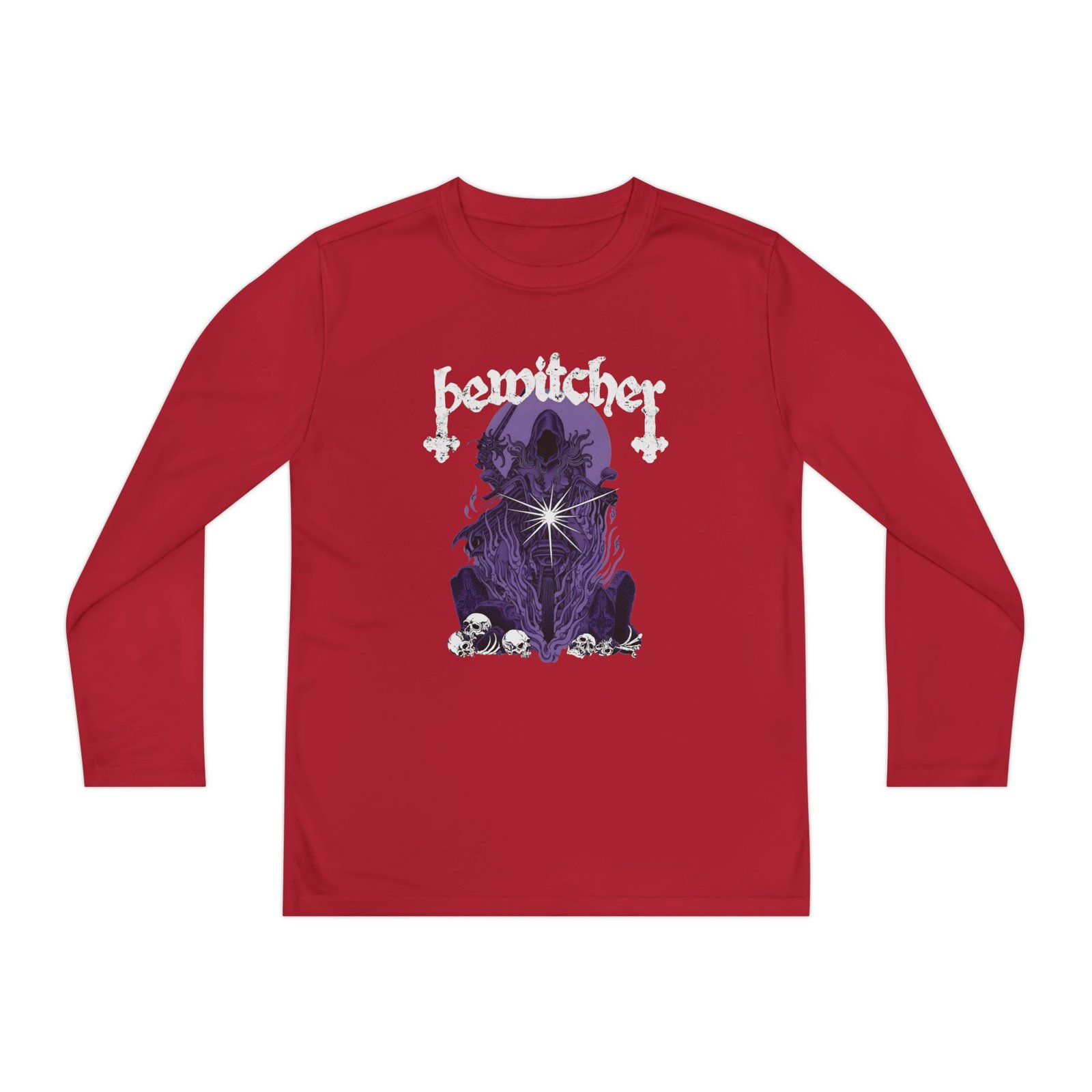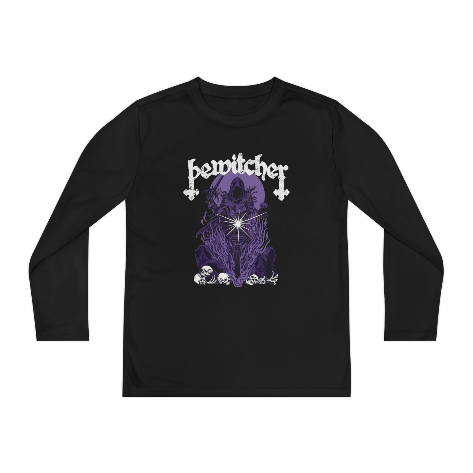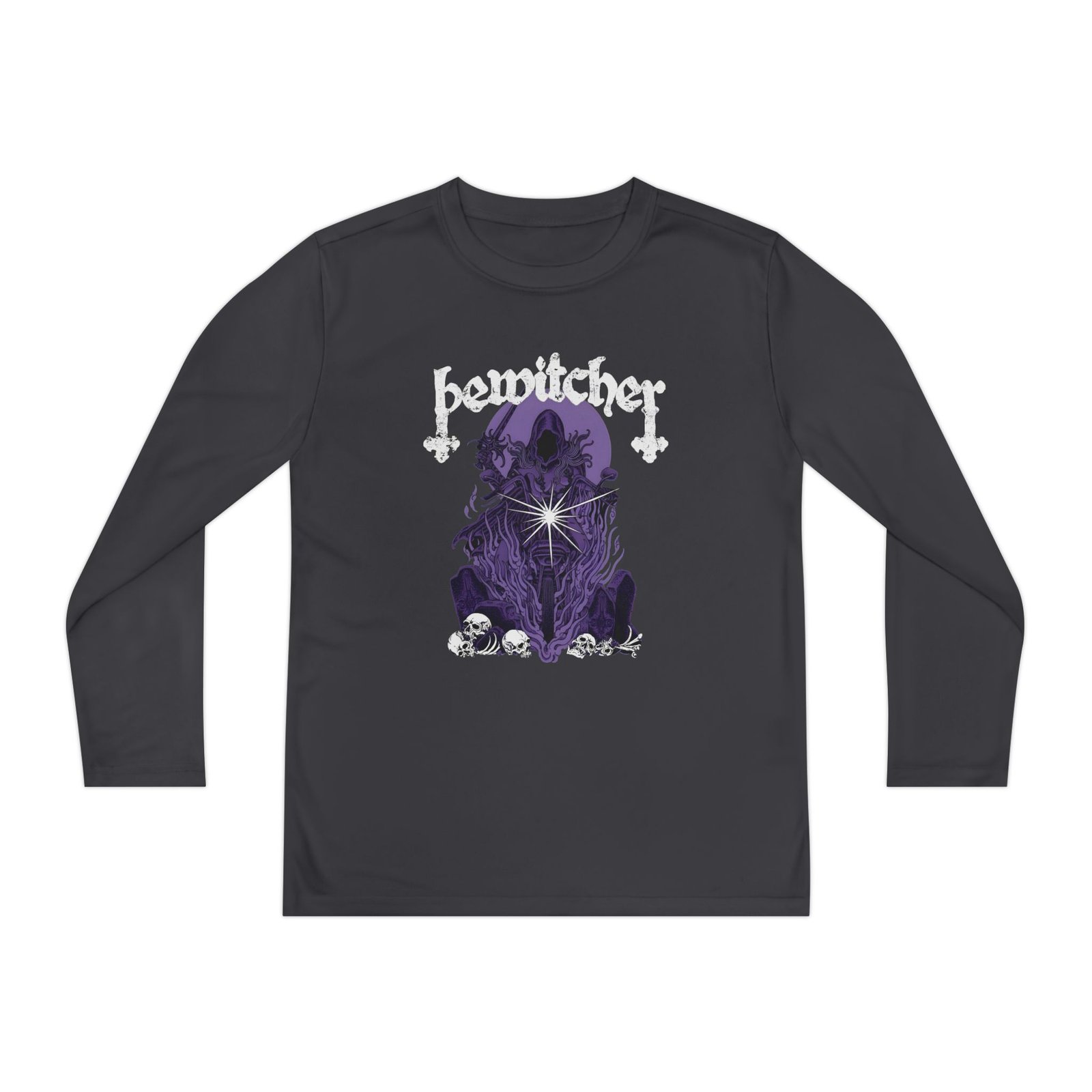 A lightweight Bewitcher Spell Shock long-sleeve designed for active kids who lean into darker, atmospheric style. The shirt’s smooth, moisture-wicking polyester keeps movement unhindered and dries fast after practice or a day outside. The front art drops into a stormy, grayscale scene crowned by a jagged flash of lightning and moody gothic lettering — a bold, quietly rebellious statement that pairs with skate nights, band practice, or just hanging with friends. The athletic cut skims the body for an energetic silhouette, while the tear-away label keeps comfort high. Warmth is balanced with breathability, so it layers easily under a jacket or wears solo on cooler evenings.