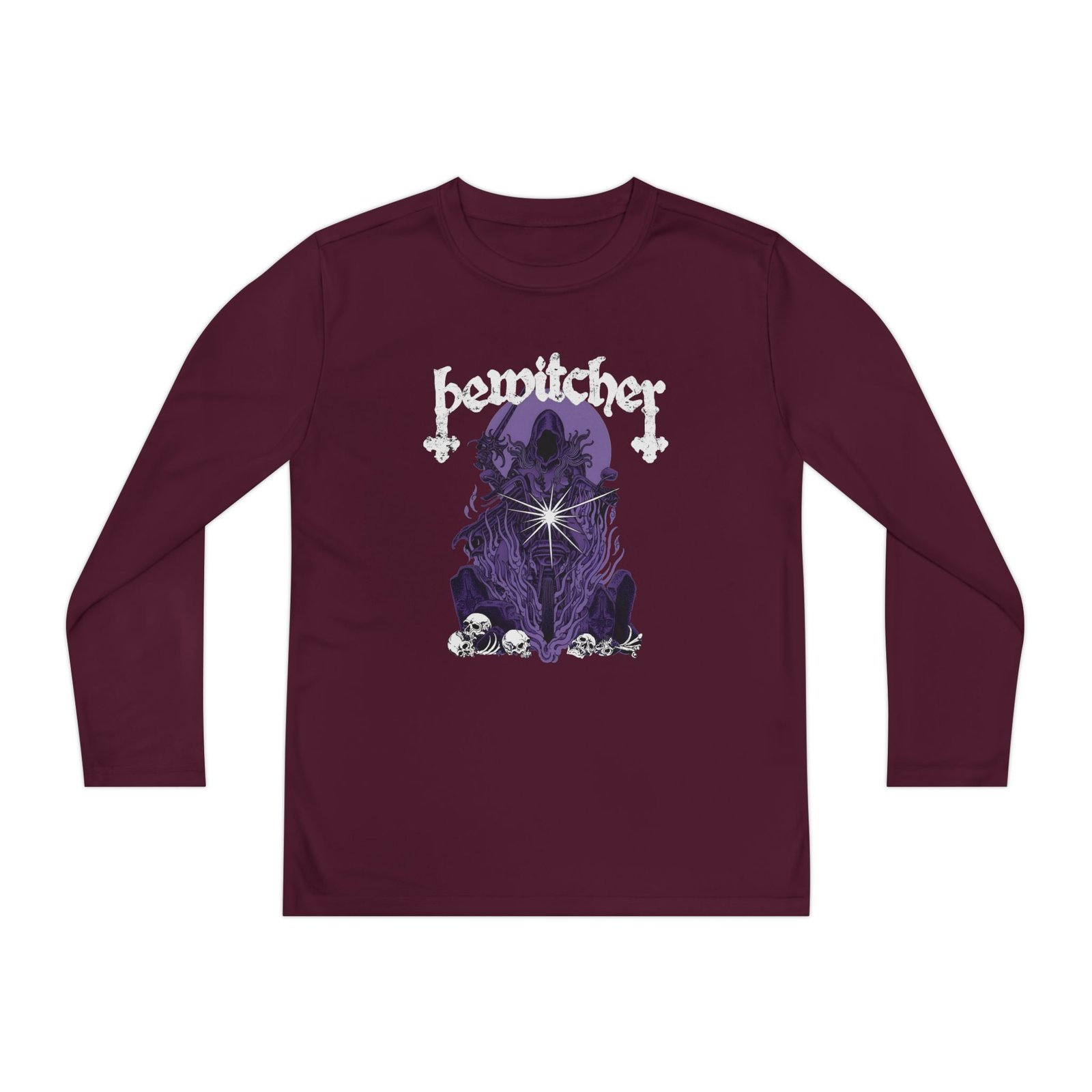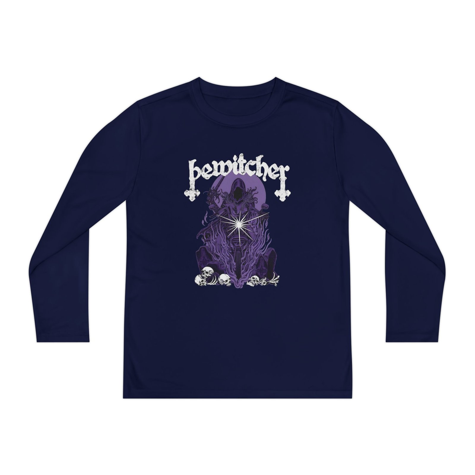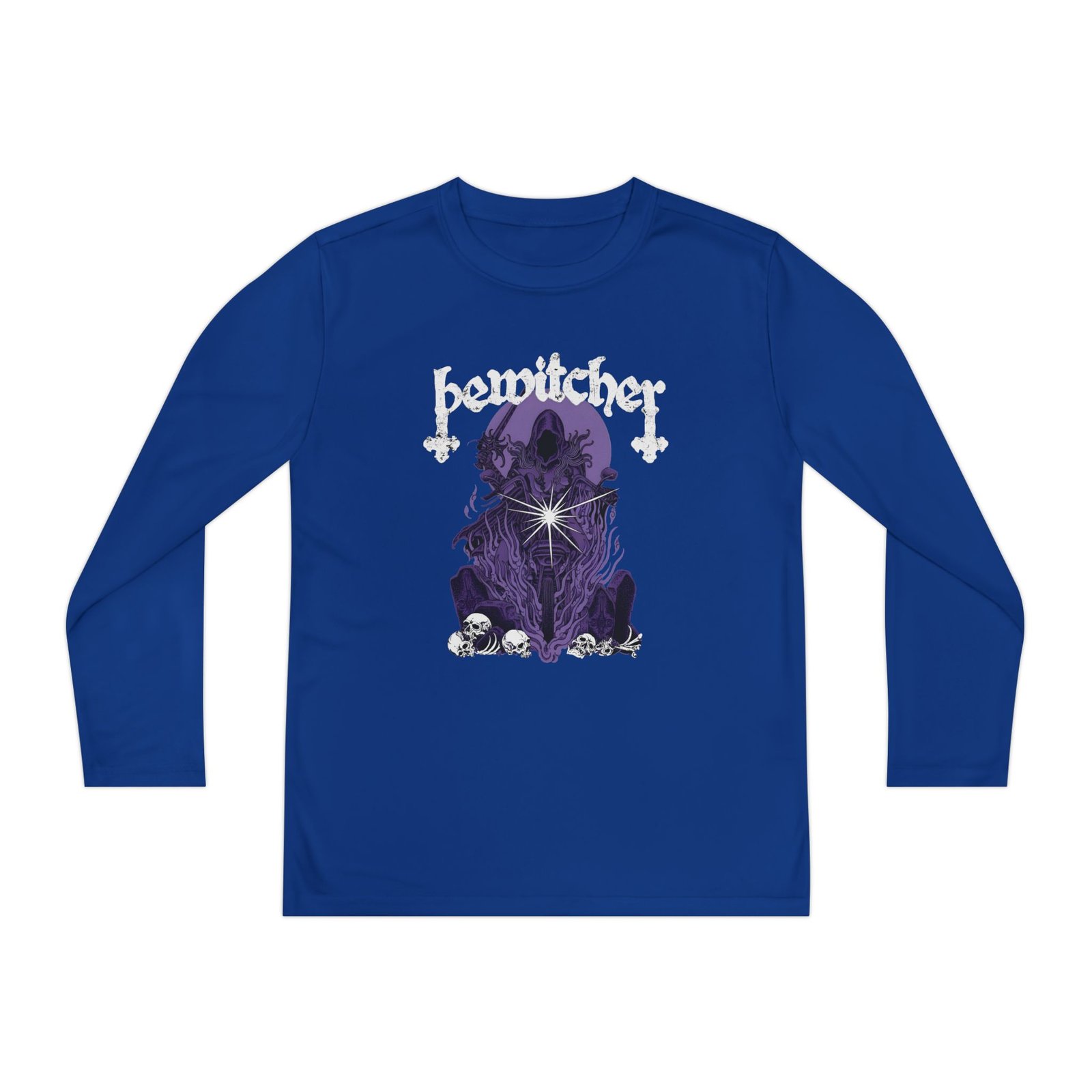 A lightweight Bewitcher Spell Shock long-sleeve designed for active kids who lean into darker, atmospheric style. The shirt’s smooth, moisture-wicking polyester keeps movement unhindered and dries fast after practice or a day outside. The front art drops into a stormy, grayscale scene crowned by a jagged flash of lightning and moody gothic lettering — a bold, quietly rebellious statement that pairs with skate nights, band practice, or just hanging with friends. The athletic cut skims the body for an energetic silhouette, while the tear-away label keeps comfort high. Warmth is balanced with breathability, so it layers easily under a jacket or wears solo on cooler evenings.