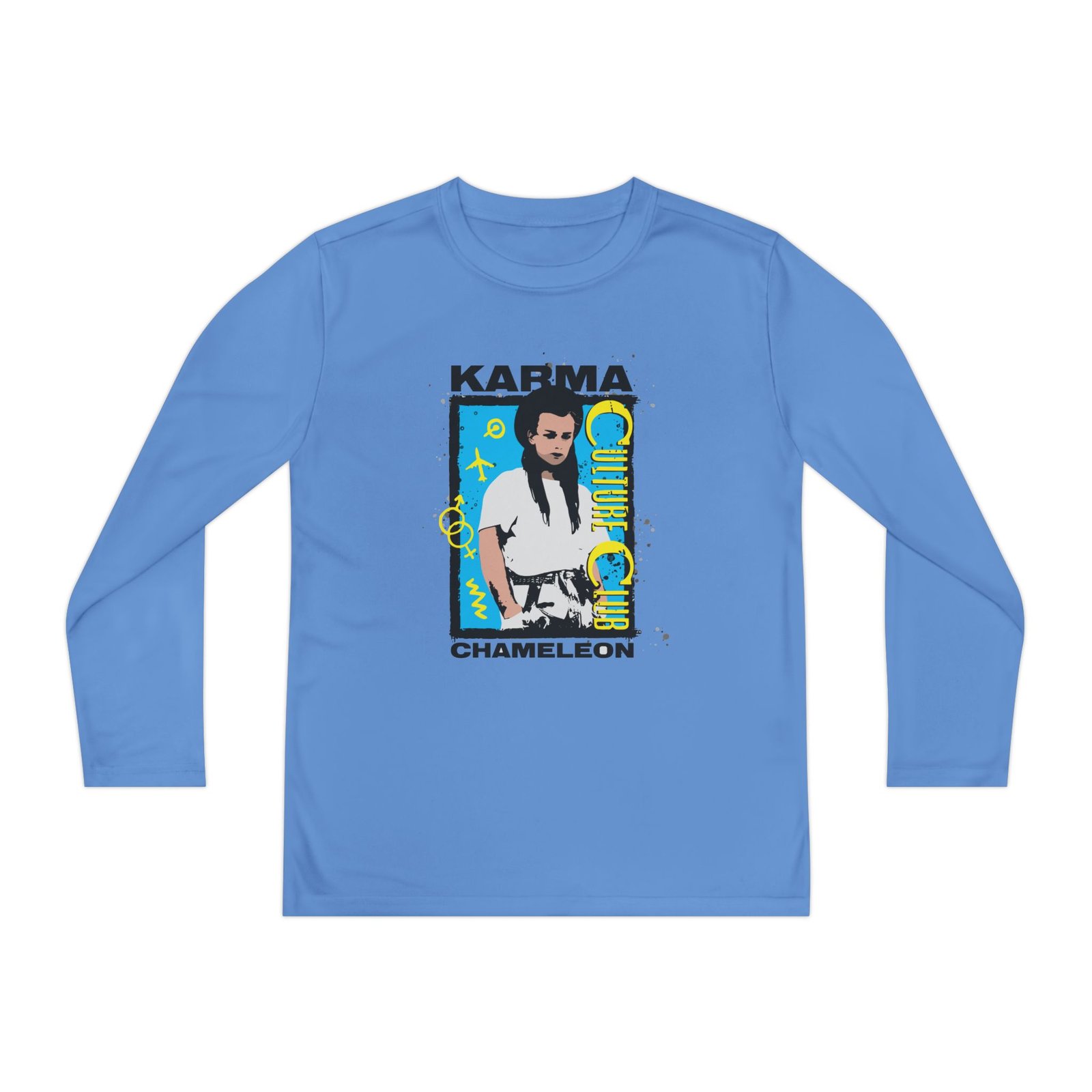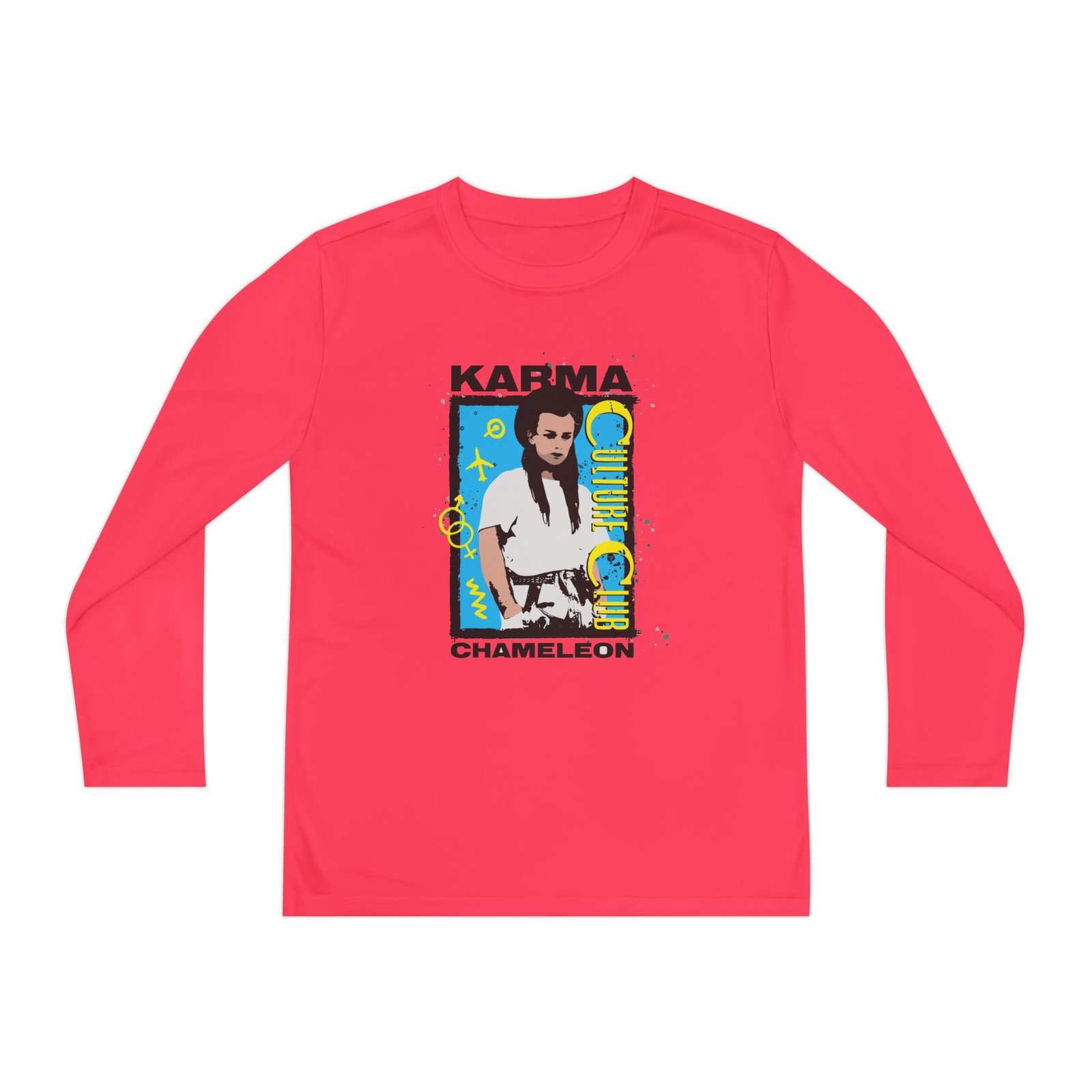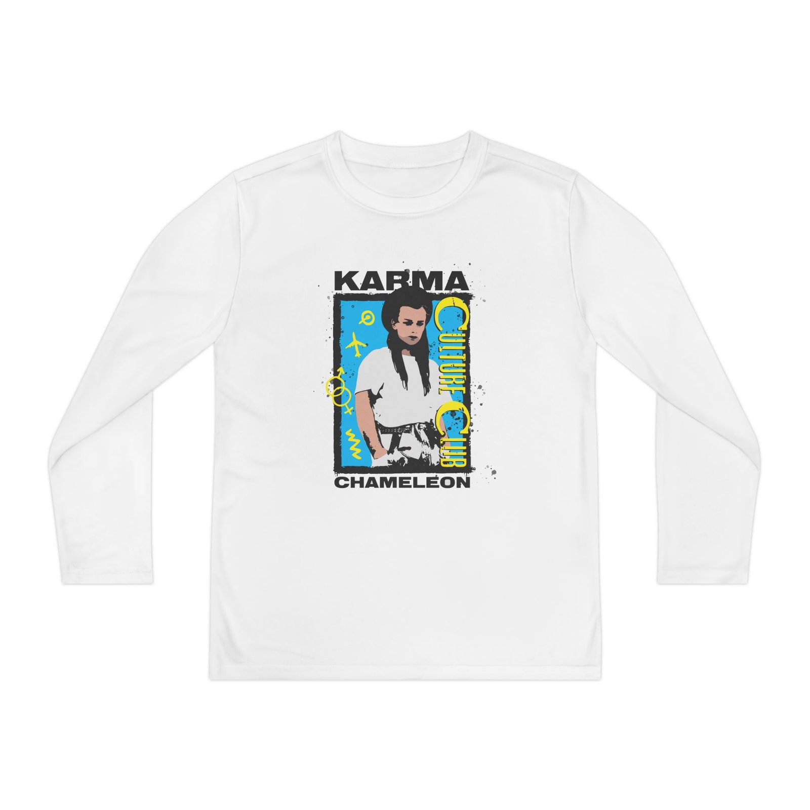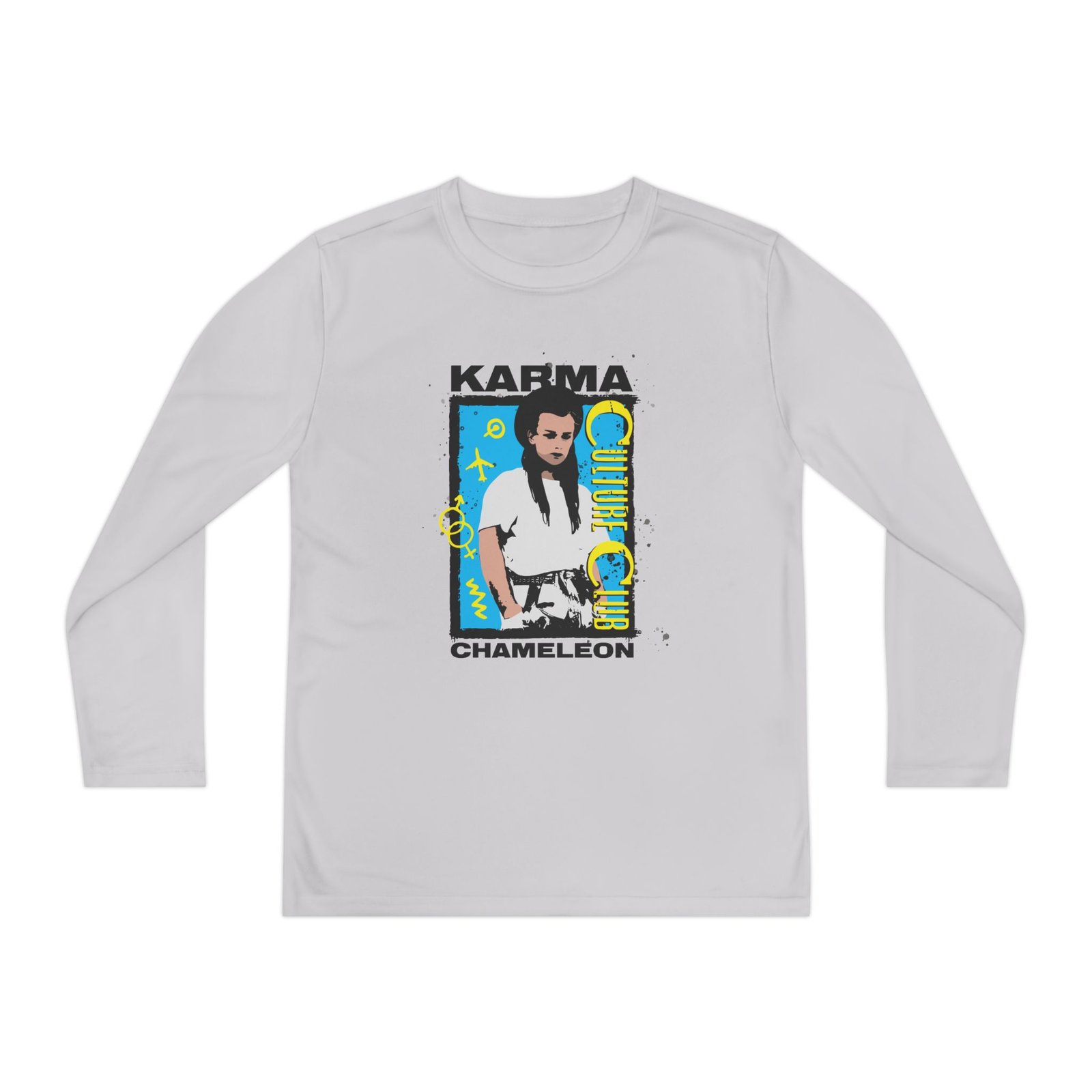 A lightweight Boy George Karma Chameleon 40th Anniversary long-sleeve designed for active kids who lean into darker, atmospheric style. The shirt’s smooth, moisture-wicking polyester keeps movement unhindered and dries fast after practice or a day outside. The front art drops into a stormy, grayscale scene crowned by a jagged flash of lightning and moody gothic lettering — a bold, quietly rebellious statement that pairs with skate nights, band practice, or just hanging with friends. The athletic cut skims the body for an energetic silhouette, while the tear-away label keeps comfort high. Warmth is balanced with breathability, so it layers easily under a jacket or wears solo on cooler evenings.