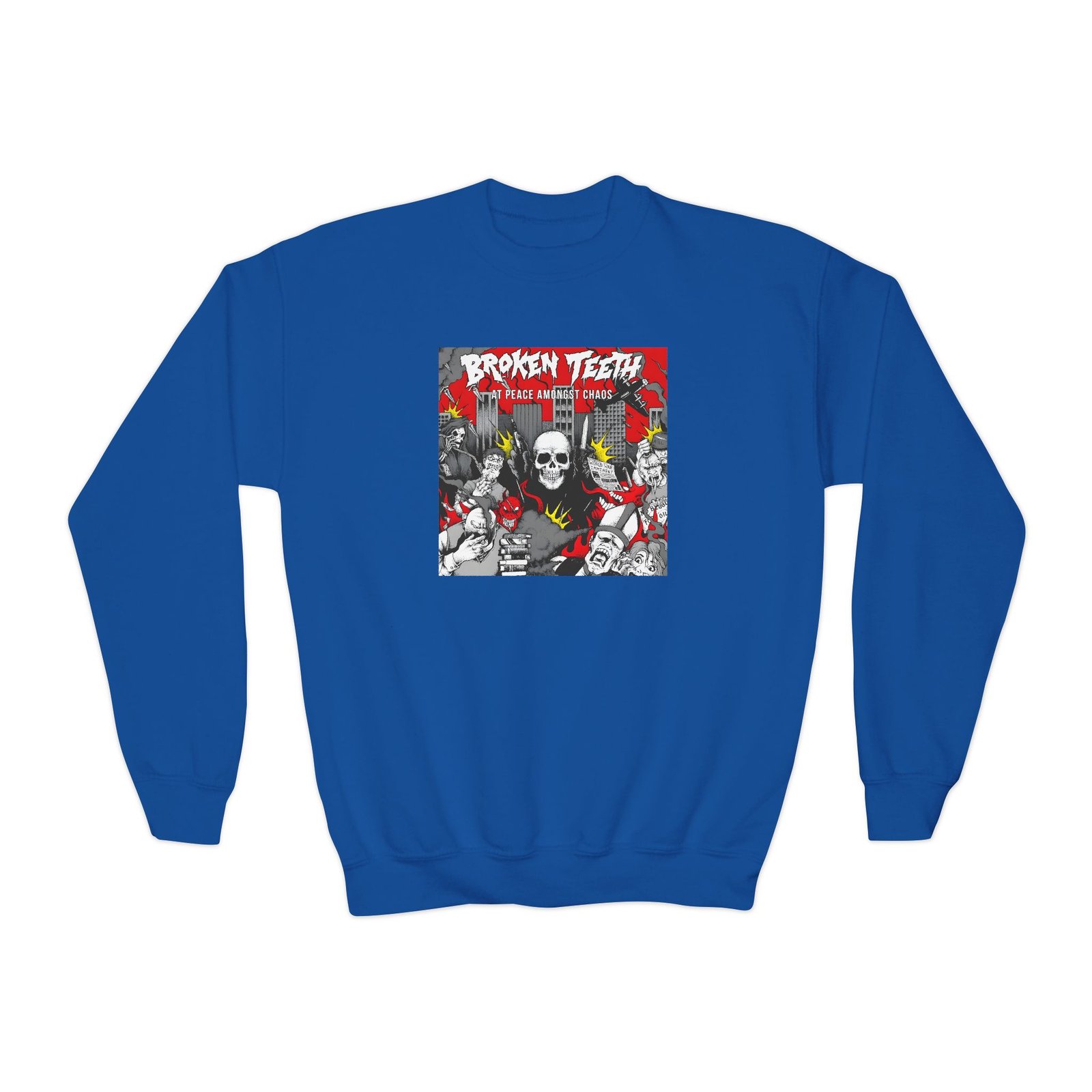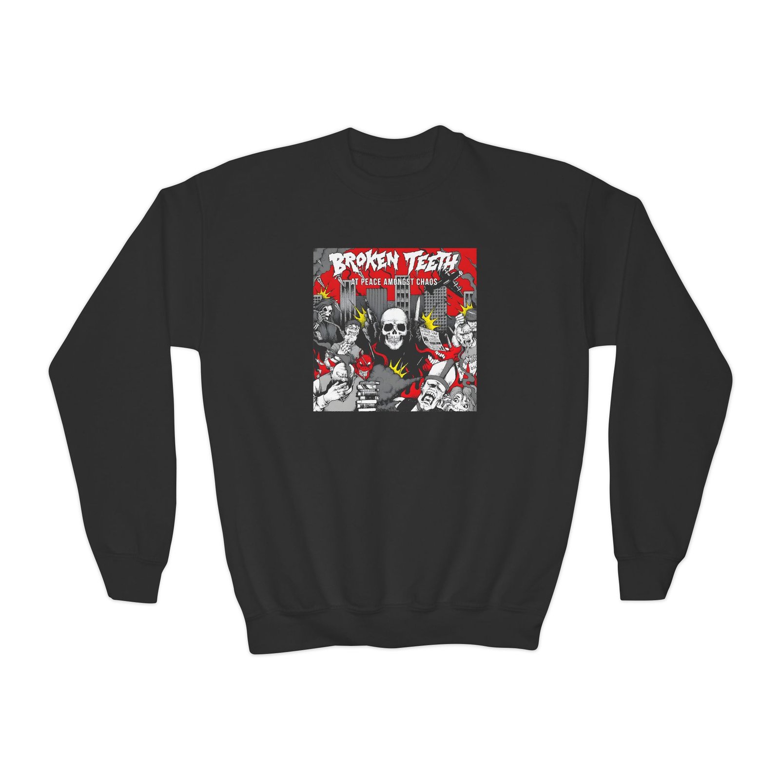 This loose-fit youth Broken Teeth at Peace Amongst Chaos crewneck brings moody, occult-inspired style to everyday wear. A storm-lit silhouette and grainy, moonlit scene sit beneath hand-lettered gothic text in bruised purple — a look that reads like a midnight zine spread. The sweatshirt’s medium-heavy knit feels substantial without weighing down small frames, and the ribbed collar and cuffs hold their shape through play and repeat washes. Let this crew be the quiet centerpiece of a darker wardrobe: layered over band tees, hoodies, or under a denim jacket for a city-night vibe that leans mysterious and made-for-exploring.
