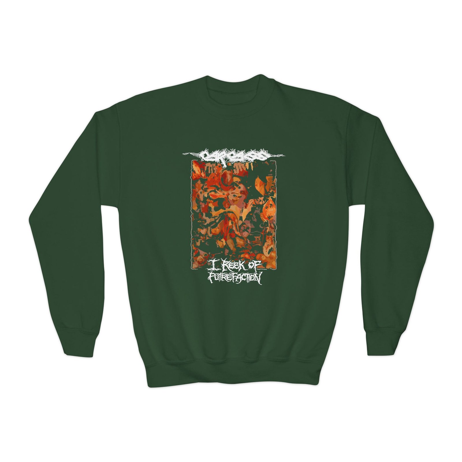 This loose-fit youth Carcass crewneck brings moody, occult-inspired style to everyday wear. A storm-lit silhouette and grainy, moonlit scene sit beneath hand-lettered gothic text in bruised purple — a look that reads like a midnight zine spread. The sweatshirt’s medium-heavy knit feels substantial without weighing down small frames, and the ribbed collar and cuffs hold their shape through play and repeat washes. Let this crew be the quiet centerpiece of a darker wardrobe: layered over band tees, hoodies, or under a denim jacket for a city-night vibe that leans mysterious and made-for-exploring.
