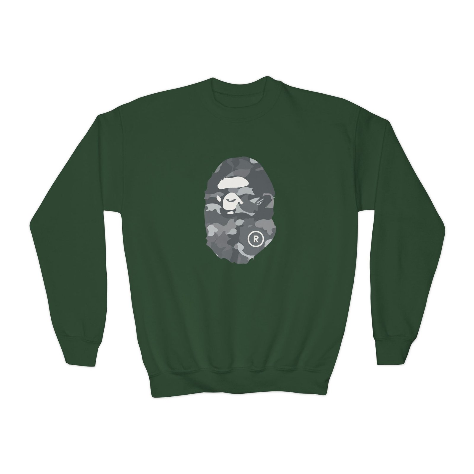 This loose-fit youth Corey Scherer Bathing Ape Camo Mirror Big Logo crewneck brings moody, occult-inspired style to everyday wear. A storm-lit silhouette and grainy, moonlit scene sit beneath hand-lettered gothic text in bruised purple — a look that reads like a midnight zine spread. The sweatshirt’s medium-heavy knit feels substantial without weighing down small frames, and the ribbed collar and cuffs hold their shape through play and repeat washes. Let this crew be the quiet centerpiece of a darker wardrobe: layered over band tees, hoodies, or under a denim jacket for a city-night vibe that leans mysterious and made-for-exploring.
