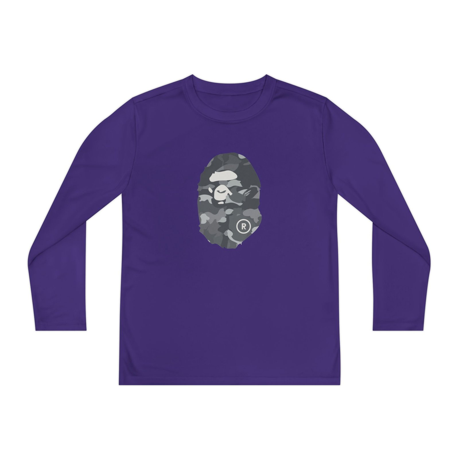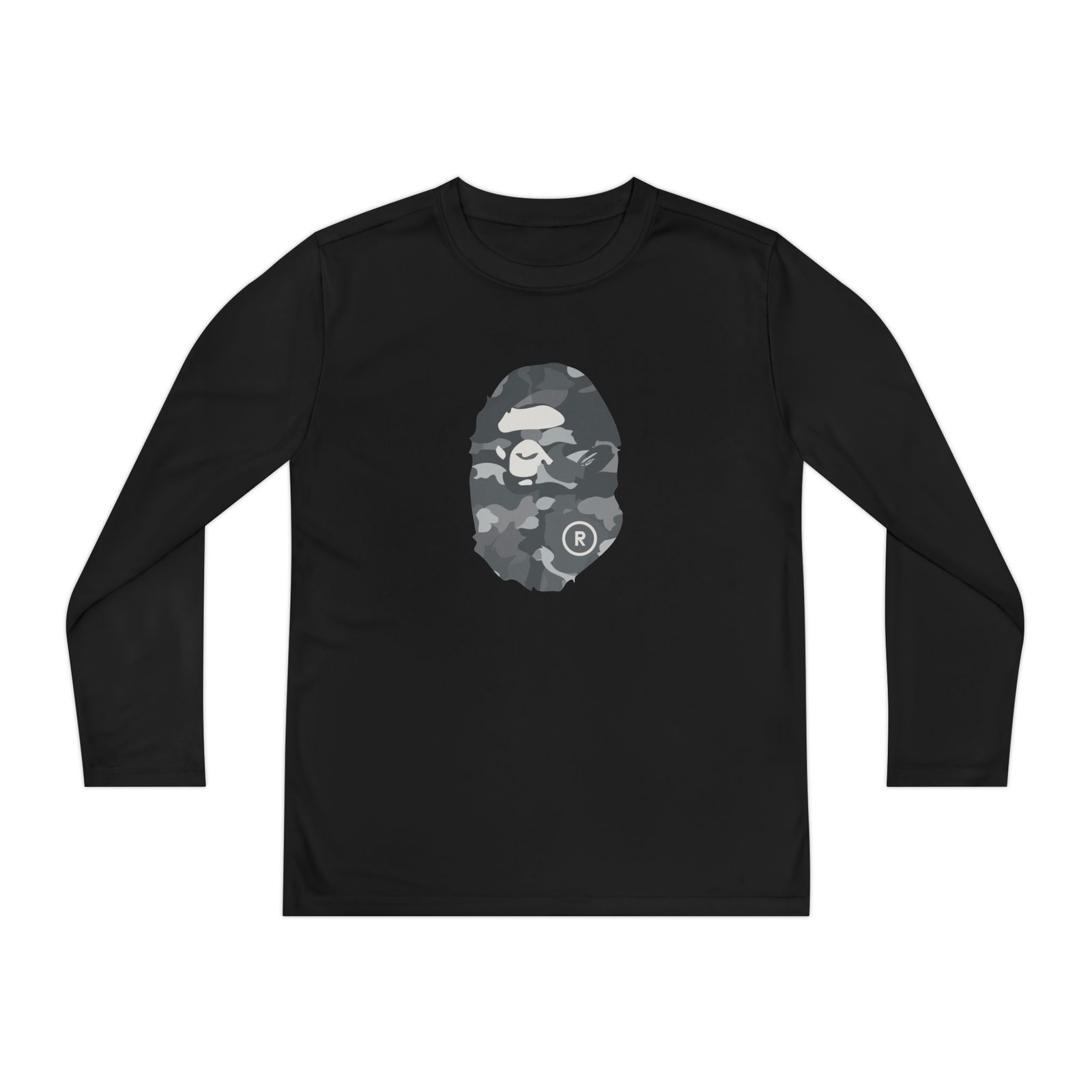 A lightweight Corey Scherer Bathing Ape Camo Mirror Big Logo long-sleeve designed for active kids who lean into darker, atmospheric style. The shirt’s smooth, moisture-wicking polyester keeps movement unhindered and dries fast after practice or a day outside. The front art drops into a stormy, grayscale scene crowned by a jagged flash of lightning and moody gothic lettering — a bold, quietly rebellious statement that pairs with skate nights, band practice, or just hanging with friends. The athletic cut skims the body for an energetic silhouette, while the tear-away label keeps comfort high. Warmth is balanced with breathability, so it layers easily under a jacket or wears solo on cooler evenings.