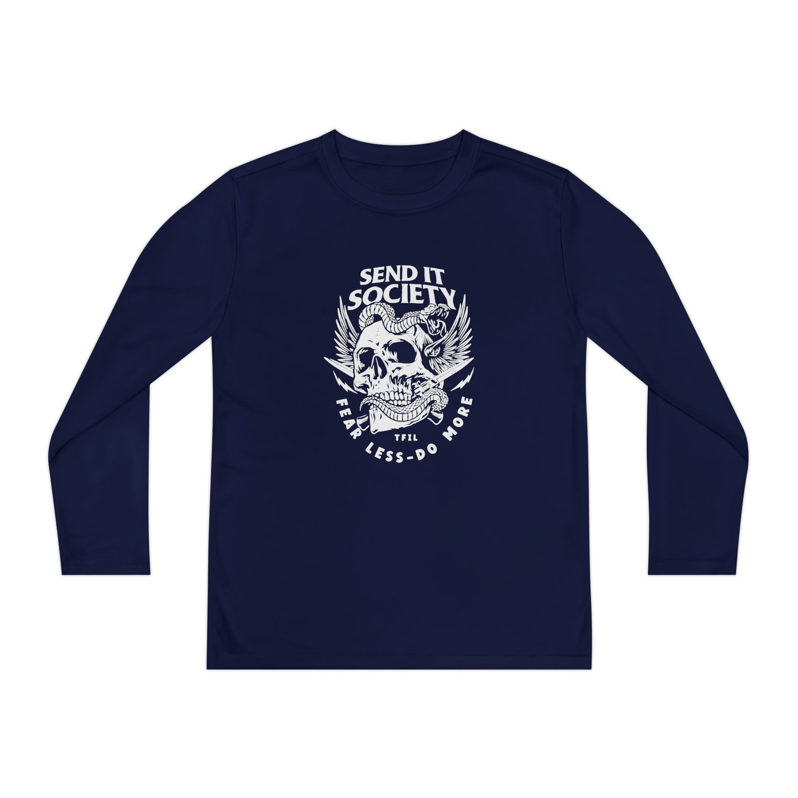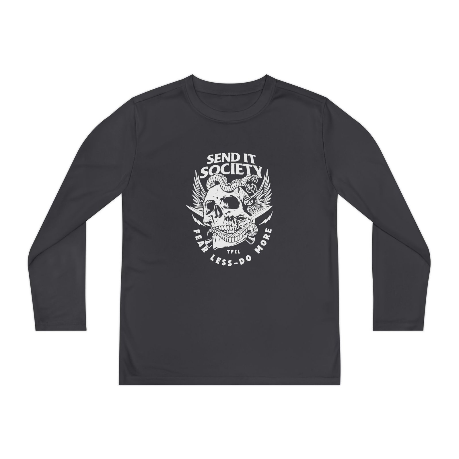 A lightweight Corey Scherer Send It Society long-sleeve designed for active kids who lean into darker, atmospheric style. The shirt’s smooth, moisture-wicking polyester keeps movement unhindered and dries fast after practice or a day outside. The front art drops into a stormy, grayscale scene crowned by a jagged flash of lightning and moody gothic lettering — a bold, quietly rebellious statement that pairs with skate nights, band practice, or just hanging with friends. The athletic cut skims the body for an energetic silhouette, while the tear-away label keeps comfort high. Warmth is balanced with breathability, so it layers easily under a jacket or wears solo on cooler evenings.