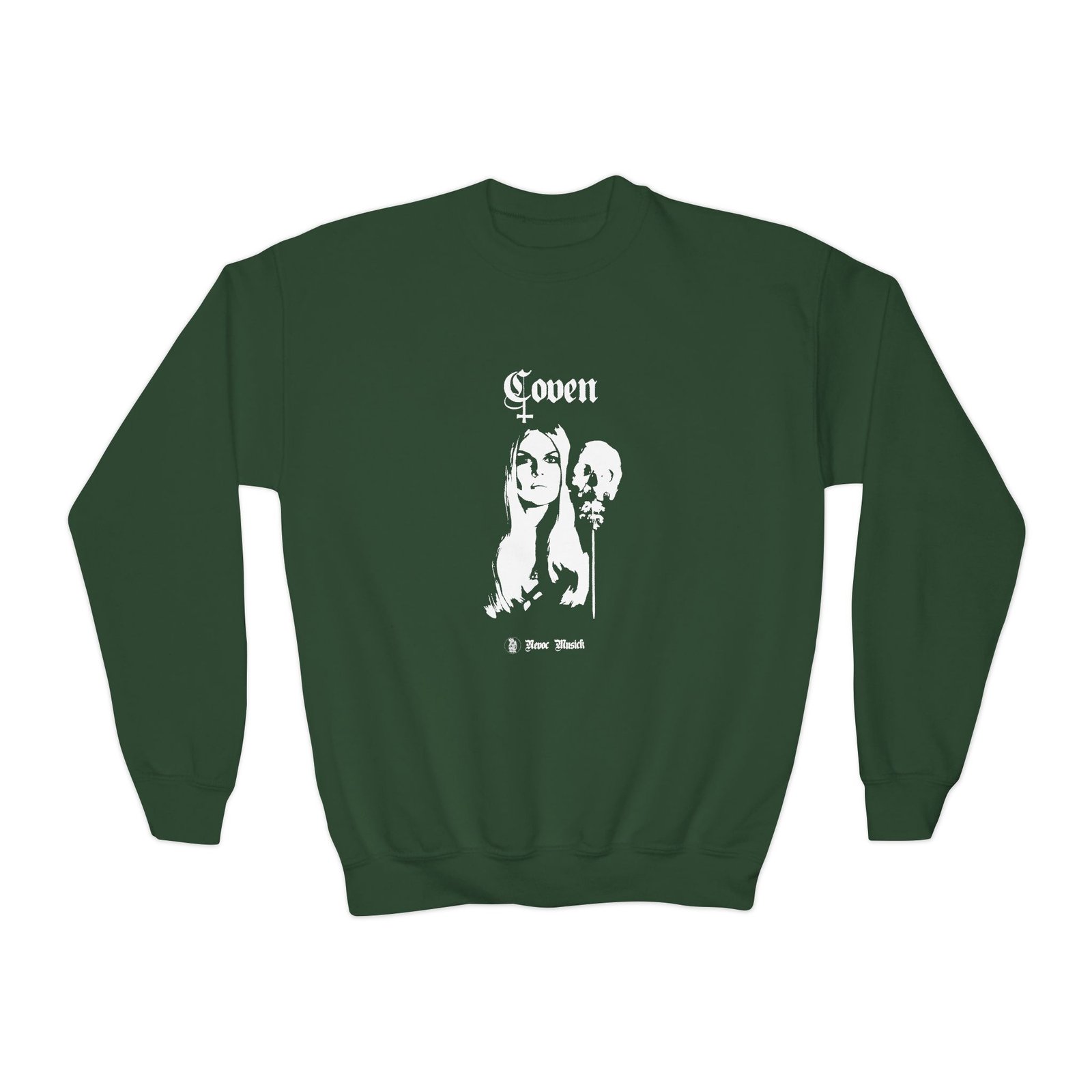 This loose-fit youth Coven crewneck brings moody, occult-inspired style to everyday wear. A storm-lit silhouette and grainy, moonlit scene sit beneath hand-lettered gothic text in bruised purple — a look that reads like a midnight zine spread. The sweatshirt’s medium-heavy knit feels substantial without weighing down small frames, and the ribbed collar and cuffs hold their shape through play and repeat washes. Let this crew be the quiet centerpiece of a darker wardrobe: layered over band tees, hoodies, or under a denim jacket for a city-night vibe that leans mysterious and made-for-exploring.