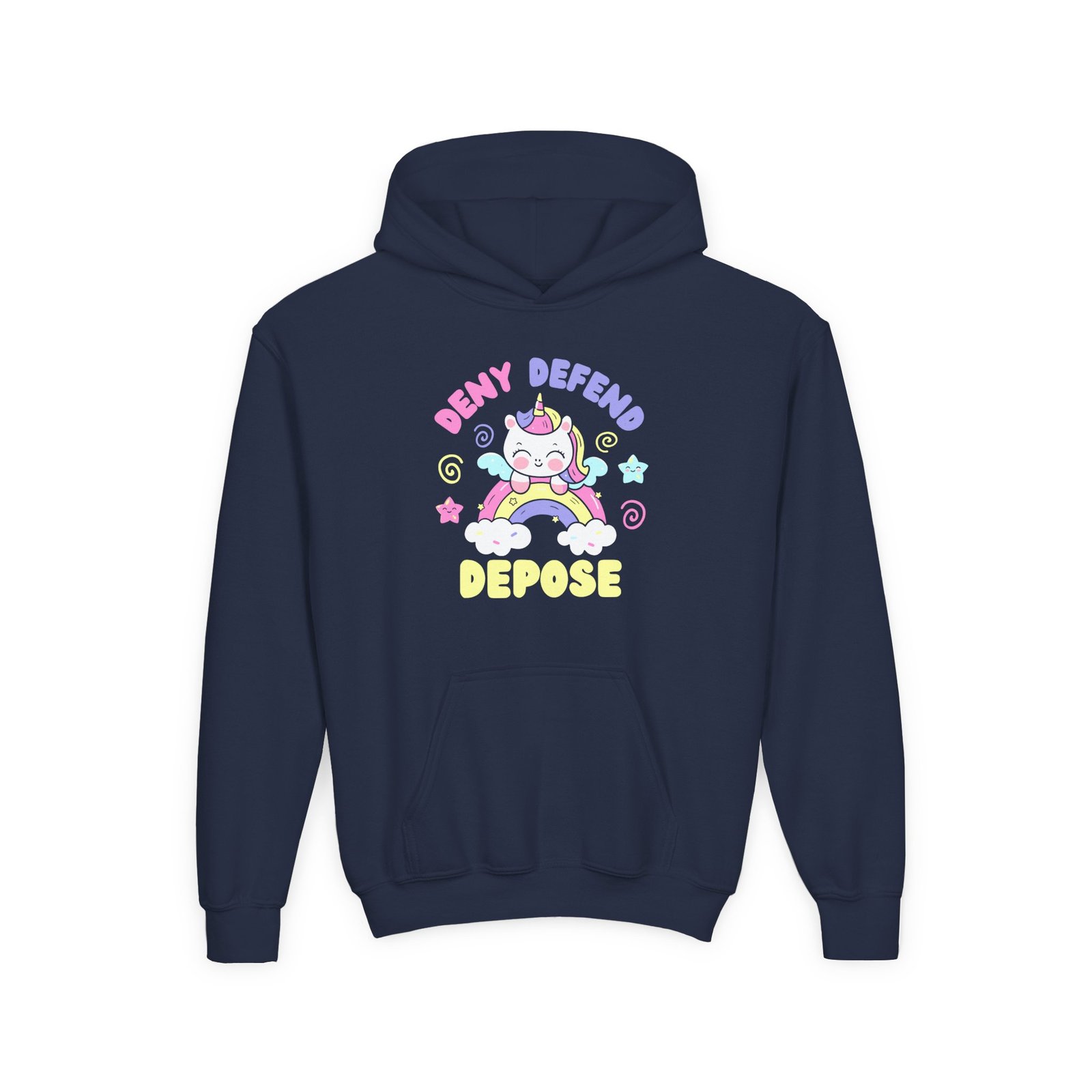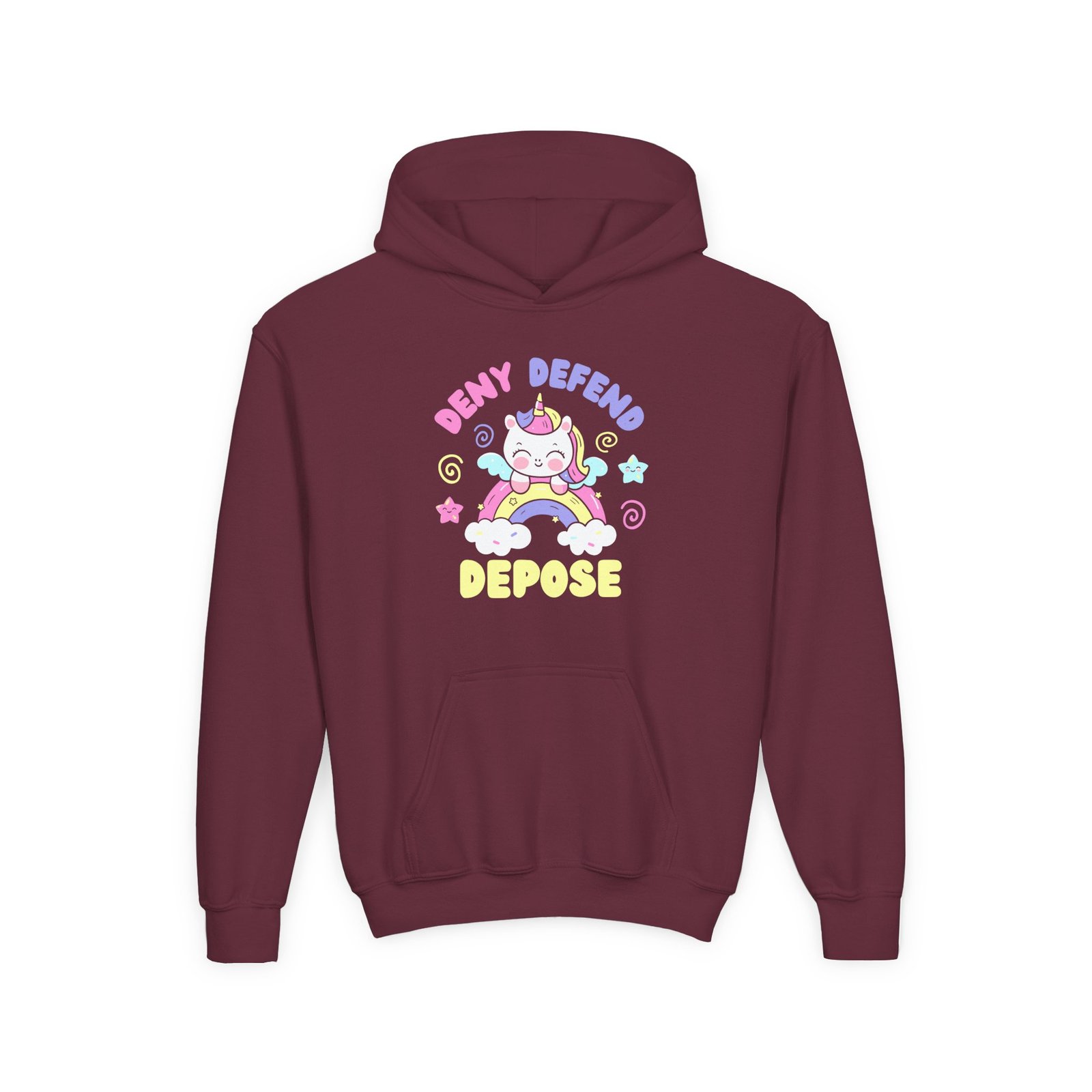 Soft, comfy, and a little bit mischievous — this youth Deny Defend Depose hoodie brings bright, playful energy to everyday wear. A drippy gradient smiley sits on the chest in neon orange-to-pink, framed by bold lettering that gives the design attitude without shouting. The midweight fabric holds its shape and keeps kids cozy through playground runs, chilly school mornings, and weekend hangouts. Thoughtful details like a roomy kangaroo pocket and twill neck tape make it durable and comfortable, while print and embroidery options let you add a custom touch. It’s the kind of hoodie that becomes a go-to for active days and casual adventures.