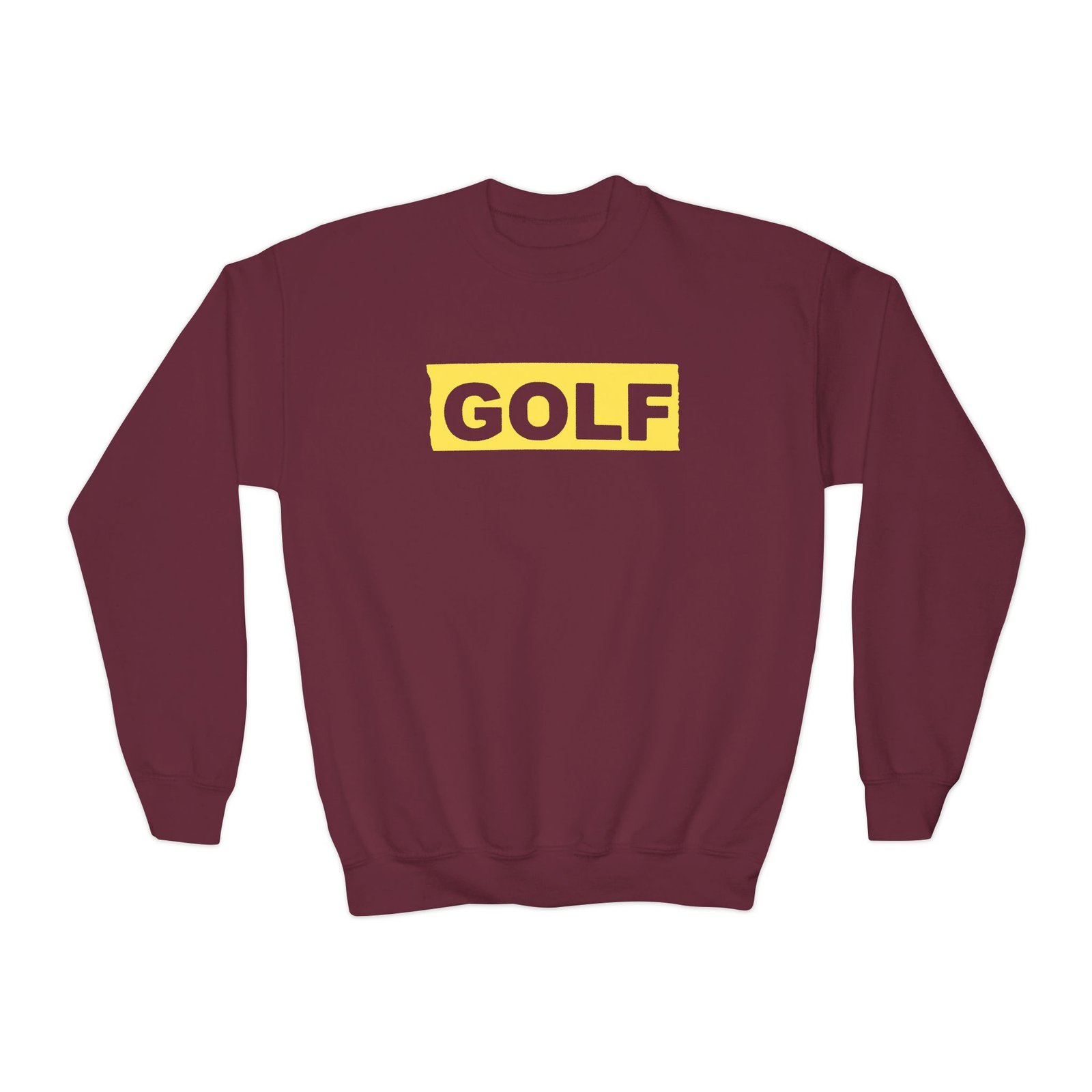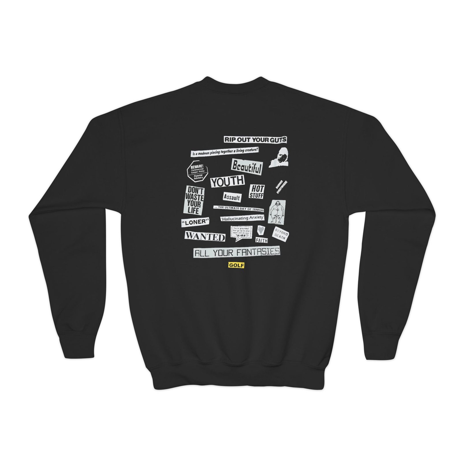 This loose-fit youth Golf crewneck brings moody, occult-inspired style to everyday wear. A storm-lit silhouette and grainy, moonlit scene sit beneath hand-lettered gothic text in bruised purple — a look that reads like a midnight zine spread. The sweatshirt’s medium-heavy knit feels substantial without weighing down small frames, and the ribbed collar and cuffs hold their shape through play and repeat washes. Let this crew be the quiet centerpiece of a darker wardrobe: layered over band tees, hoodies, or under a denim jacket for a city-night vibe that leans mysterious and made-for-exploring.