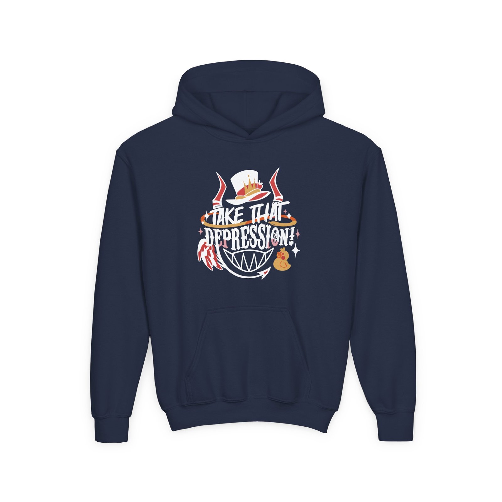 Soft, comfy, and a little bit mischievous — this youth Hazbin Hotel Take That Depression Quote hoodie brings bright, playful energy to everyday wear. A drippy gradient smiley sits on the chest in neon orange-to-pink, framed by bold lettering that gives the design attitude without shouting. The midweight fabric holds its shape and keeps kids cozy through playground runs, chilly school mornings, and weekend hangouts. Thoughtful details like a roomy kangaroo pocket and twill neck tape make it durable and comfortable, while print and embroidery options let you add a custom touch. It’s the kind of hoodie that becomes a go-to for active days and casual adventures.