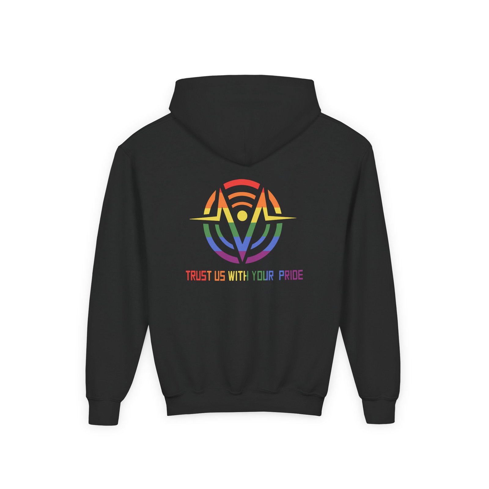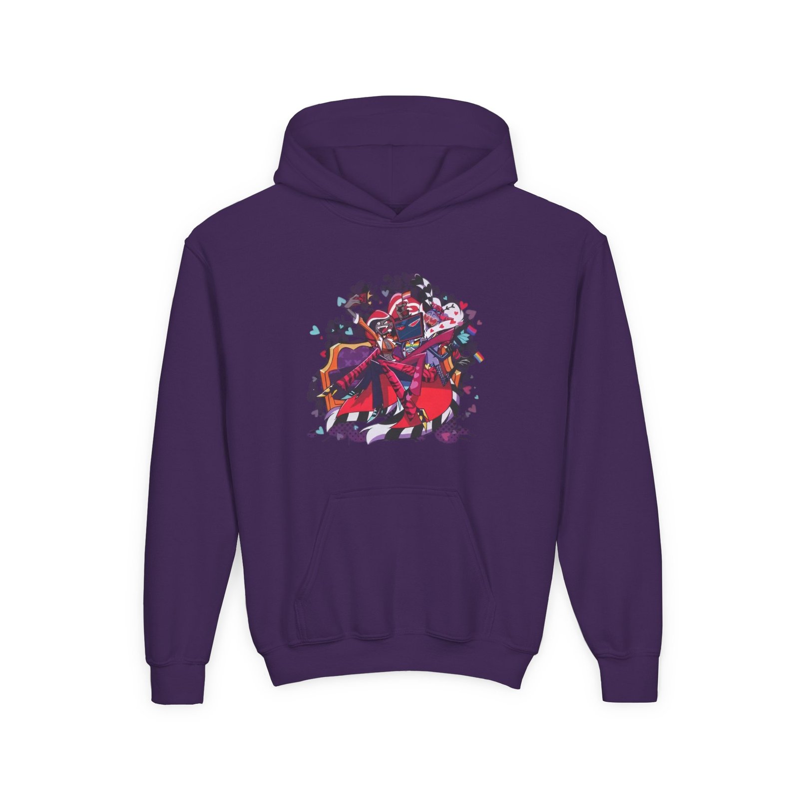Soft, comfy, and a little bit mischievous — this youth Hazbin Hotel the Vees Pride hoodie brings bright, playful energy to everyday wear. A drippy gradient smiley sits on the chest in neon orange-to-pink, framed by bold lettering that gives the design attitude without shouting. The midweight fabric holds its shape and keeps kids cozy through playground runs, chilly school mornings, and weekend hangouts. Thoughtful details like a roomy kangaroo pocket and twill neck tape make it durable and comfortable, while print and embroidery options let you add a custom touch. It’s the kind of hoodie that becomes a go-to for active days and casual adventures.