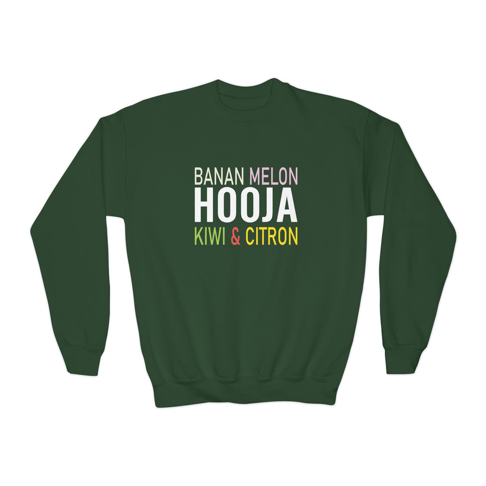 This loose-fit youth Hooja Banan Melon Kiwi & Citron crewneck brings moody, occult-inspired style to everyday wear. A storm-lit silhouette and grainy, moonlit scene sit beneath hand-lettered gothic text in bruised purple — a look that reads like a midnight zine spread. The sweatshirt’s medium-heavy knit feels substantial without weighing down small frames, and the ribbed collar and cuffs hold their shape through play and repeat washes. Let this crew be the quiet centerpiece of a darker wardrobe: layered over band tees, hoodies, or under a denim jacket for a city-night vibe that leans mysterious and made-for-exploring.