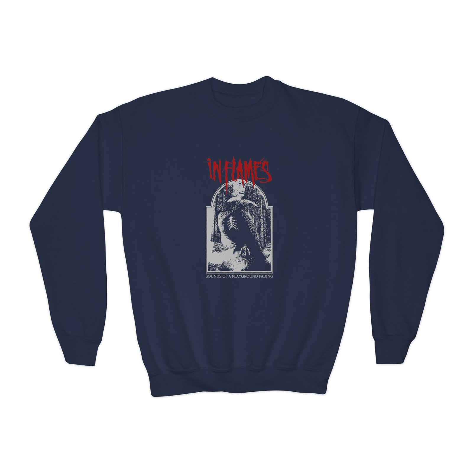 This loose-fit youth In Flames Sounds of a Playground Fading Reissue crewneck brings moody, occult-inspired style to everyday wear. A storm-lit silhouette and grainy, moonlit scene sit beneath hand-lettered gothic text in bruised purple — a look that reads like a midnight zine spread. The sweatshirt’s medium-heavy knit feels substantial without weighing down small frames, and the ribbed collar and cuffs hold their shape through play and repeat washes. Let this crew be the quiet centerpiece of a darker wardrobe: layered over band tees, hoodies, or under a denim jacket for a city-night vibe that leans mysterious and made-for-exploring.