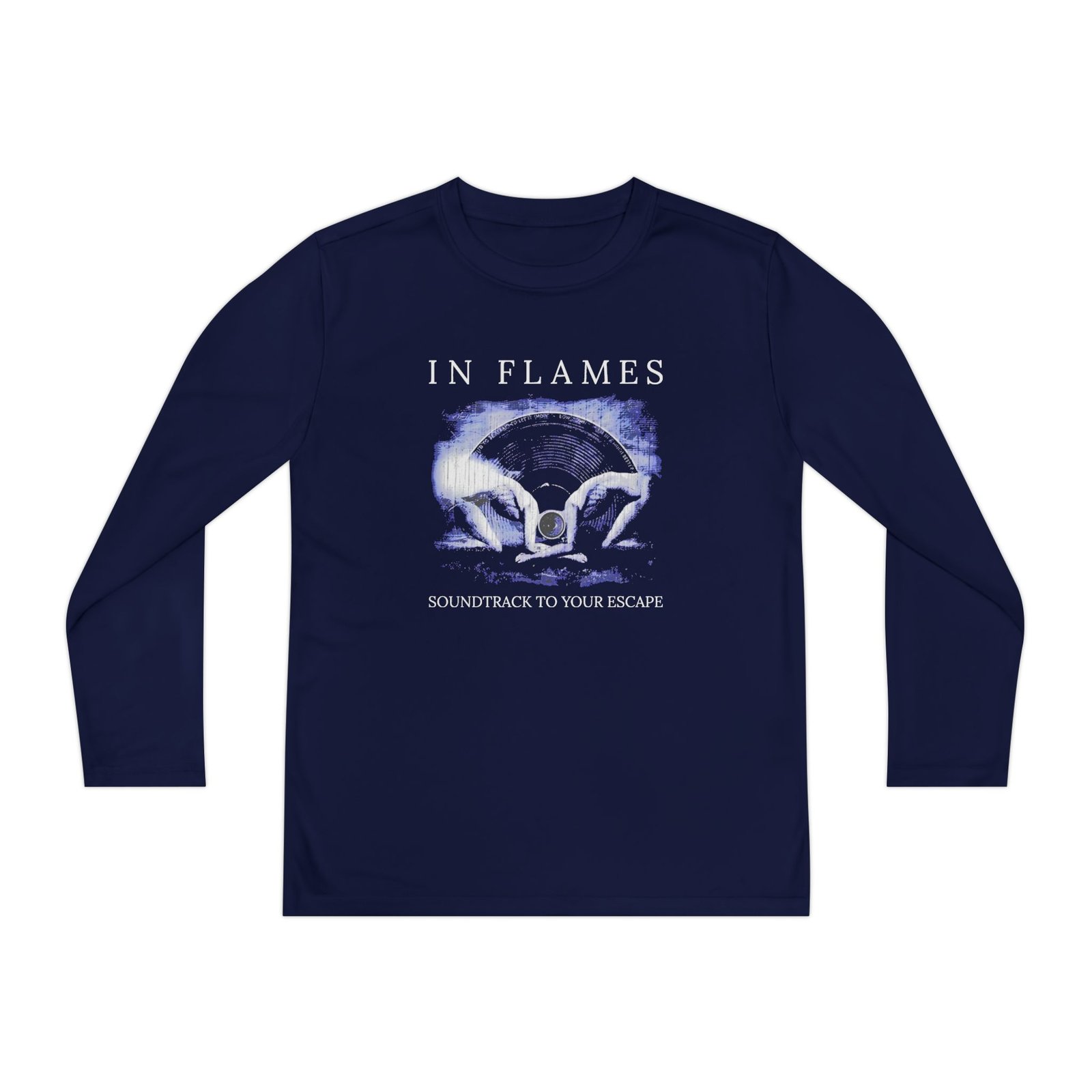 A lightweight In Flames Soundtrack to Your Escape long-sleeve designed for active kids who lean into darker, atmospheric style. The shirt’s smooth, moisture-wicking polyester keeps movement unhindered and dries fast after practice or a day outside. The front art drops into a stormy, grayscale scene crowned by a jagged flash of lightning and moody gothic lettering — a bold, quietly rebellious statement that pairs with skate nights, band practice, or just hanging with friends. The athletic cut skims the body for an energetic silhouette, while the tear-away label keeps comfort high. Warmth is balanced with breathability, so it layers easily under a jacket or wears solo on cooler evenings.
