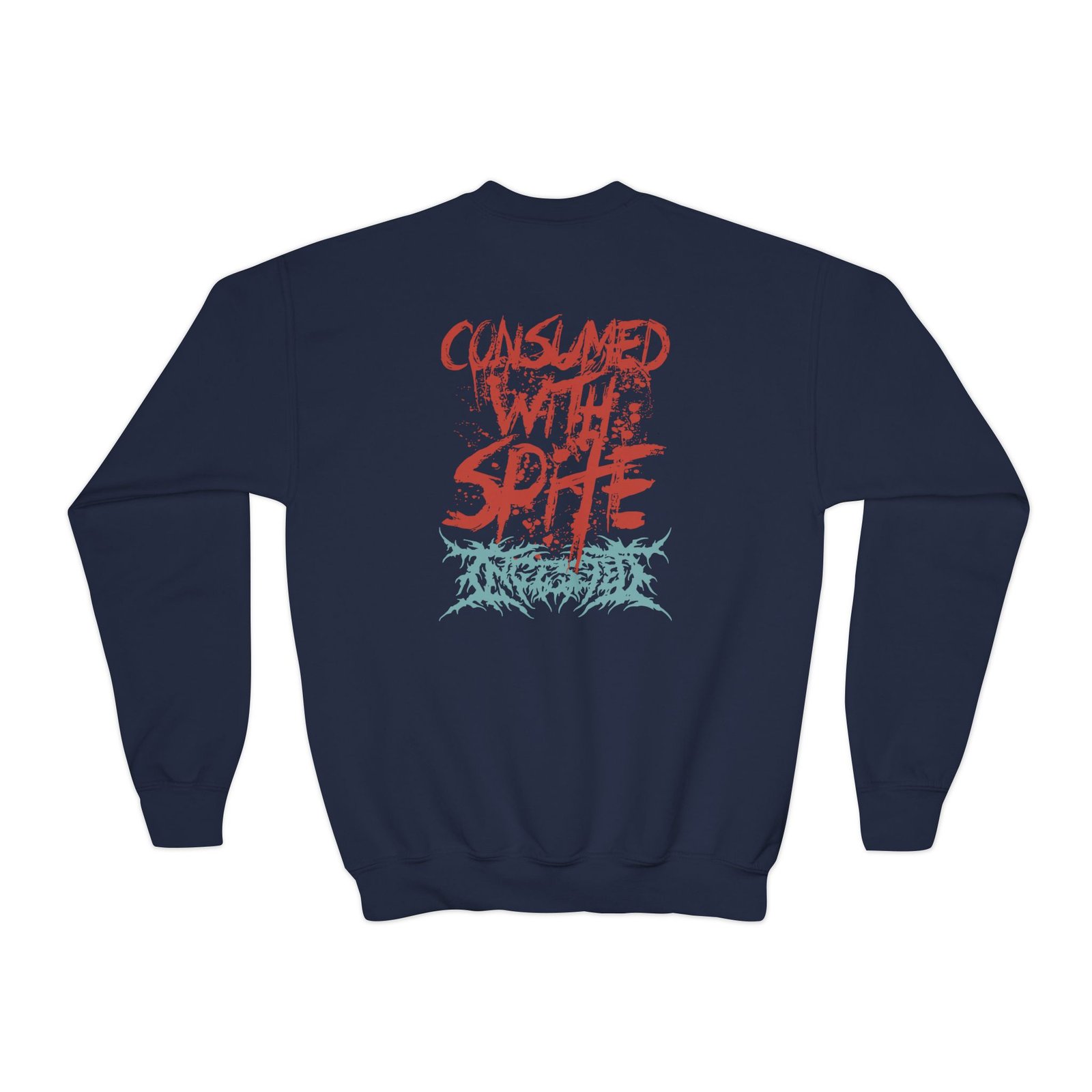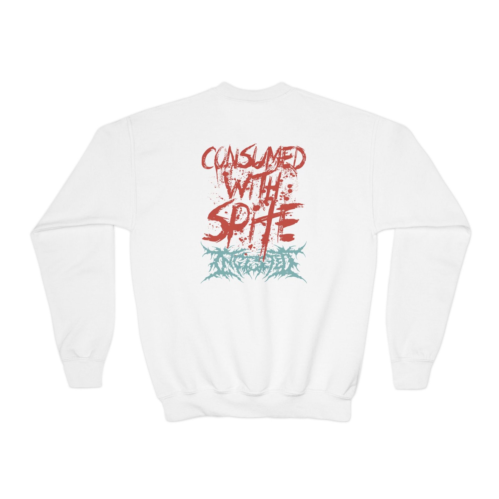 This loose-fit youth Ingested Consumed With Spite crewneck brings moody, occult-inspired style to everyday wear. A storm-lit silhouette and grainy, moonlit scene sit beneath hand-lettered gothic text in bruised purple — a look that reads like a midnight zine spread. The sweatshirt’s medium-heavy knit feels substantial without weighing down small frames, and the ribbed collar and cuffs hold their shape through play and repeat washes. Let this crew be the quiet centerpiece of a darker wardrobe: layered over band tees, hoodies, or under a denim jacket for a city-night vibe that leans mysterious and made-for-exploring.