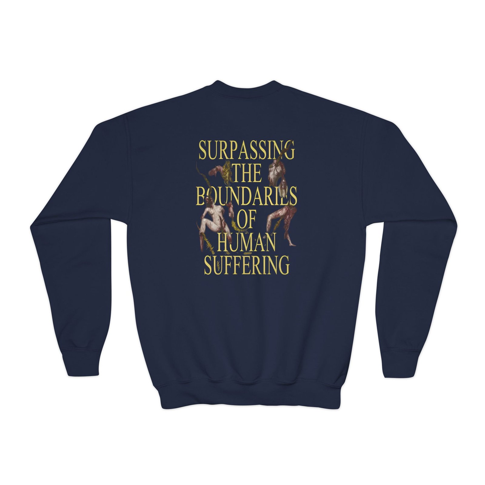 This loose-fit youth Ingested Surpassing the Boundaries crewneck brings moody, occult-inspired style to everyday wear. A storm-lit silhouette and grainy, moonlit scene sit beneath hand-lettered gothic text in bruised purple — a look that reads like a midnight zine spread. The sweatshirt’s medium-heavy knit feels substantial without weighing down small frames, and the ribbed collar and cuffs hold their shape through play and repeat washes. Let this crew be the quiet centerpiece of a darker wardrobe: layered over band tees, hoodies, or under a denim jacket for a city-night vibe that leans mysterious and made-for-exploring.